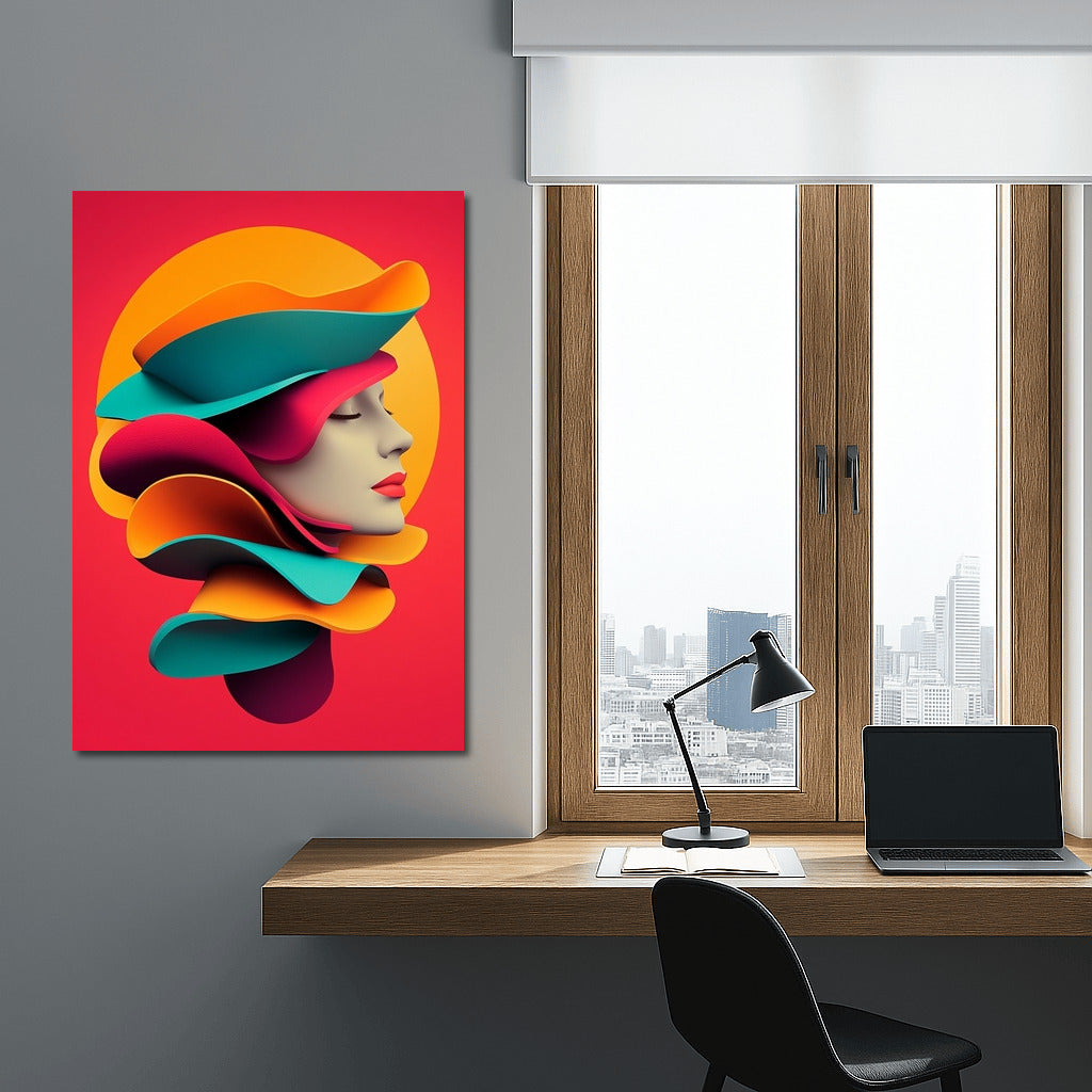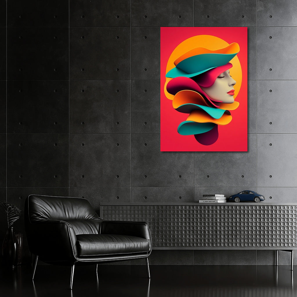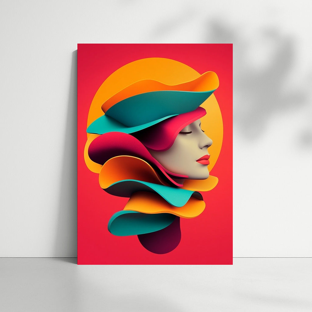 Abstract poster with a mysterious girl in a whirlwind of bright colors. Modern wall art for inspiration and comfort. See more from the collection: Mixed Wall Art