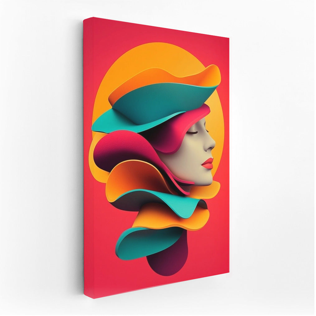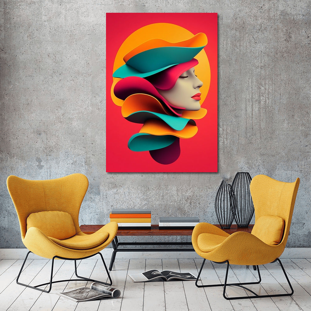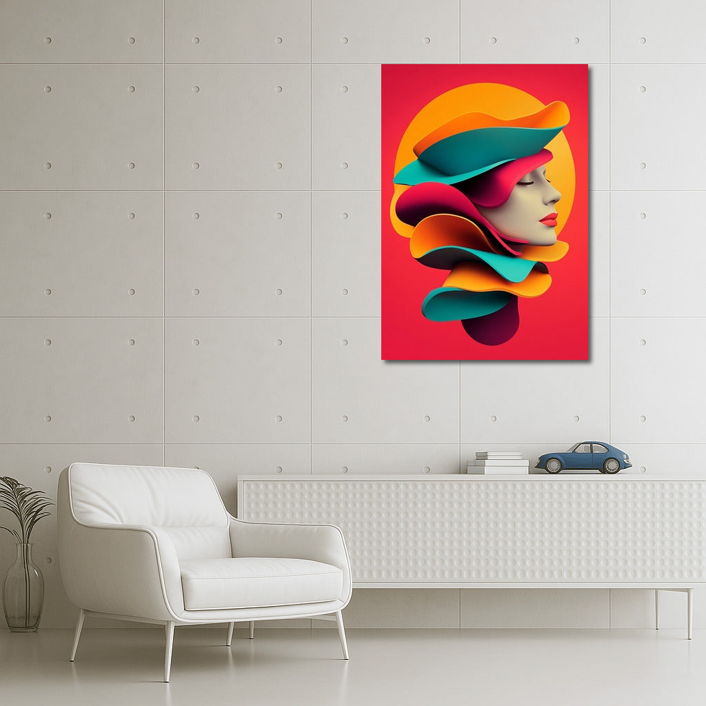 Abstract poster with a mysterious girl in a whirlwind of bright colors. Modern wall art for inspiration and comfort. See more from the collection: Mixed Wall Art