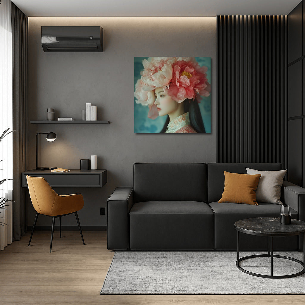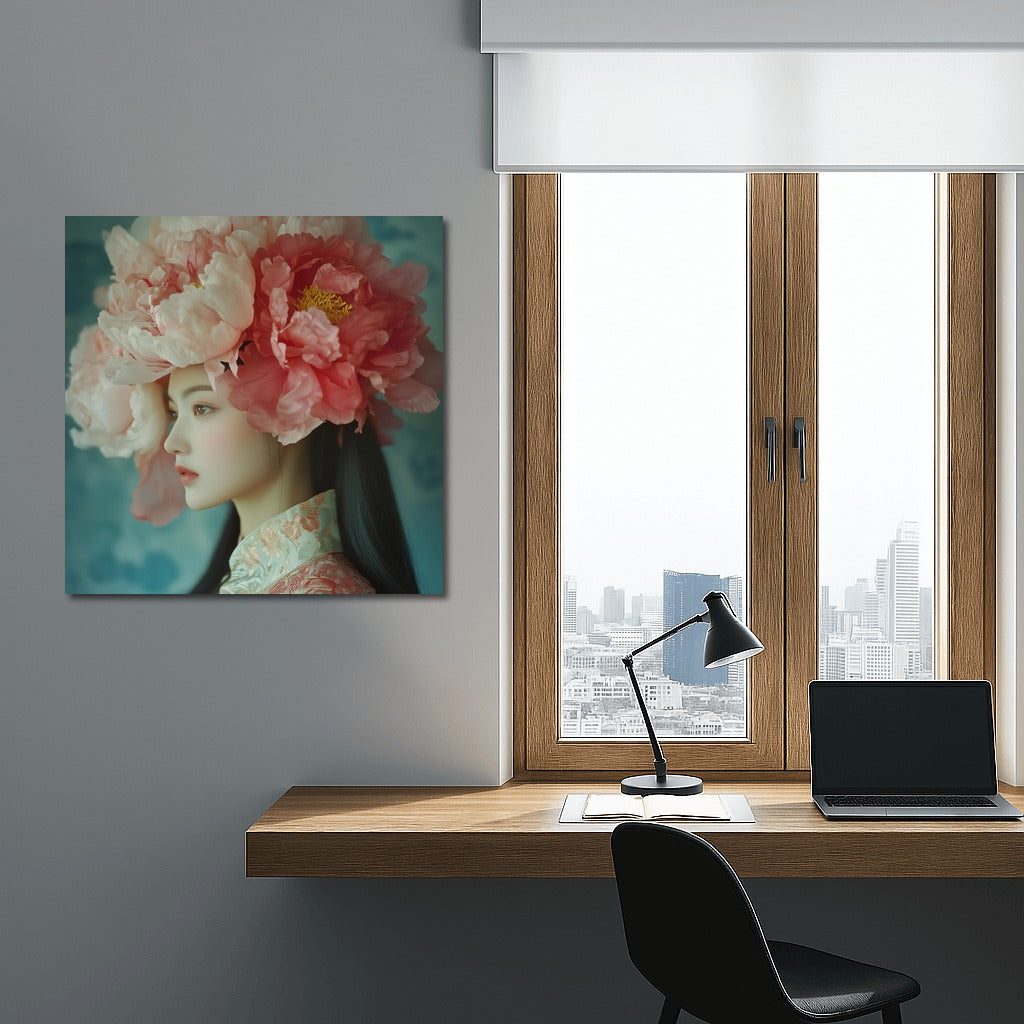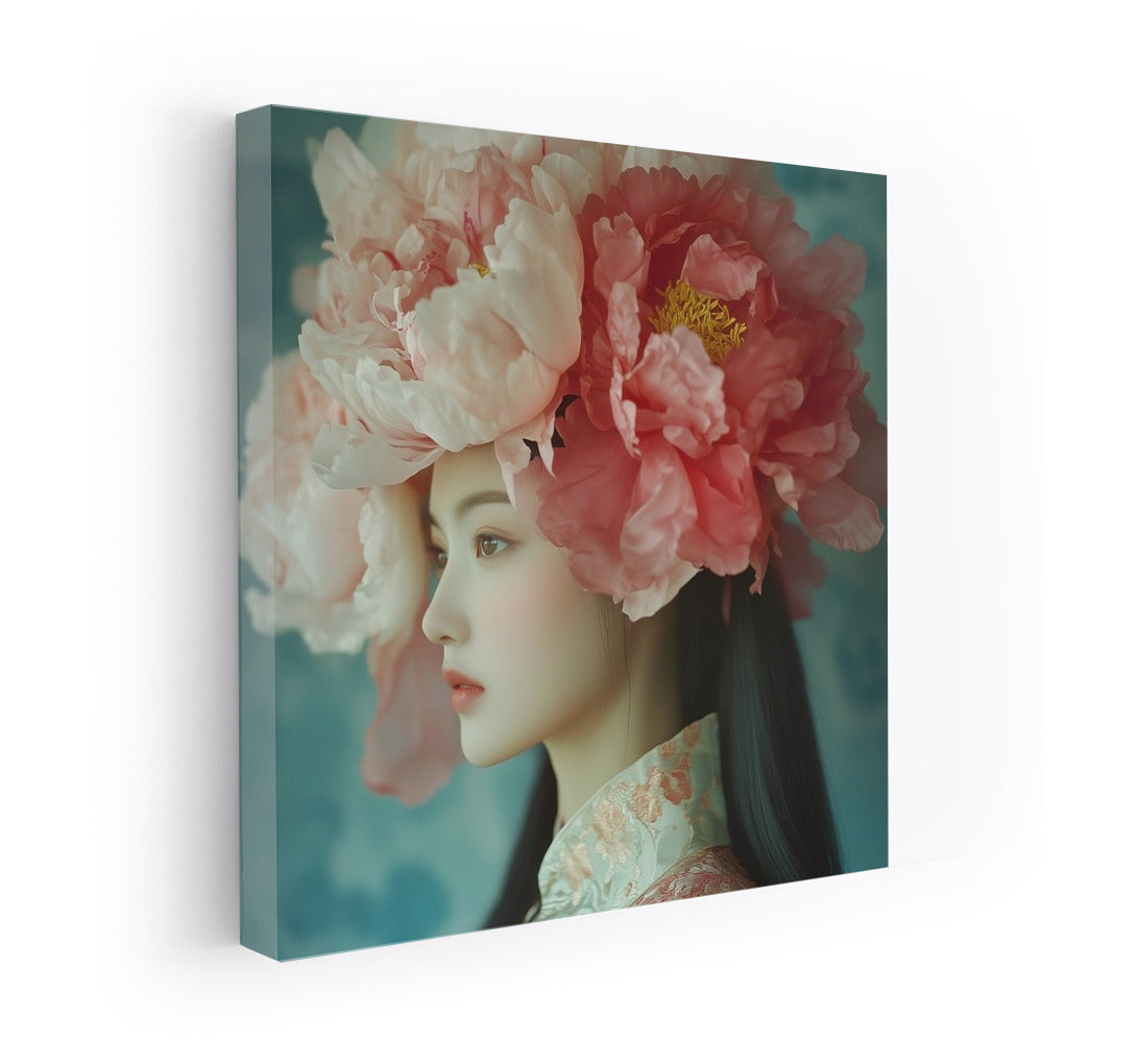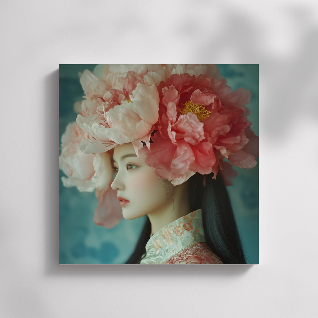 An elegant painting: a mysterious figure in a cloud of lush flowers. Wall art, inspiring and ethereal. See more from the collection: Wall Art with Women