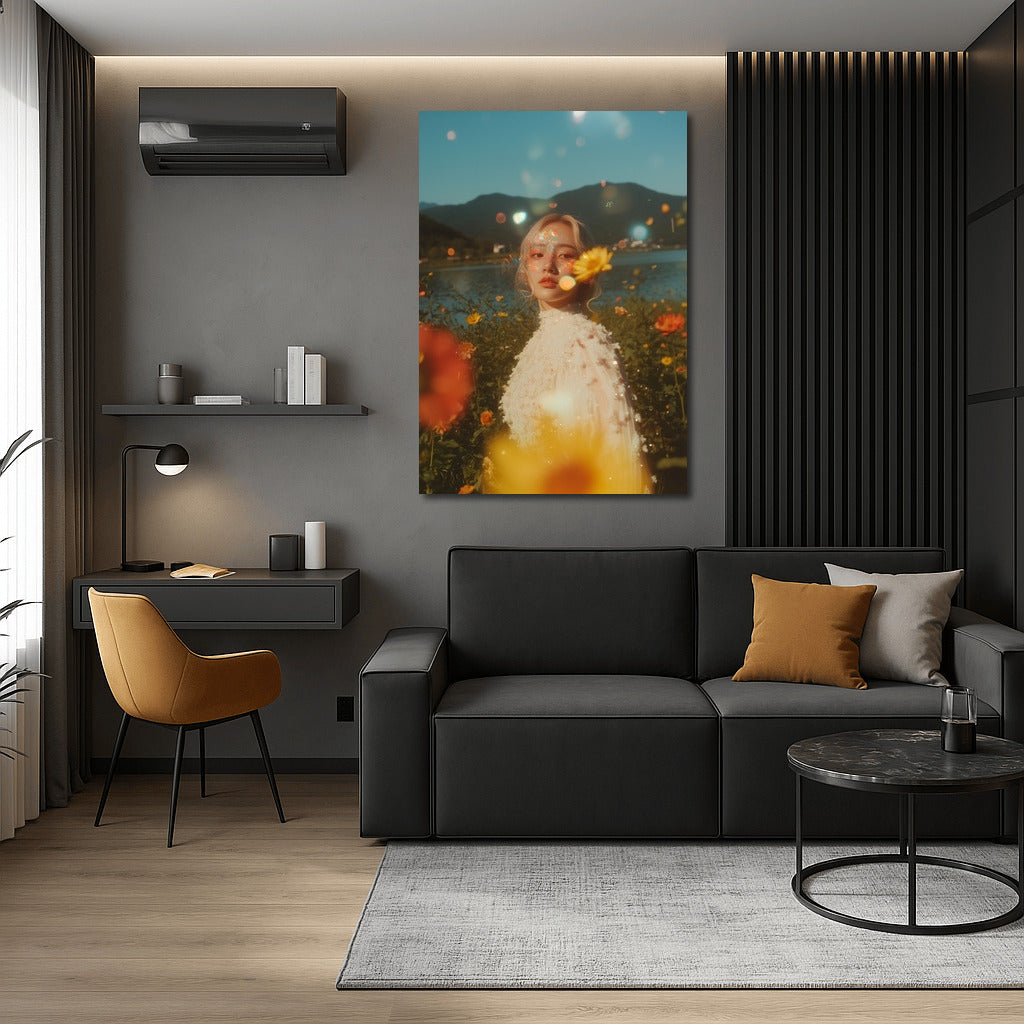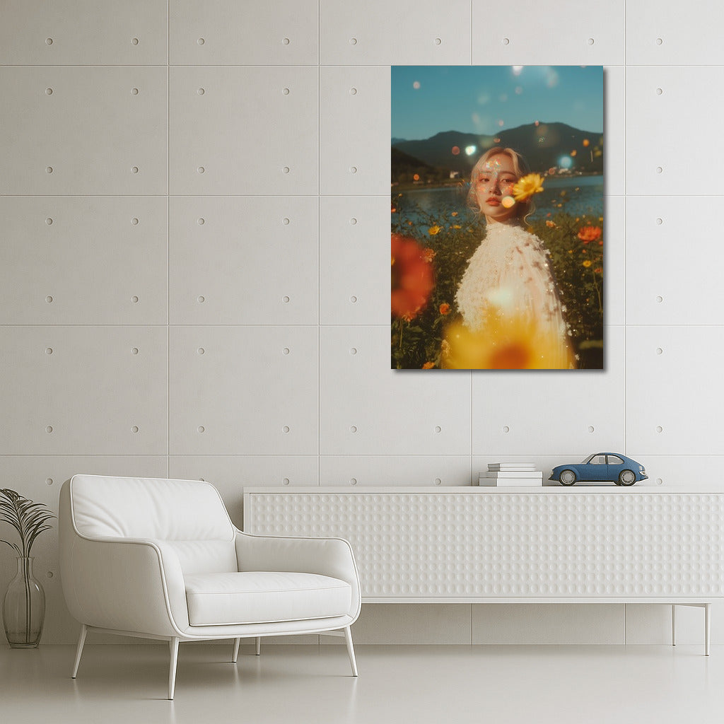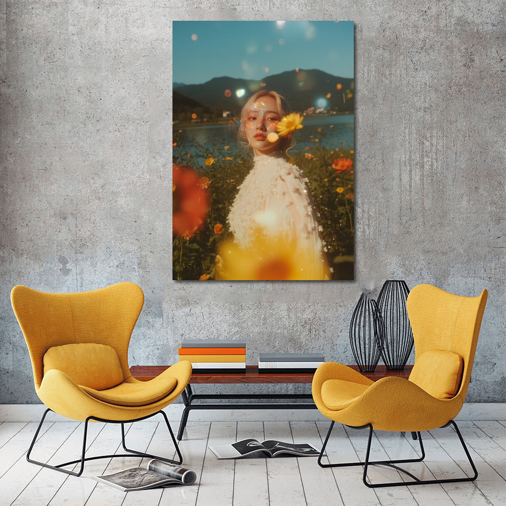 A vibrant poster featuring a mysterious figure amidst blooming fields and mountain landscapes. This painting will liven up any wall art! See more from the collection: Mixed Wall Art