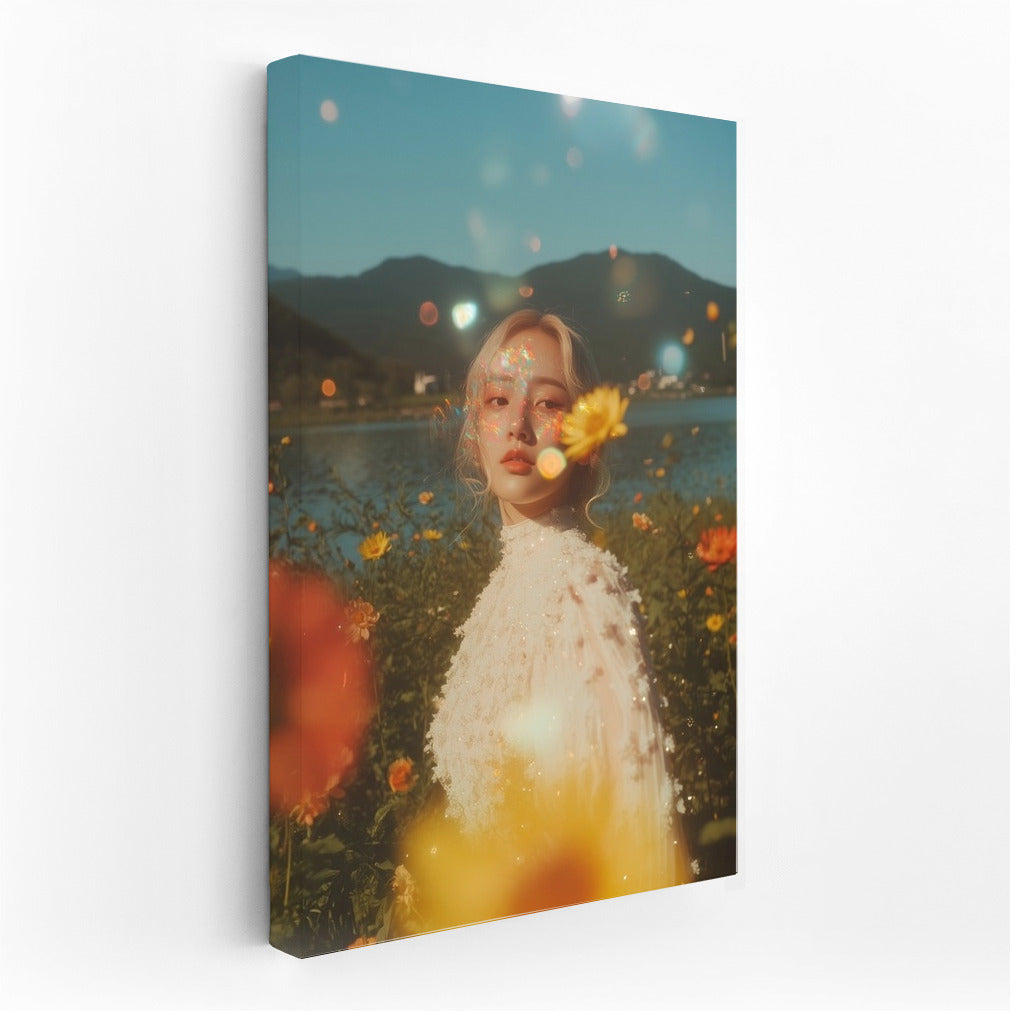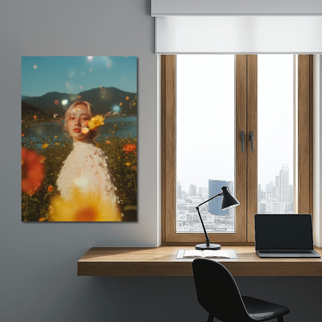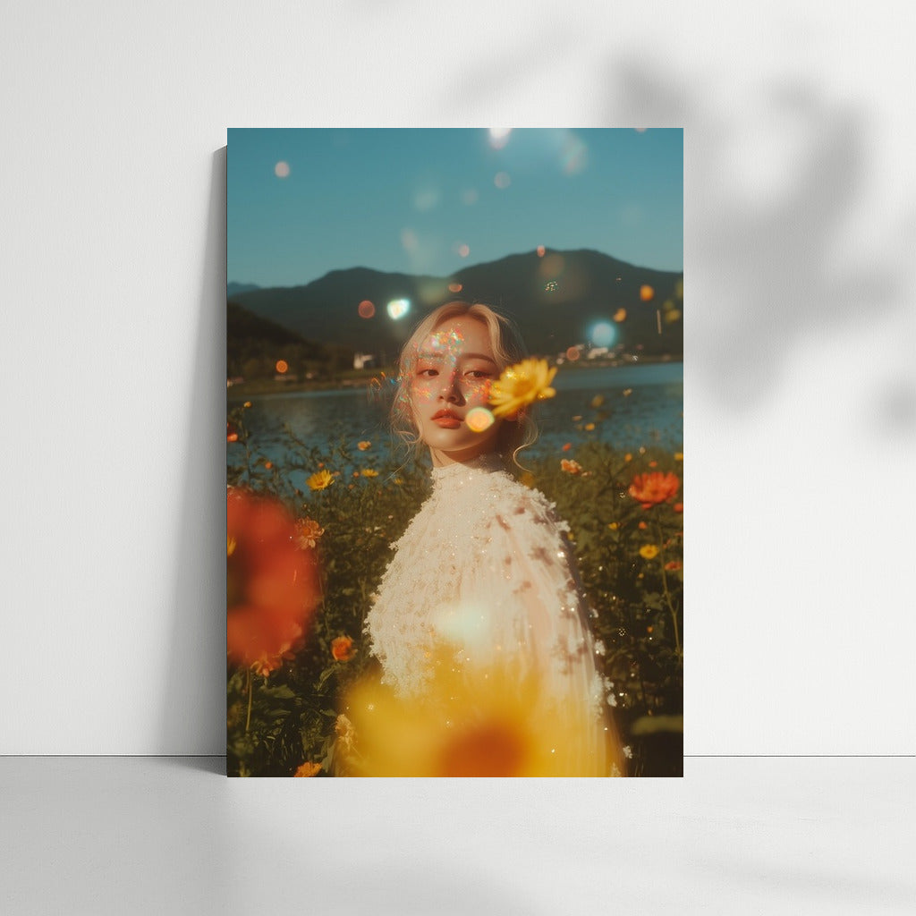 A vibrant poster featuring a mysterious figure amidst blooming fields and mountain landscapes. This painting will liven up any wall art! See more from the collection: Mixed Wall Art