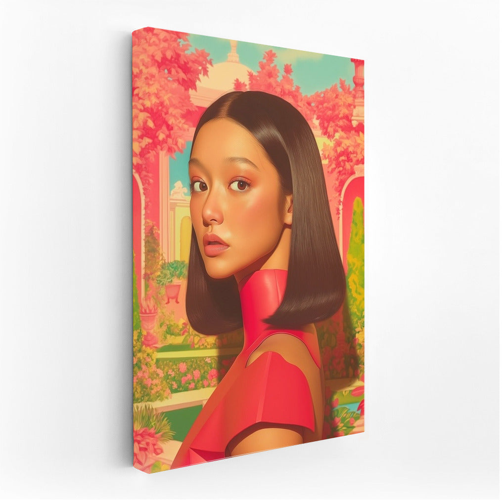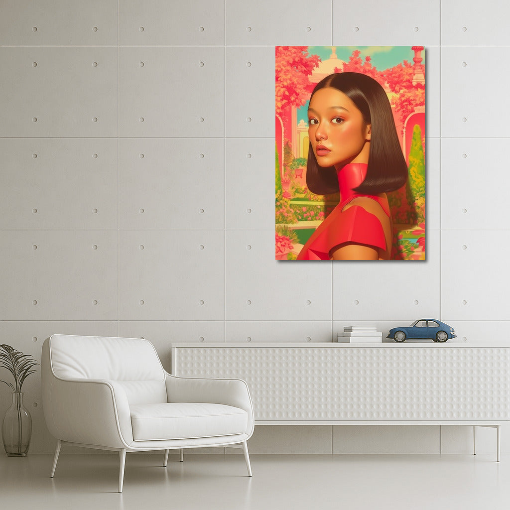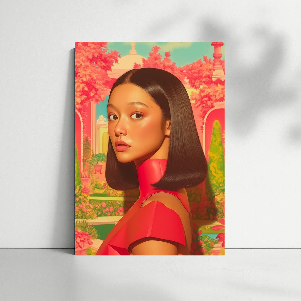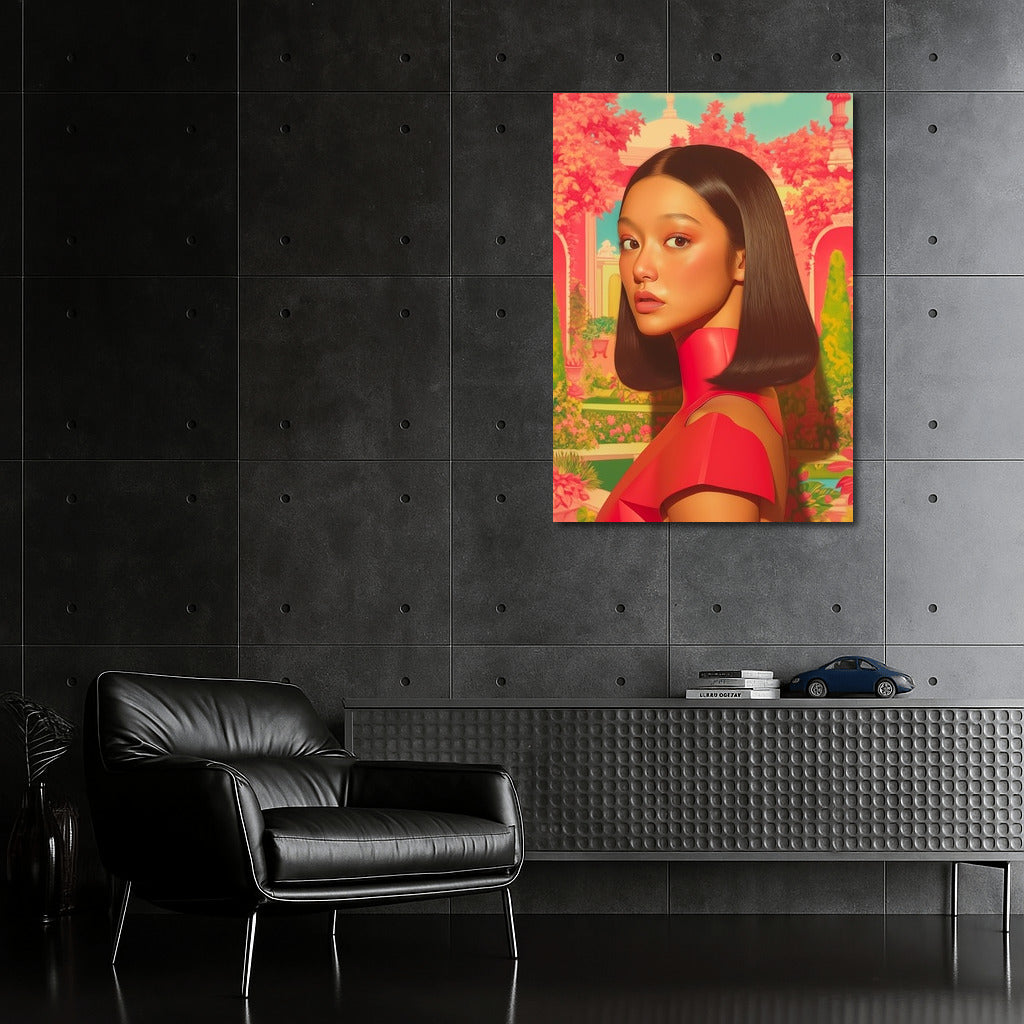 A delightful play of colors: a mysterious character against a colorful garden backdrop. A perfect poster for your wall art. See more from the collection: Wall Art with Women