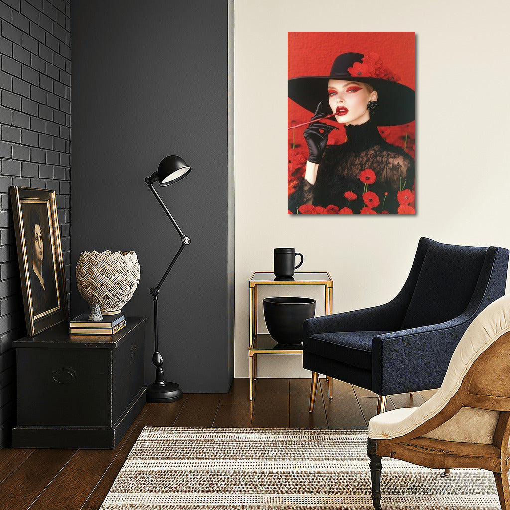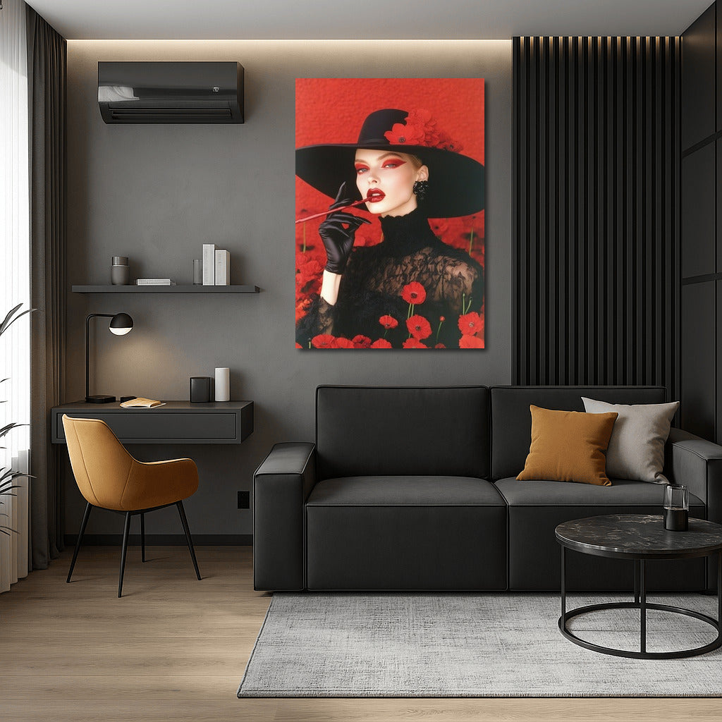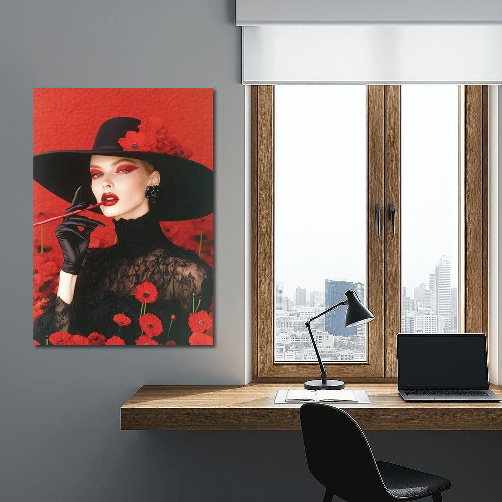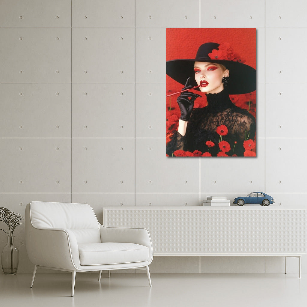 A poster with a mysterious figure in a hat among scarlet poppies. Elegant wall art to create a bright accent in the interior. See more from the collection: Wall Art with Women