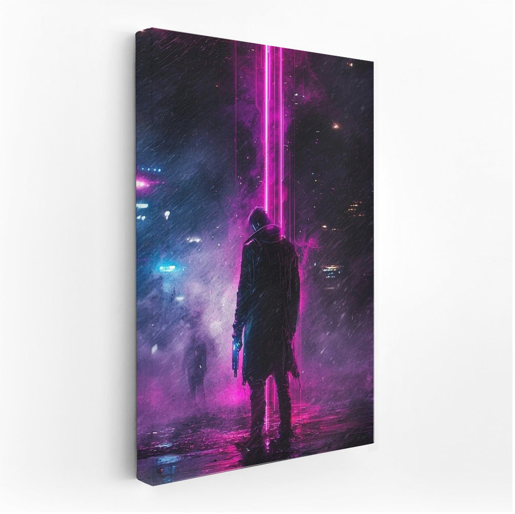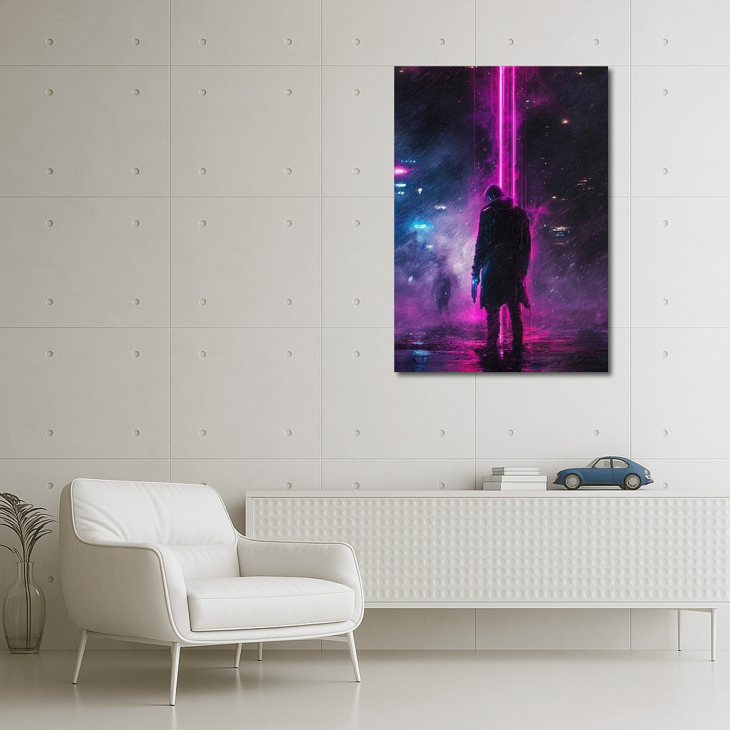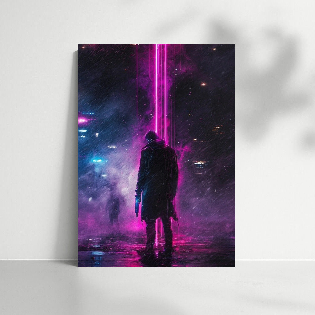 Neon world of the future: a mysterious figure in a rainy night. The poster will enliven the walls with a bright cyberpunk accent. See more from the collection: Neon Art