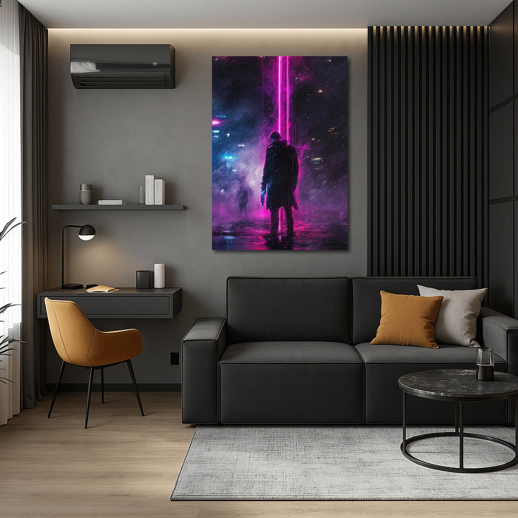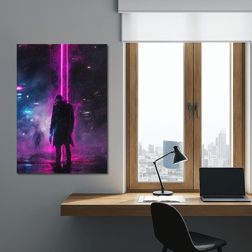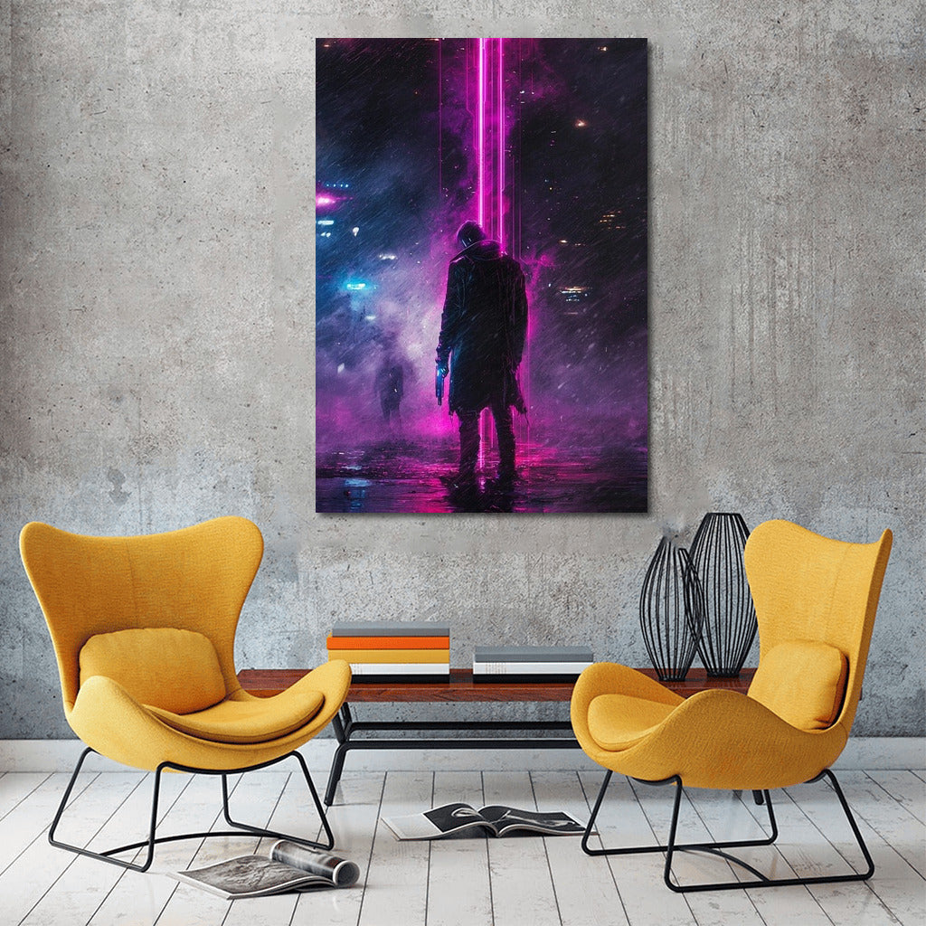 Neon world of the future: a mysterious figure in a rainy night. The poster will enliven the walls with a bright cyberpunk accent. See more from the collection: Neon Art