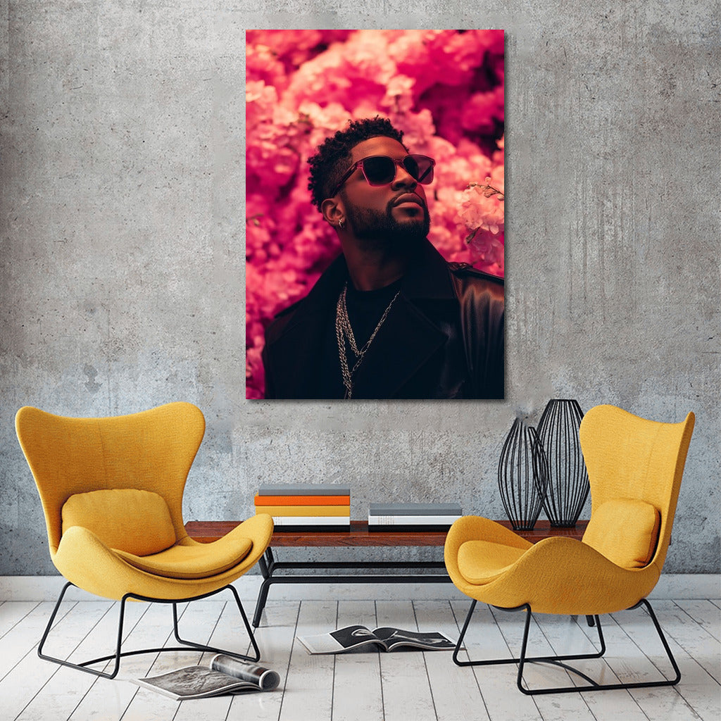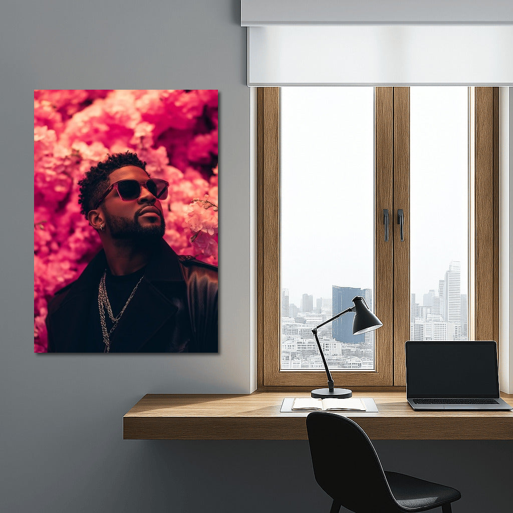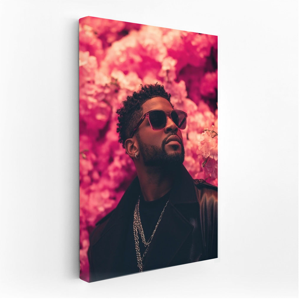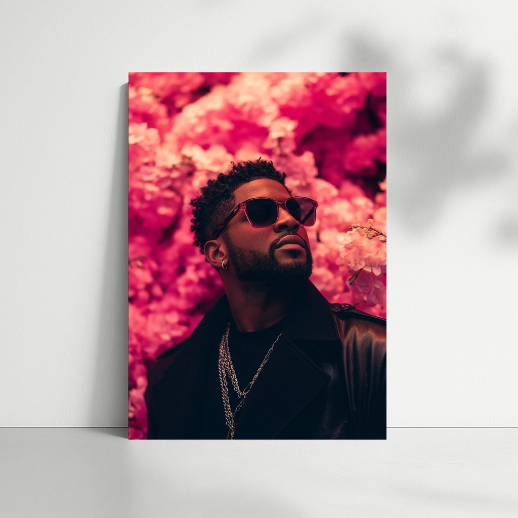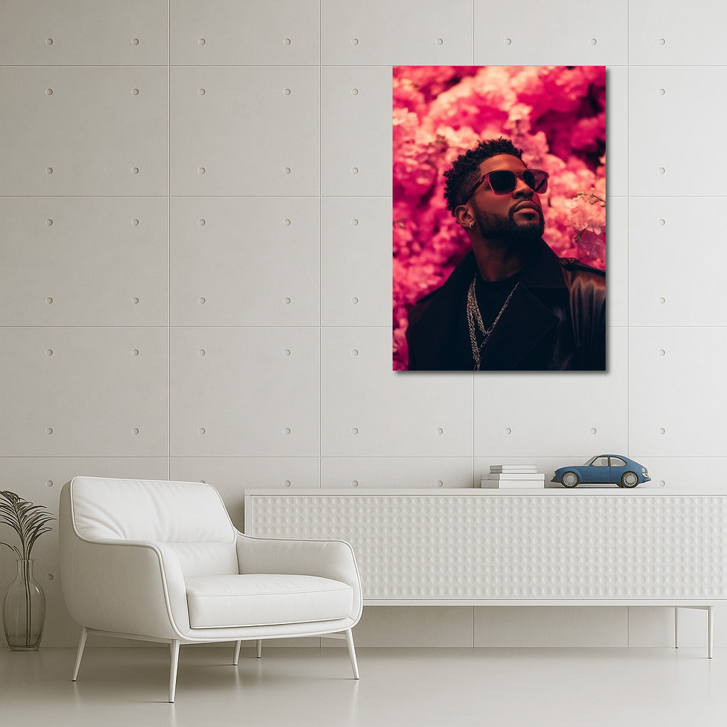 Vibrant wall art: a mysterious figure in glasses against a background of luxurious pink flowers. Add style to your interior! See more from the collection: Mixed Wall Art