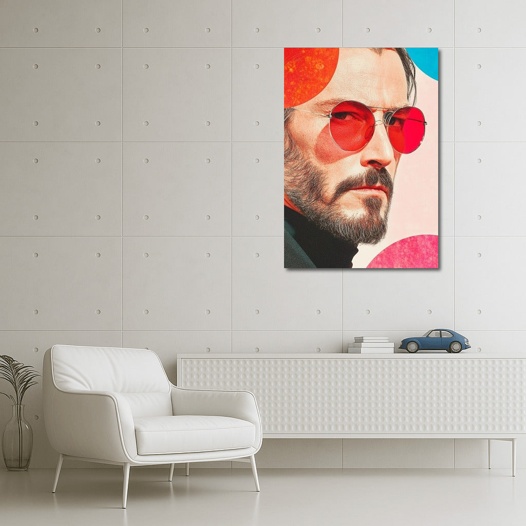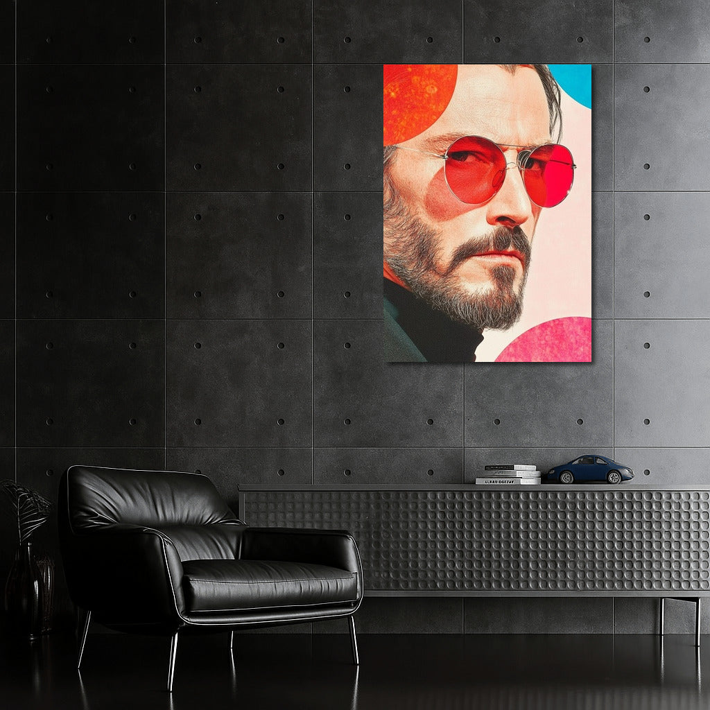 A vibrant poster featuring a mysterious man in red glasses. Contemporary wall art will liven up any space! See more from the collection: Mixed Wall Art