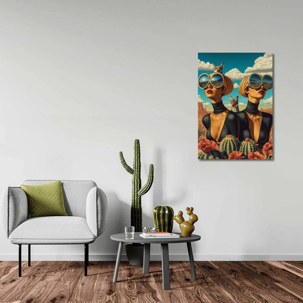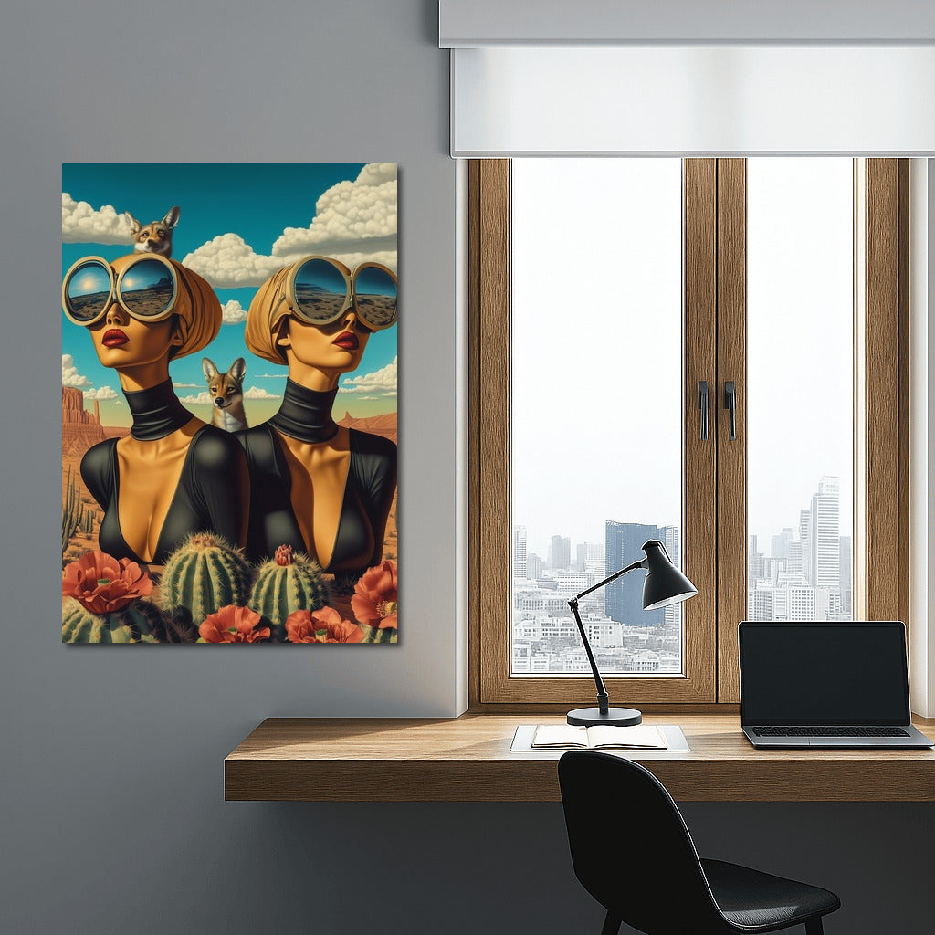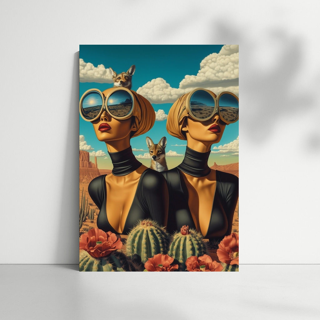 Contemporary wall art: two mysterious figures in the desert, surrounded by flowers and cacti. Add a unique poster to your collection! See more from the collection: Surreal Art