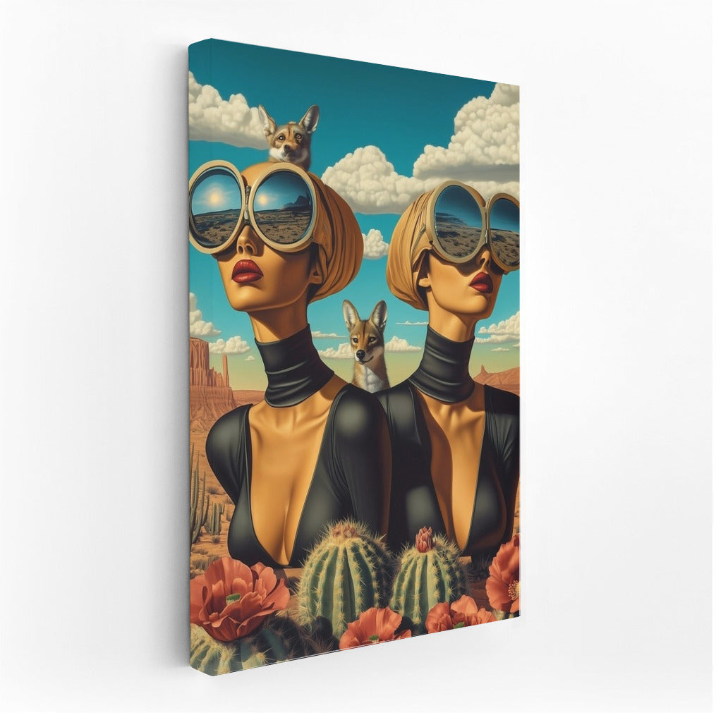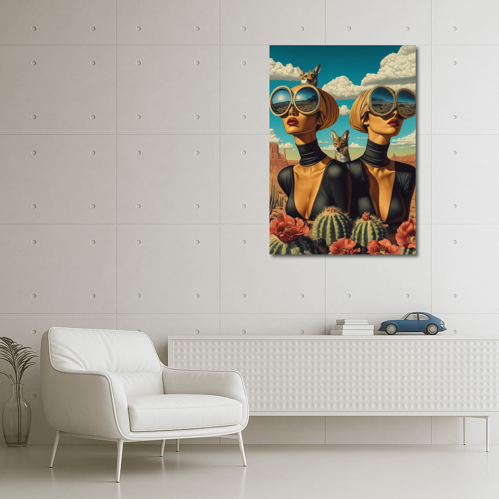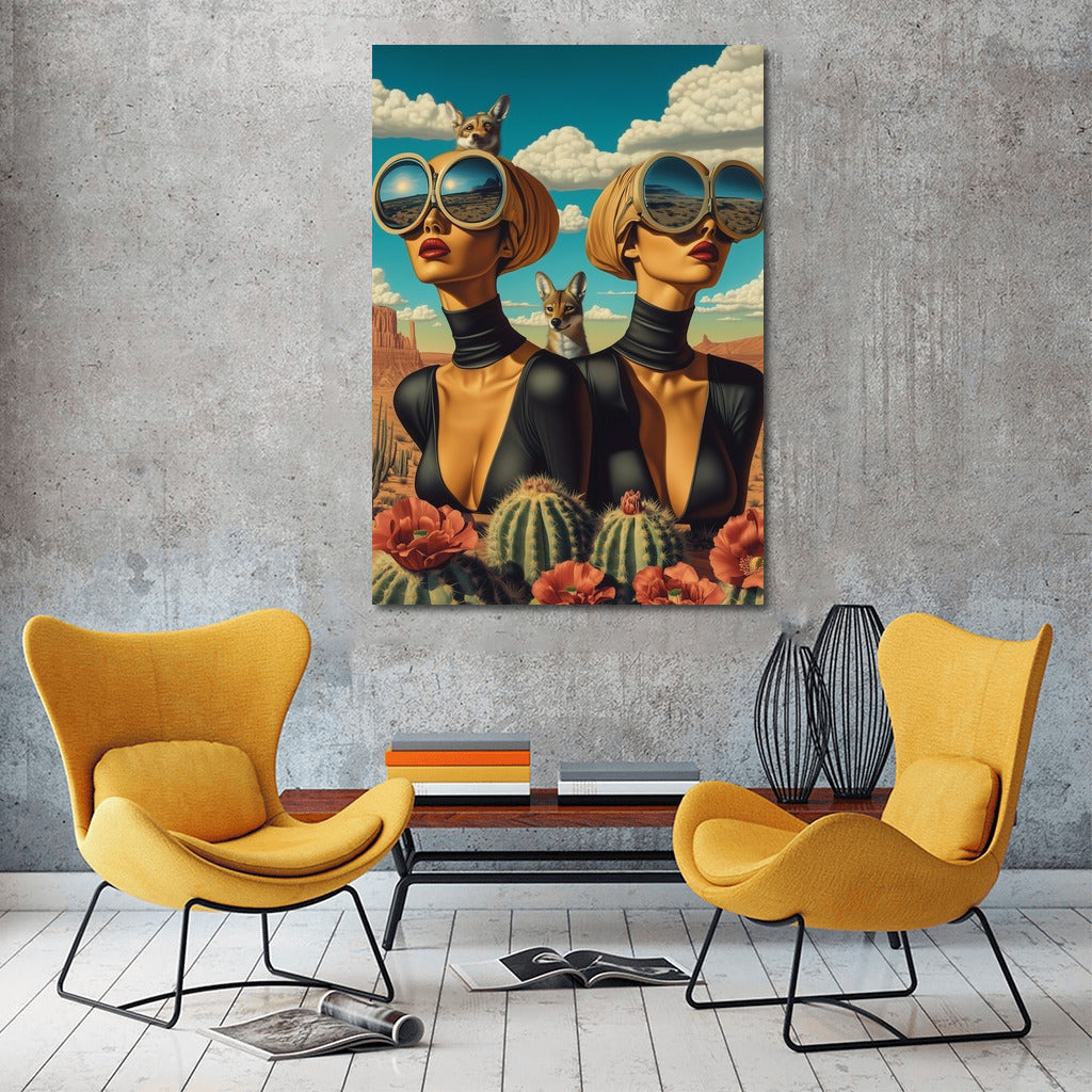 Contemporary wall art: two mysterious figures in the desert, surrounded by flowers and cacti. Add a unique poster to your collection! See more from the collection: Surreal Art