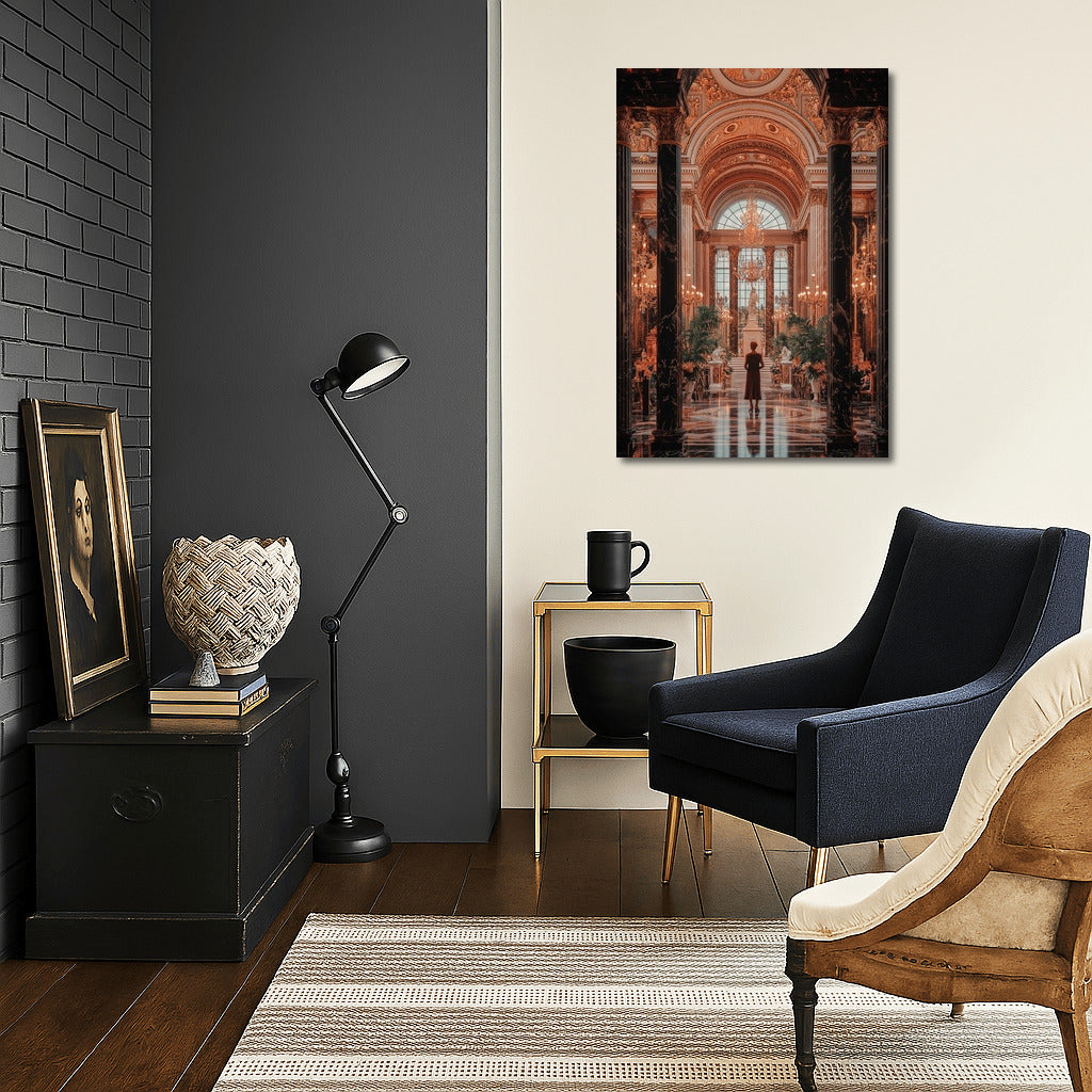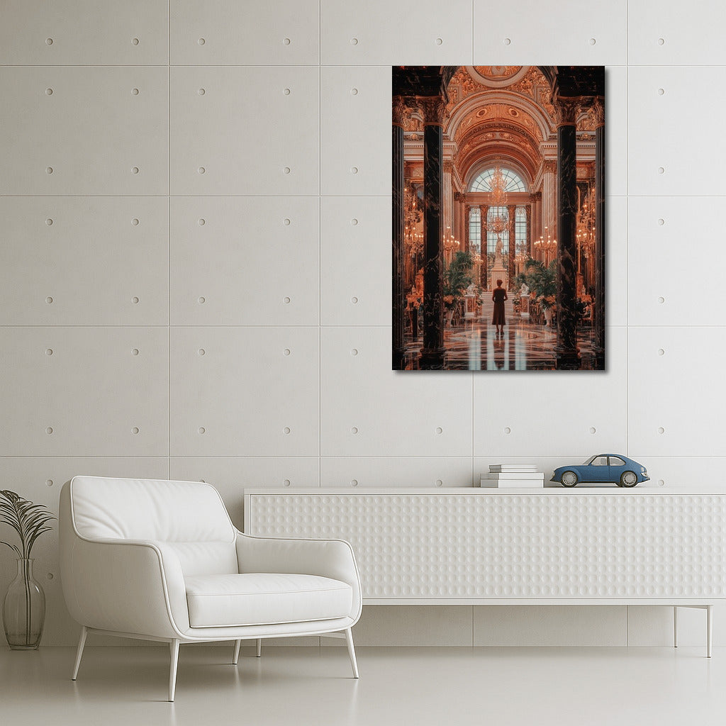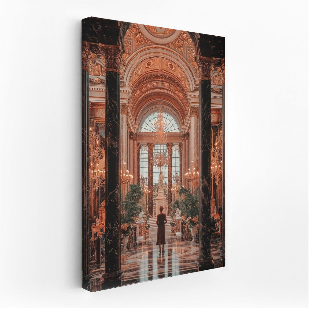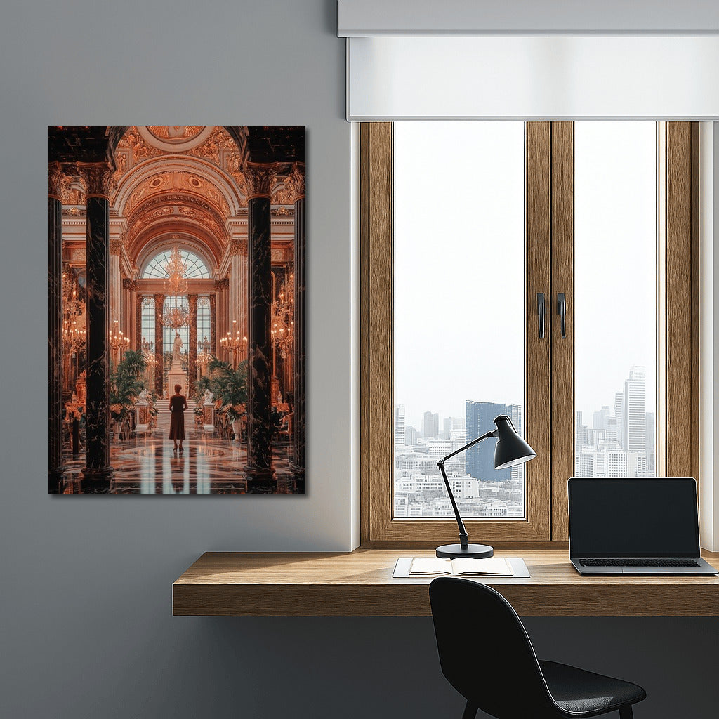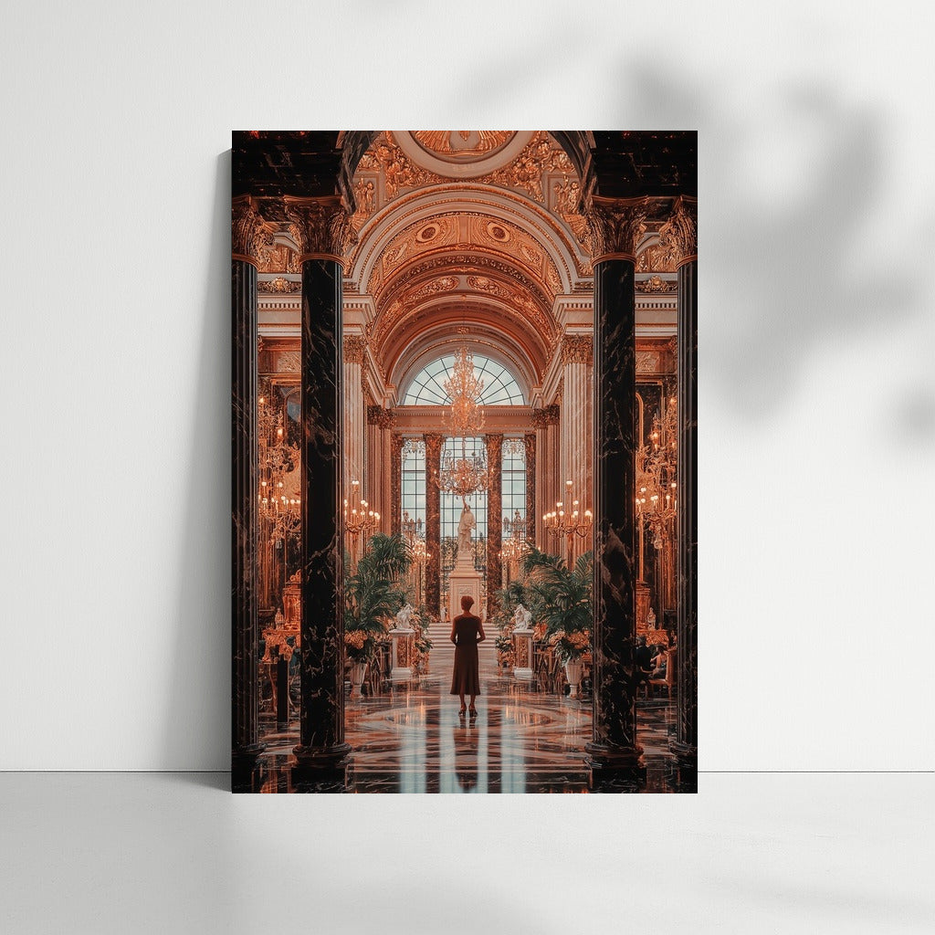 Gorgeous wall art: A mysterious figure in a majestic palace where gold details and luxury come to life on the poster. See more from the collection: Architectural Art