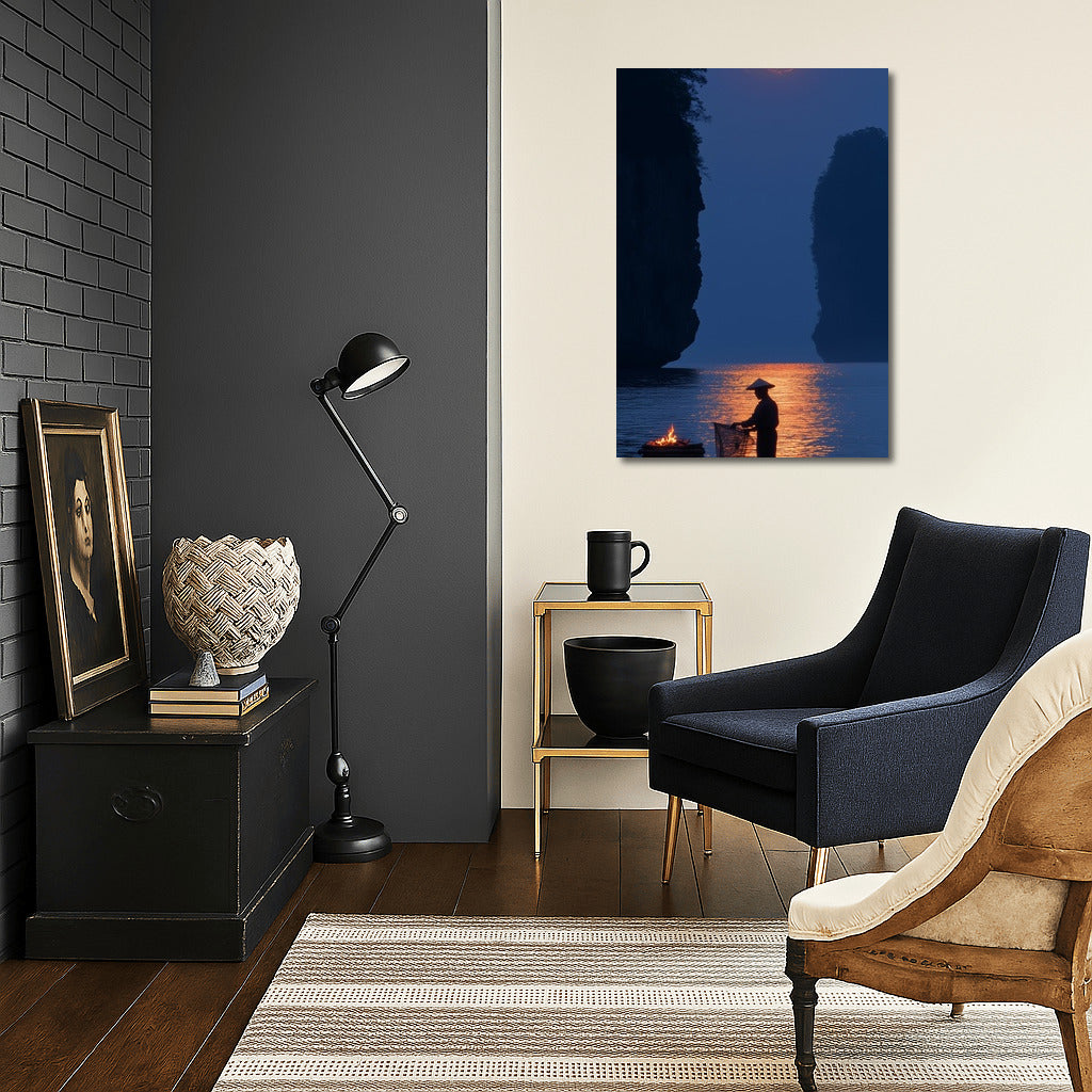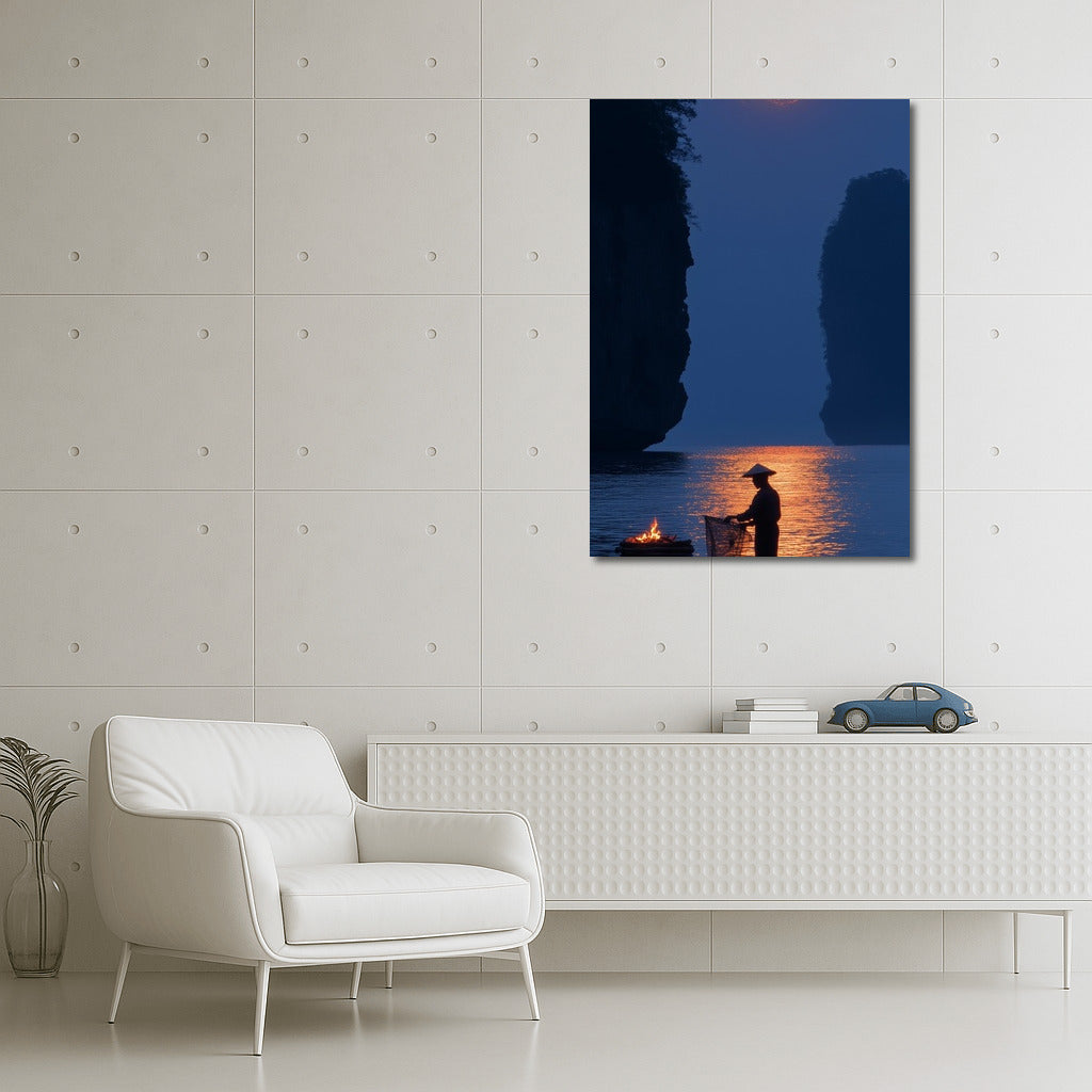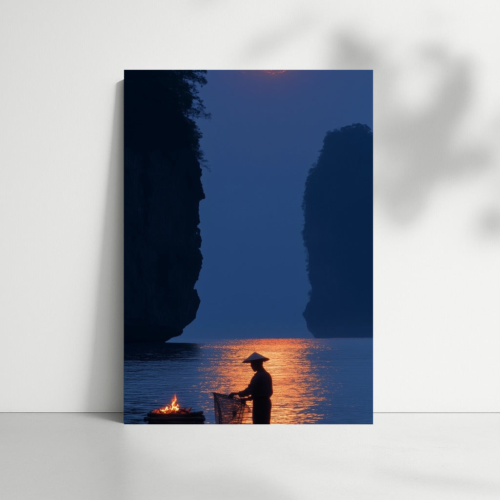 Moon Symphony: A mysterious figure on a boat in the moonlight. A perfect poster to create coziness and peace in your space. See more from the collection: Mixed Wall Art