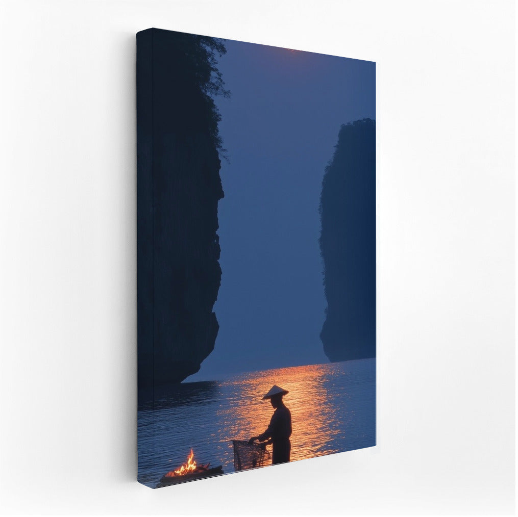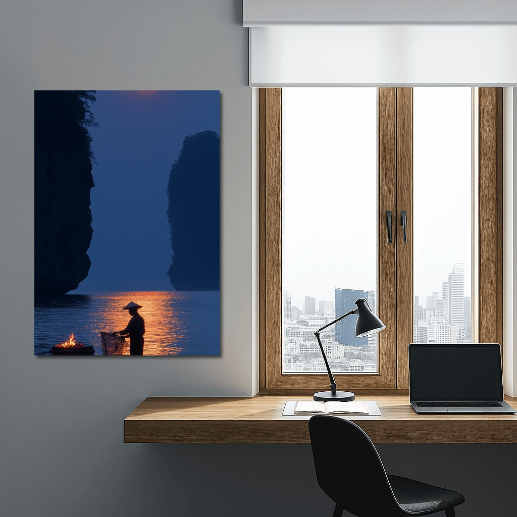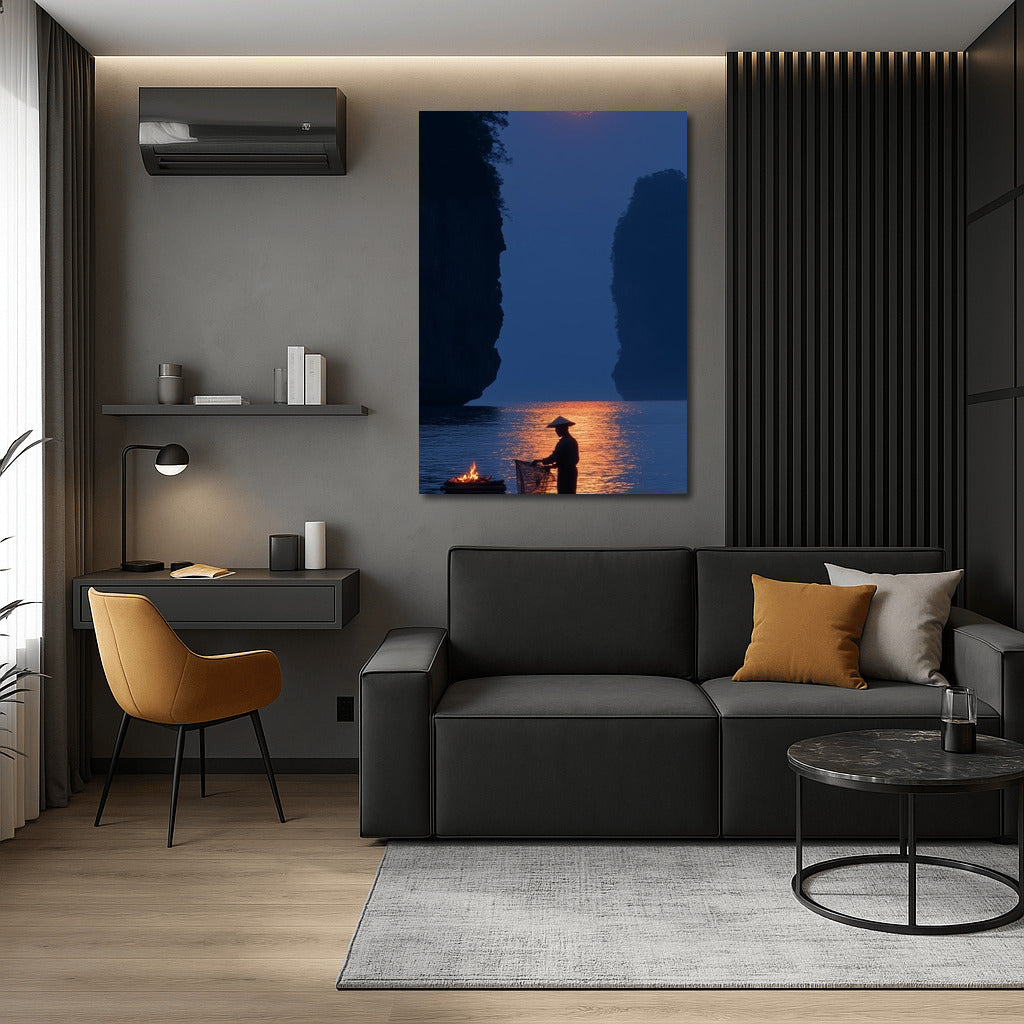 Moon Symphony: A mysterious figure on a boat in the moonlight. A perfect poster to create coziness and peace in your space. See more from the collection: Mixed Wall Art