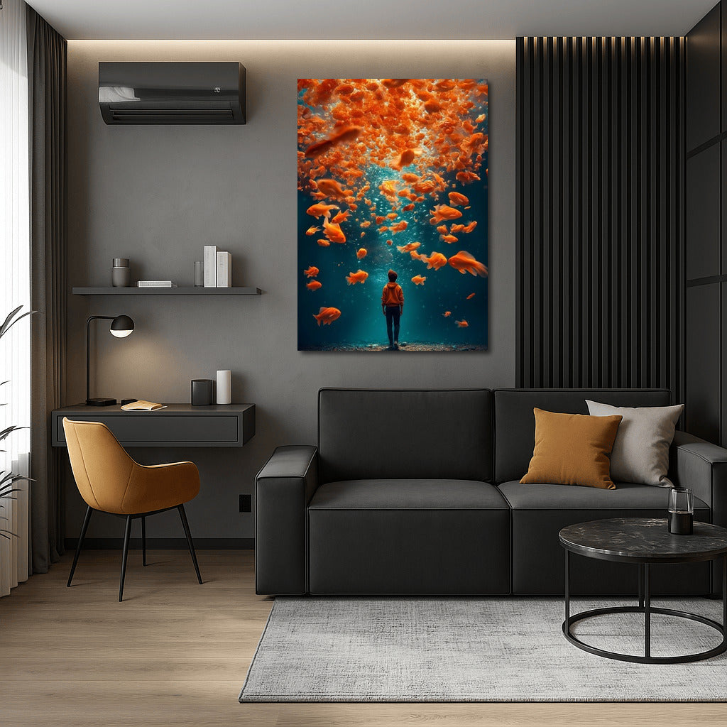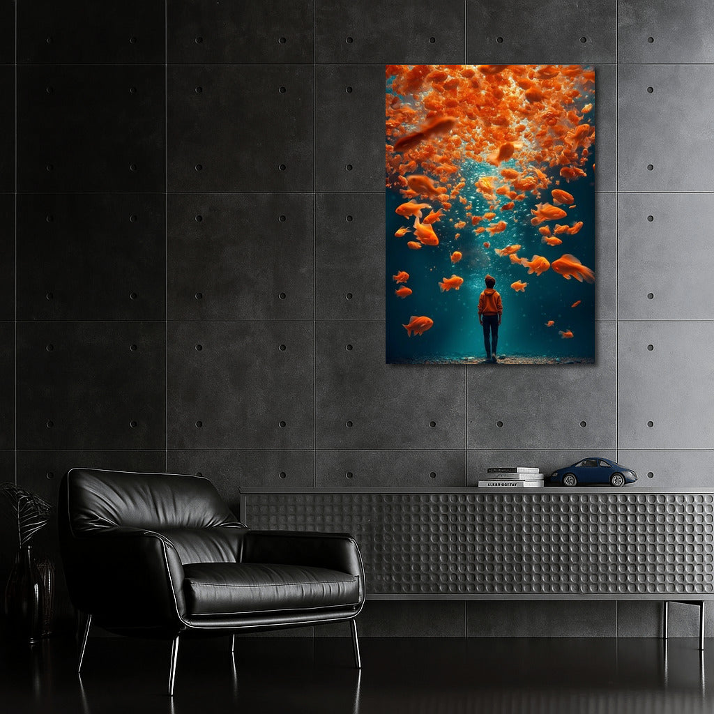 Dive into a world of fantasy with this painting: a mysterious character and the magic of orange fish. Perfect wall art! See more from the collection: Animals Art