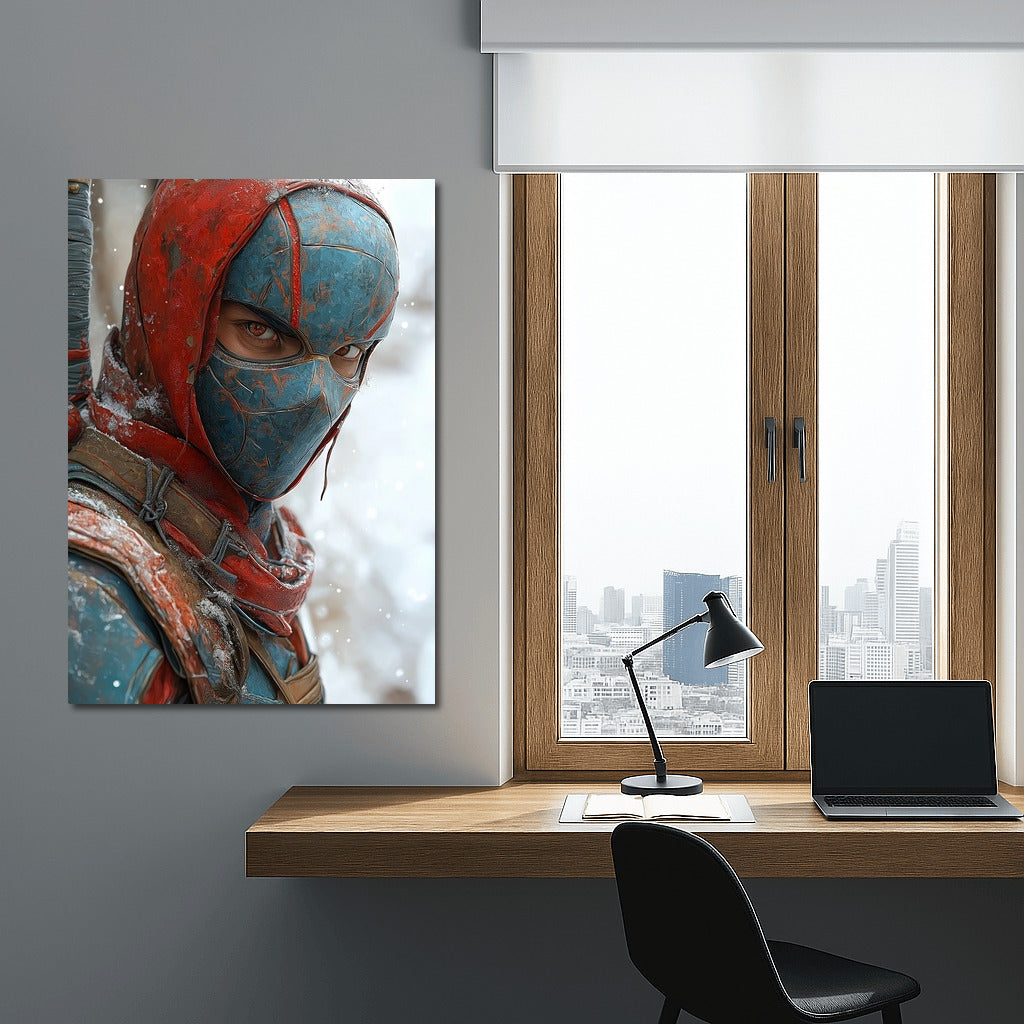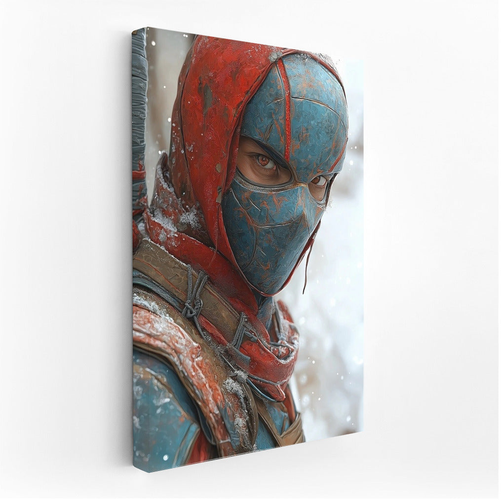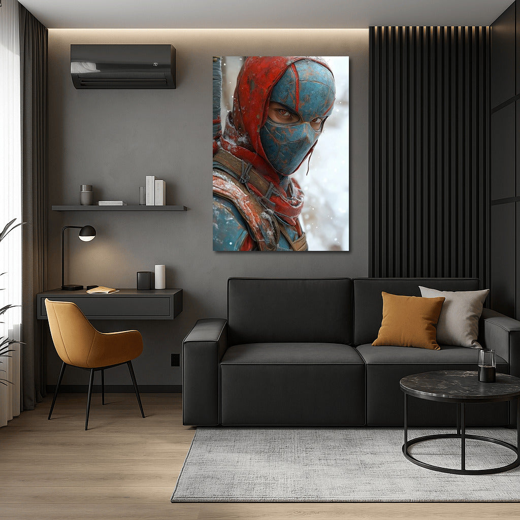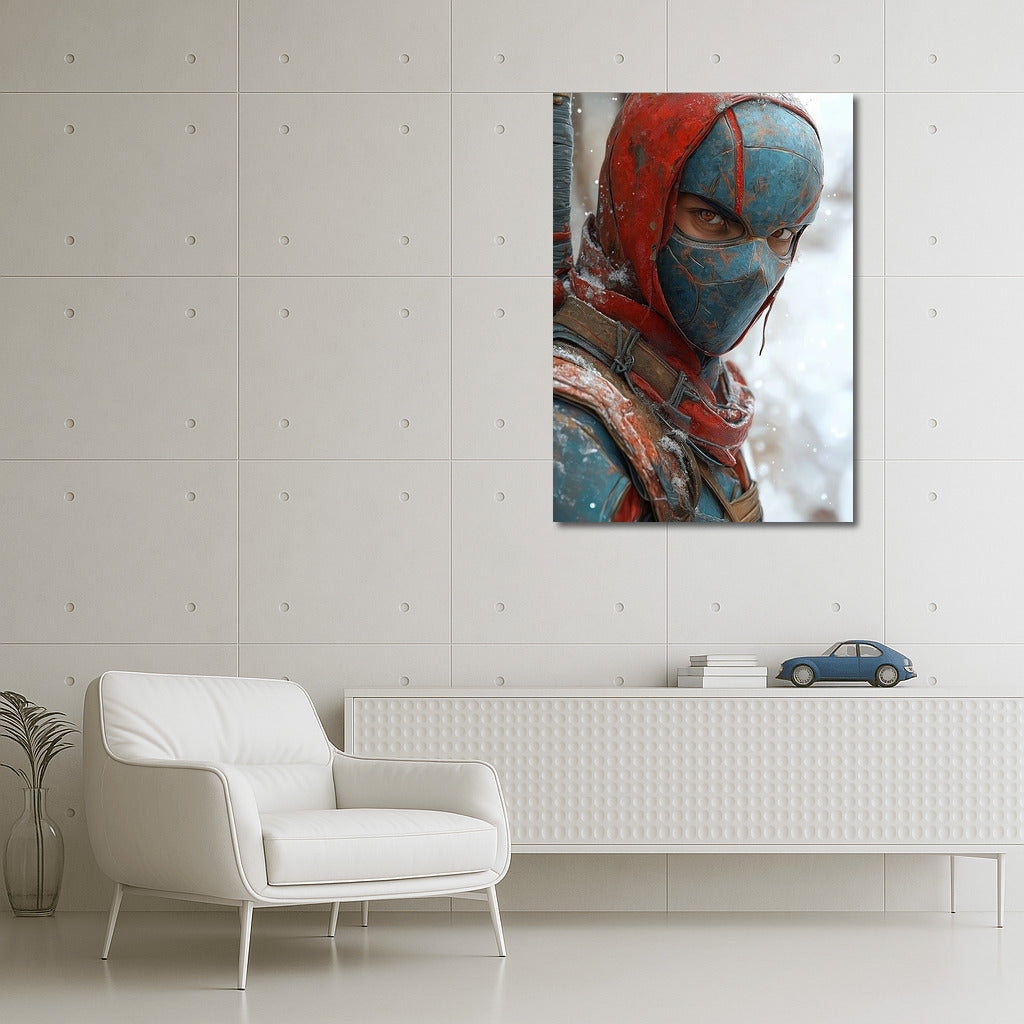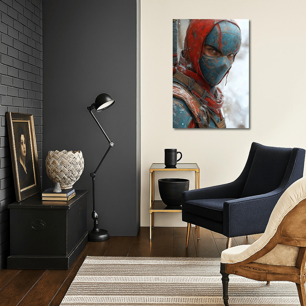 A poster with a mysterious hero in a winter setting. Wall art that conveys encounters with snowy adventures. See more from the collection: Mixed Wall Art