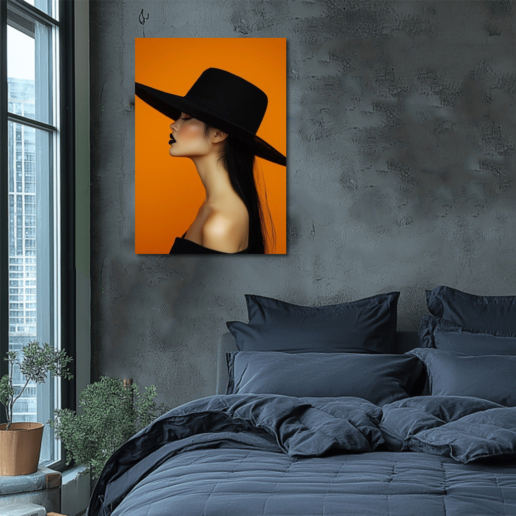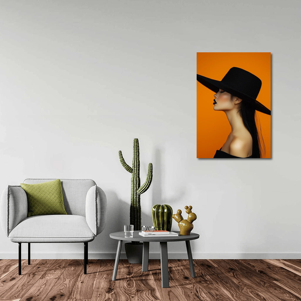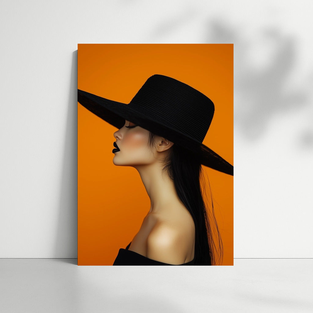 Elegant poster: silhouette in black hat against bright orange sunset background. Stylish wall art for modern interior. See more from the collection: Wall Art with Women