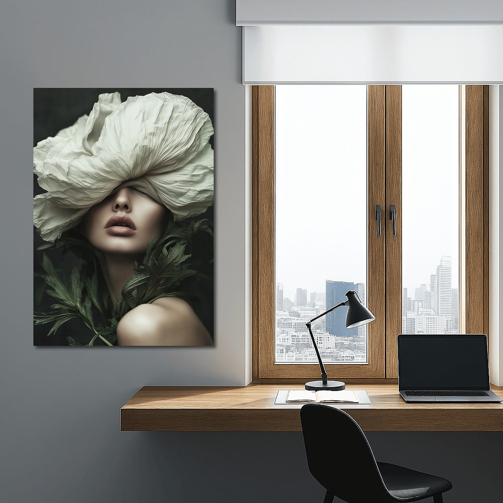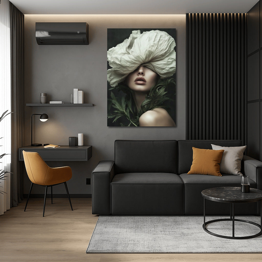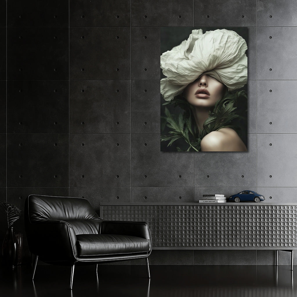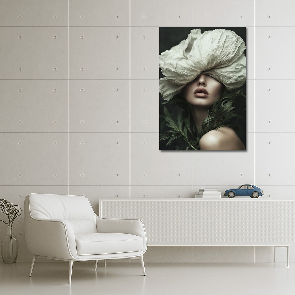 Expressive wall art: snow-white flower and mysterious image. Bring harmony and style to your interior with this poster. See more from the collection: Wall Art with Women