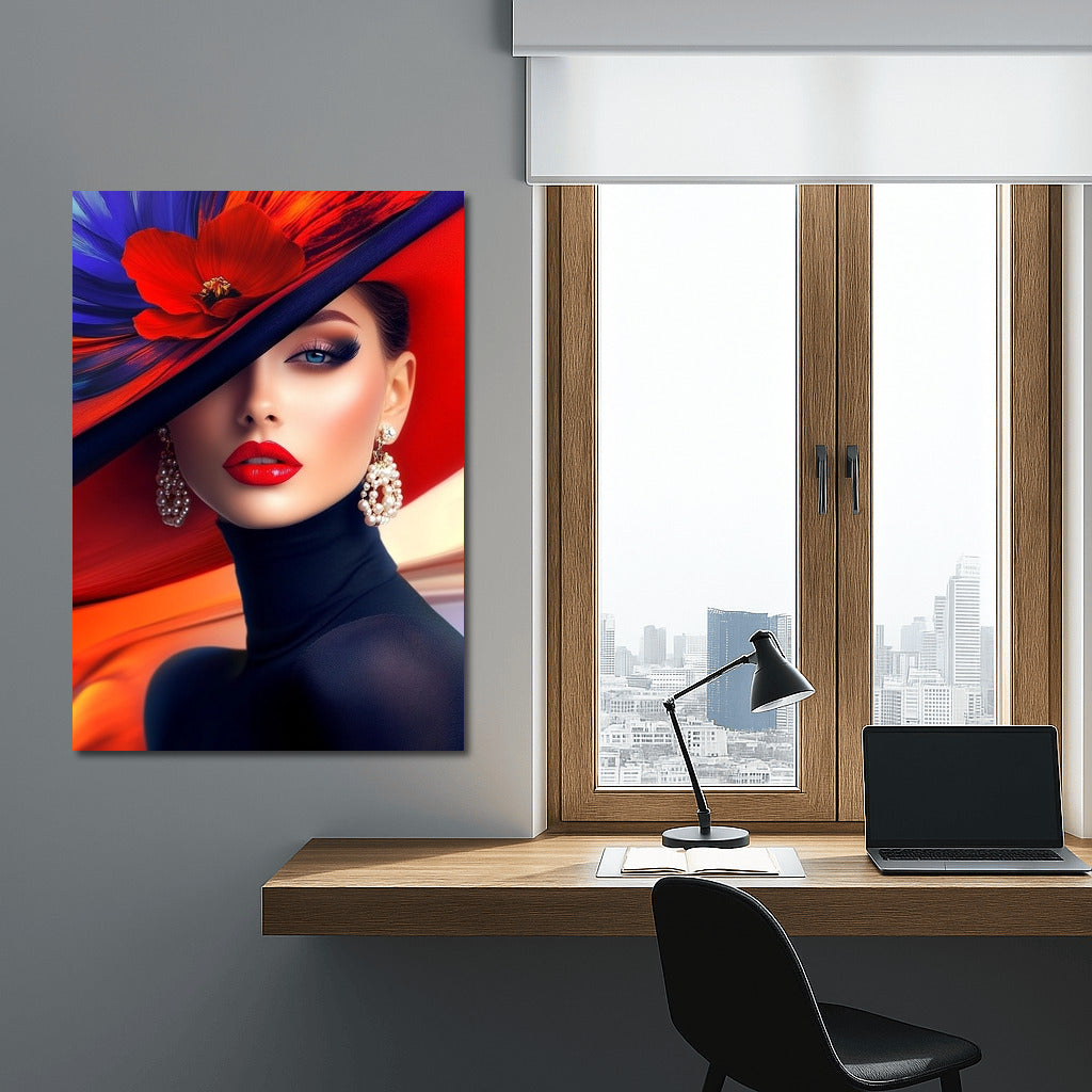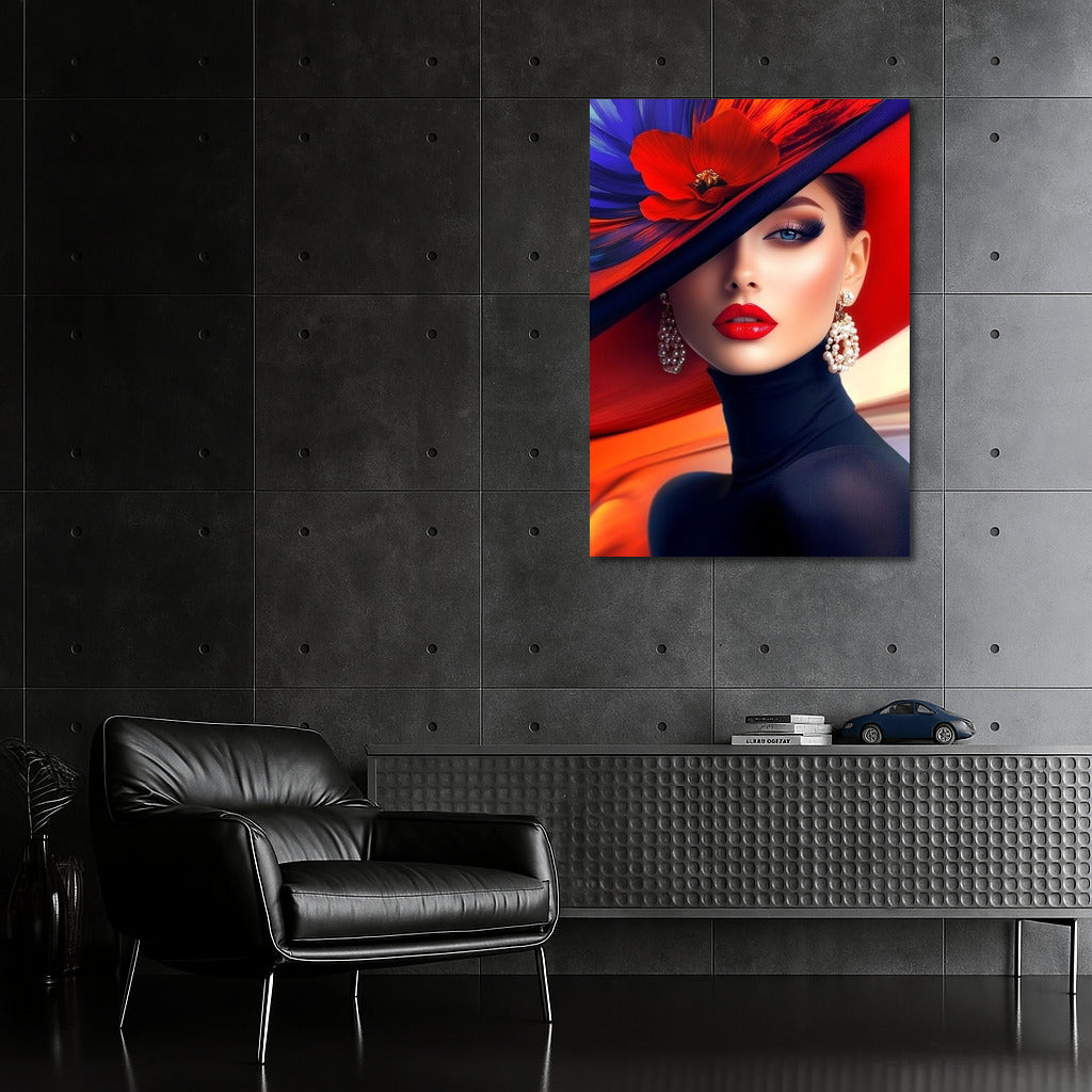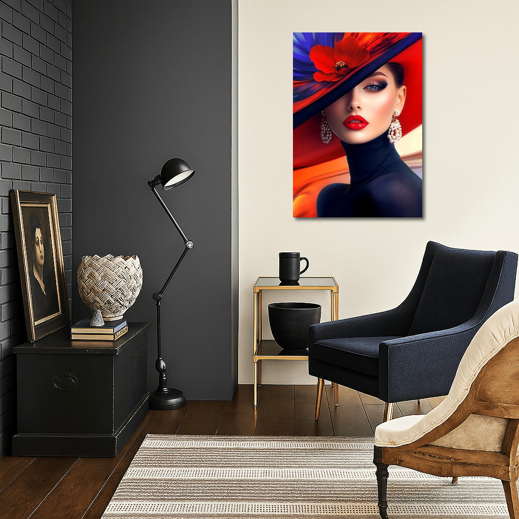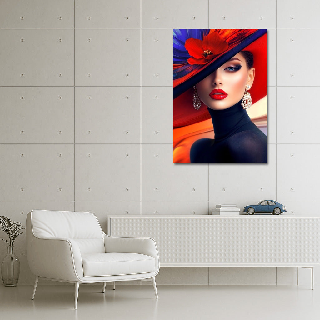 Elegant poster: Mysterious look, bright colors and stylish hat create unique wall art for inspiration. See more from the collection: Wall Art with Women