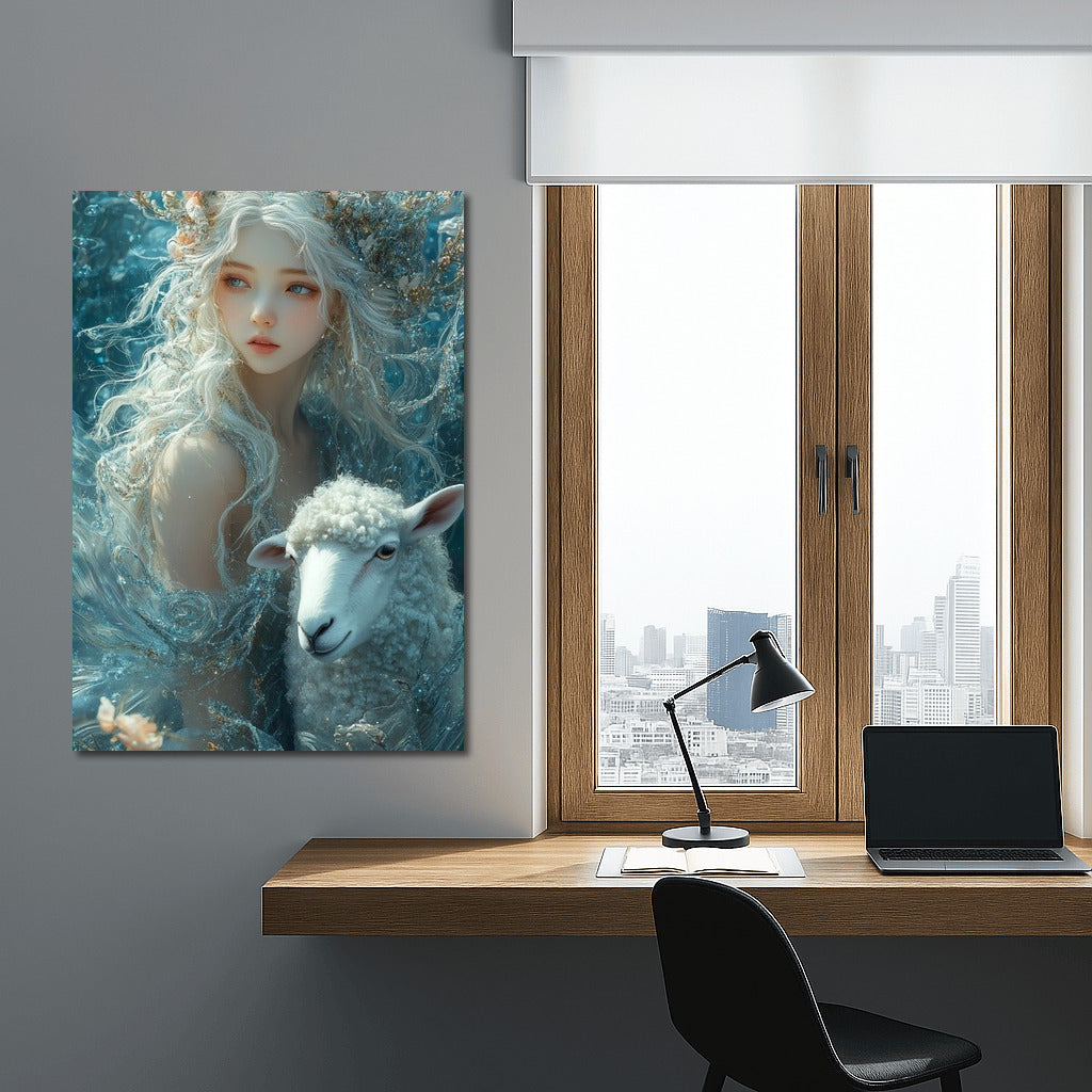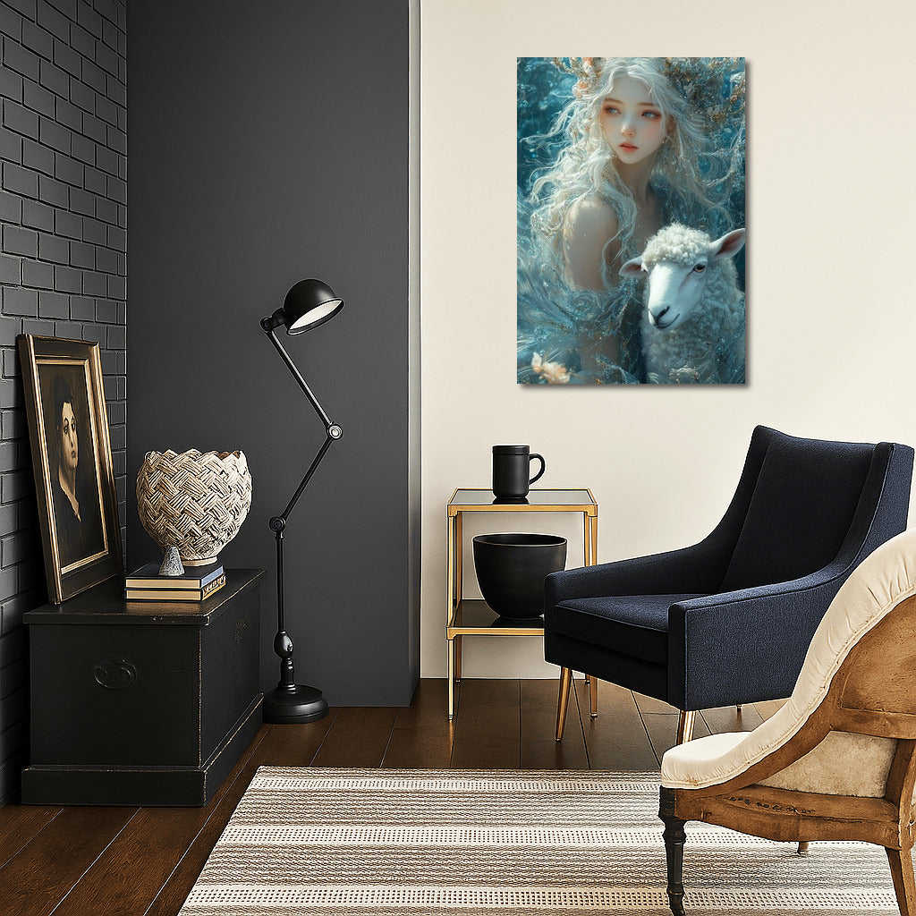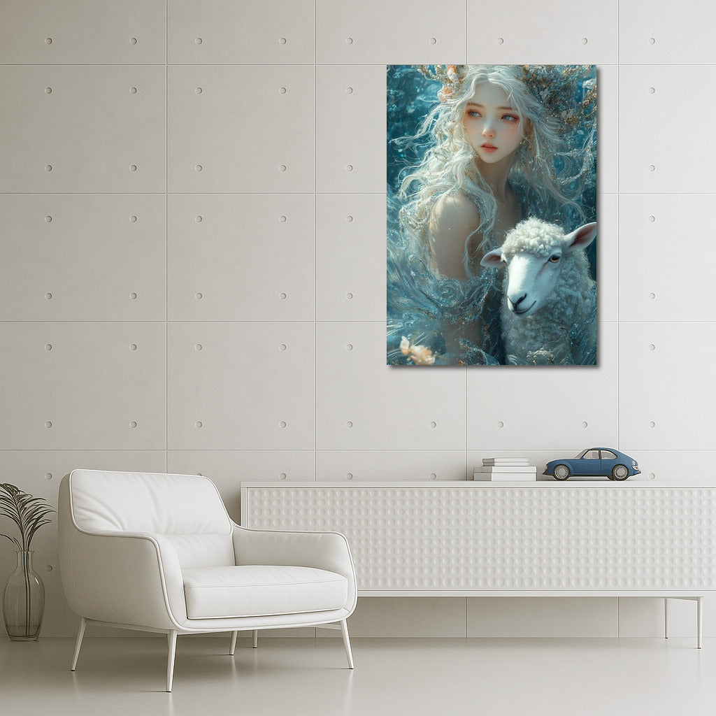 The magic and harmony of nature come to life in this wall art: an ephemeral figure and a sheep in a dream world. See more from the collection: Wall Art with Women
