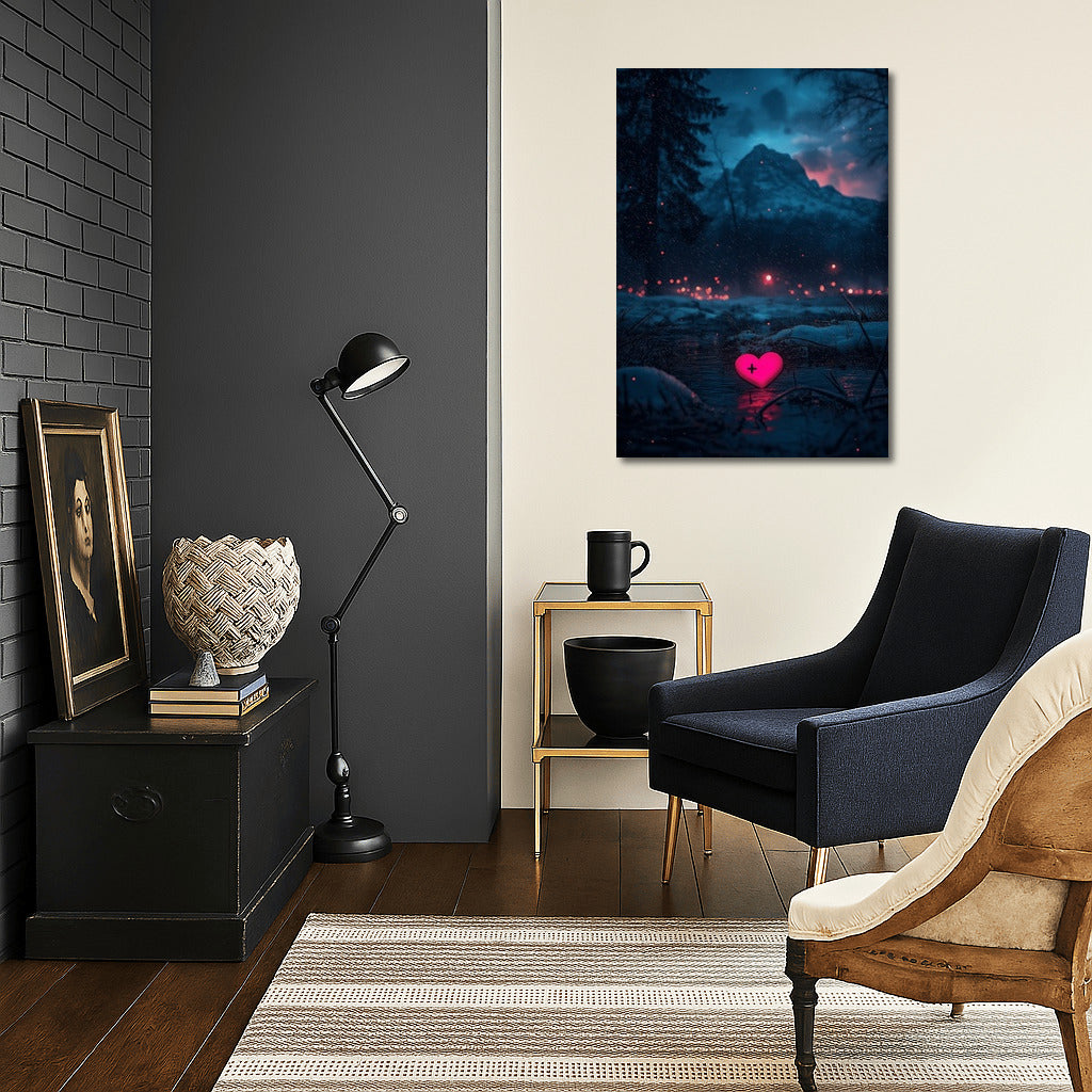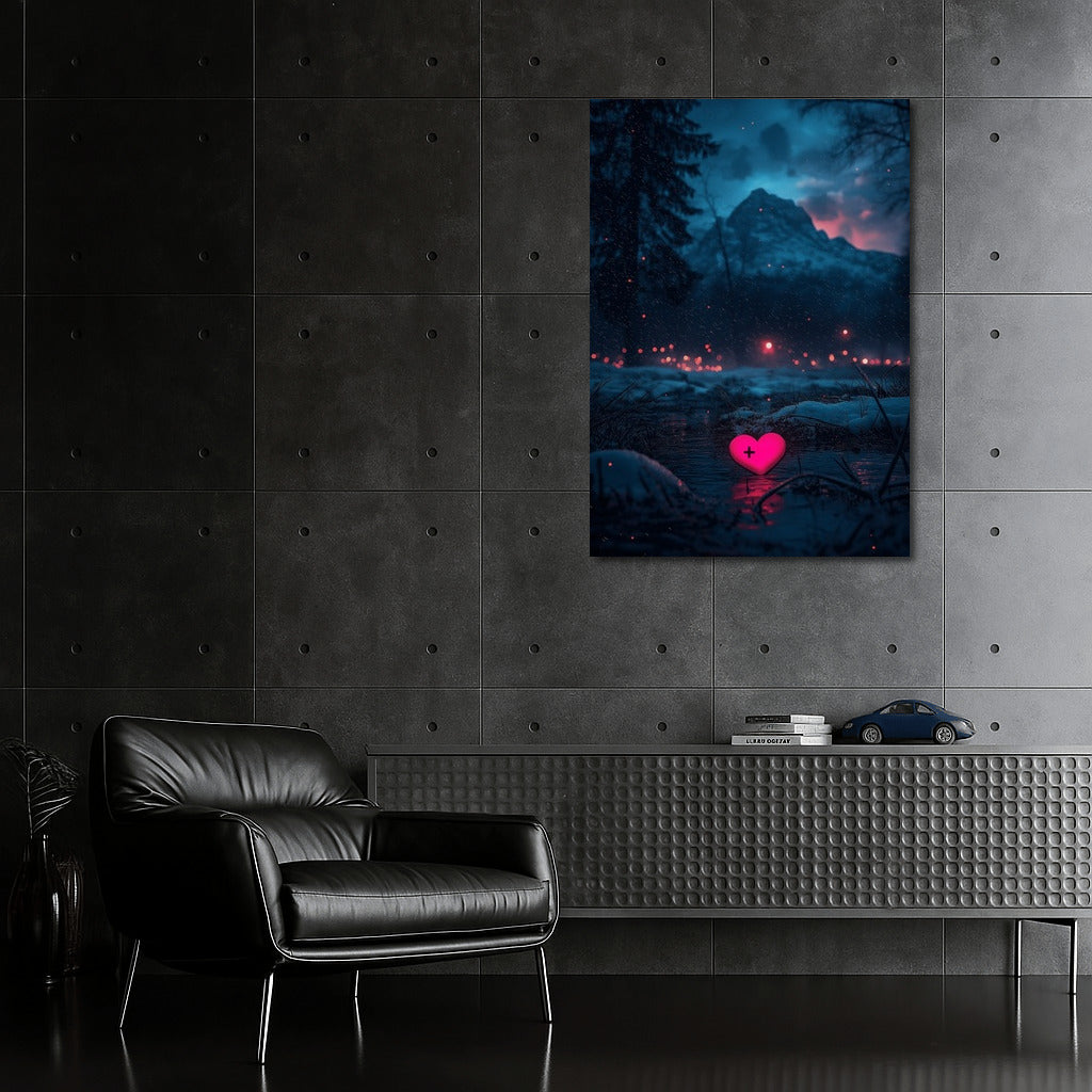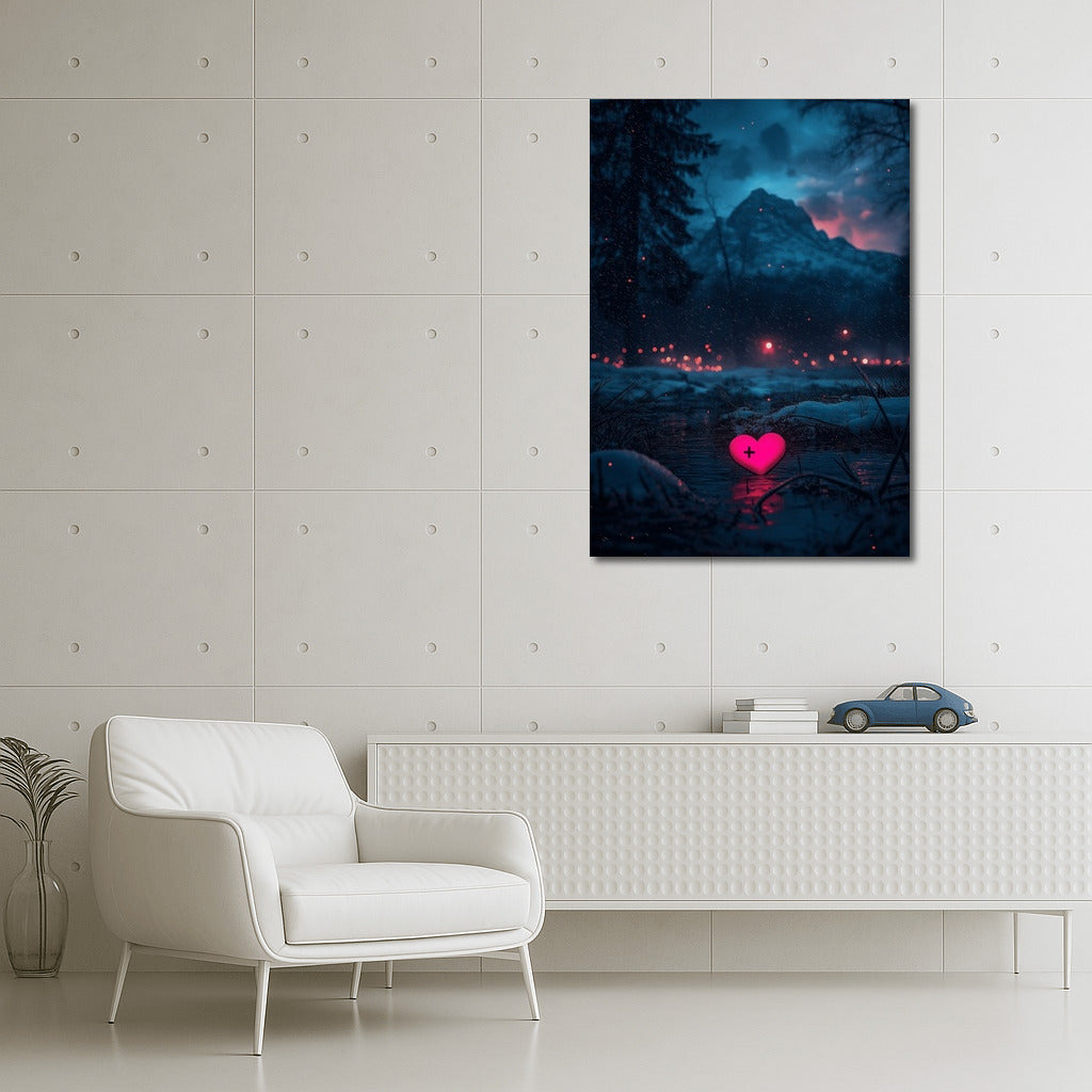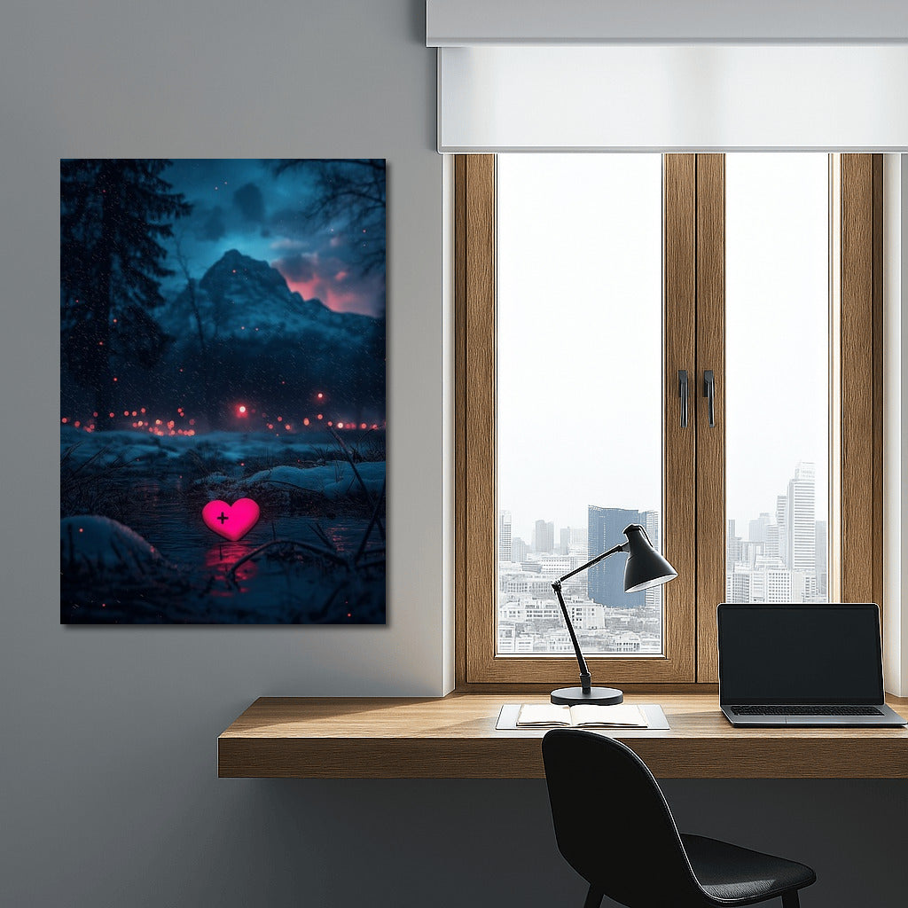 Immerse yourself in the magic of this painting: the glowing heart creates a fairy tale atmosphere in a winter landscape. Perfect wall art! See more from the collection: Mixed Wall Art