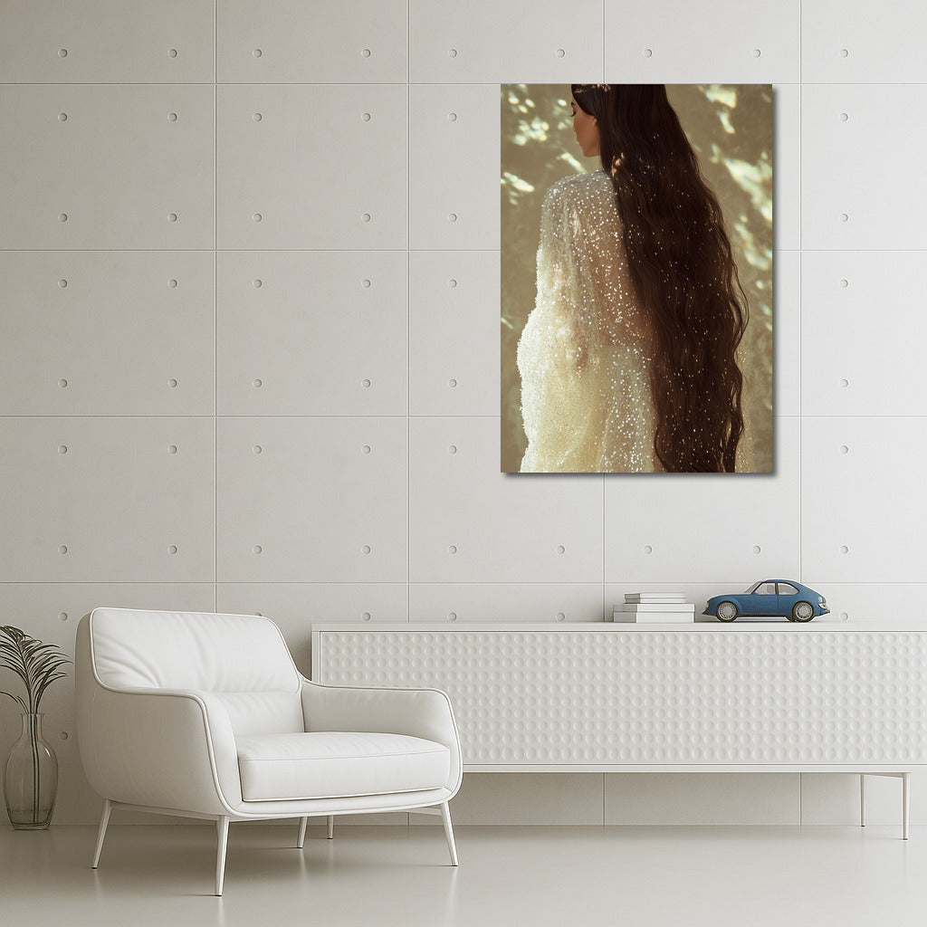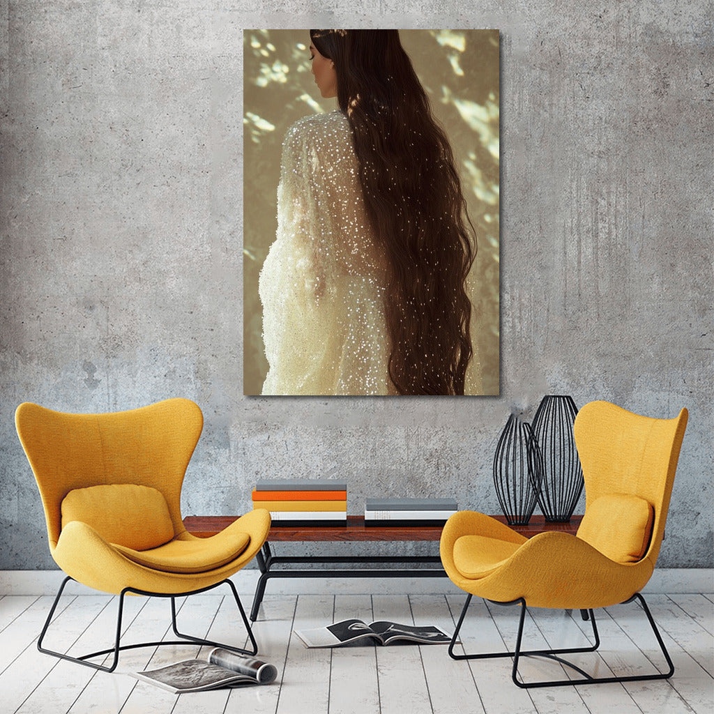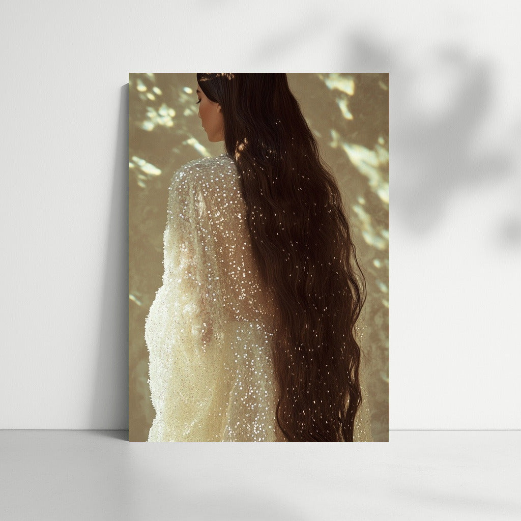 An elegant painting of a girl in a shimmering dress, immersed in light and shadow. A poster that adds mystery to your space. See more from the collection: Wall Art with Women