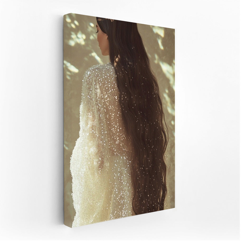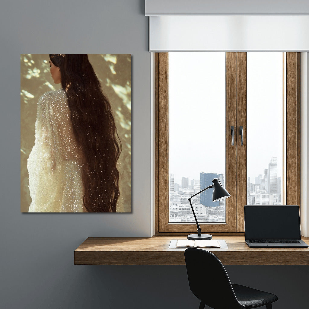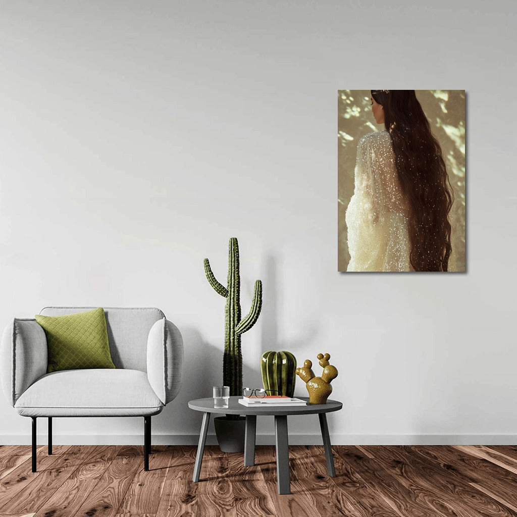 An elegant painting of a girl in a shimmering dress, immersed in light and shadow. A poster that adds mystery to your space. See more from the collection: Wall Art with Women
