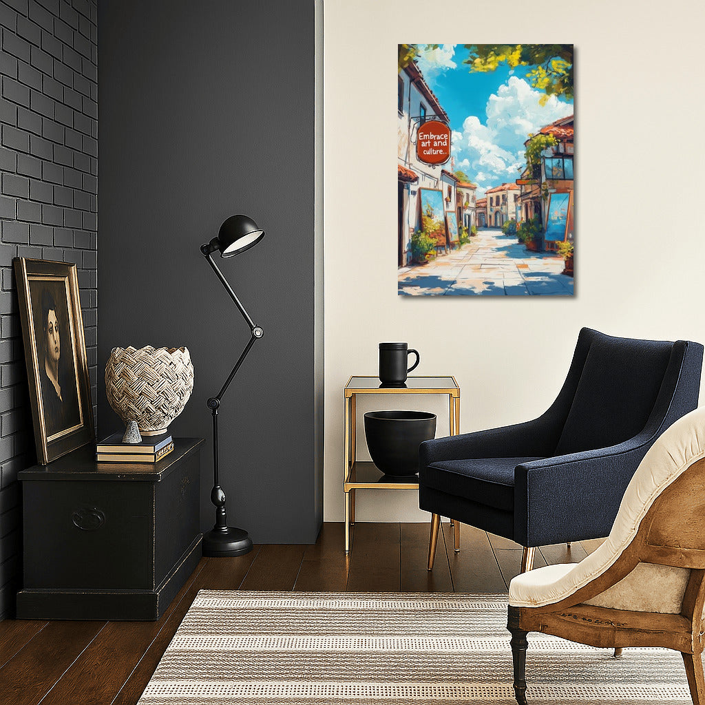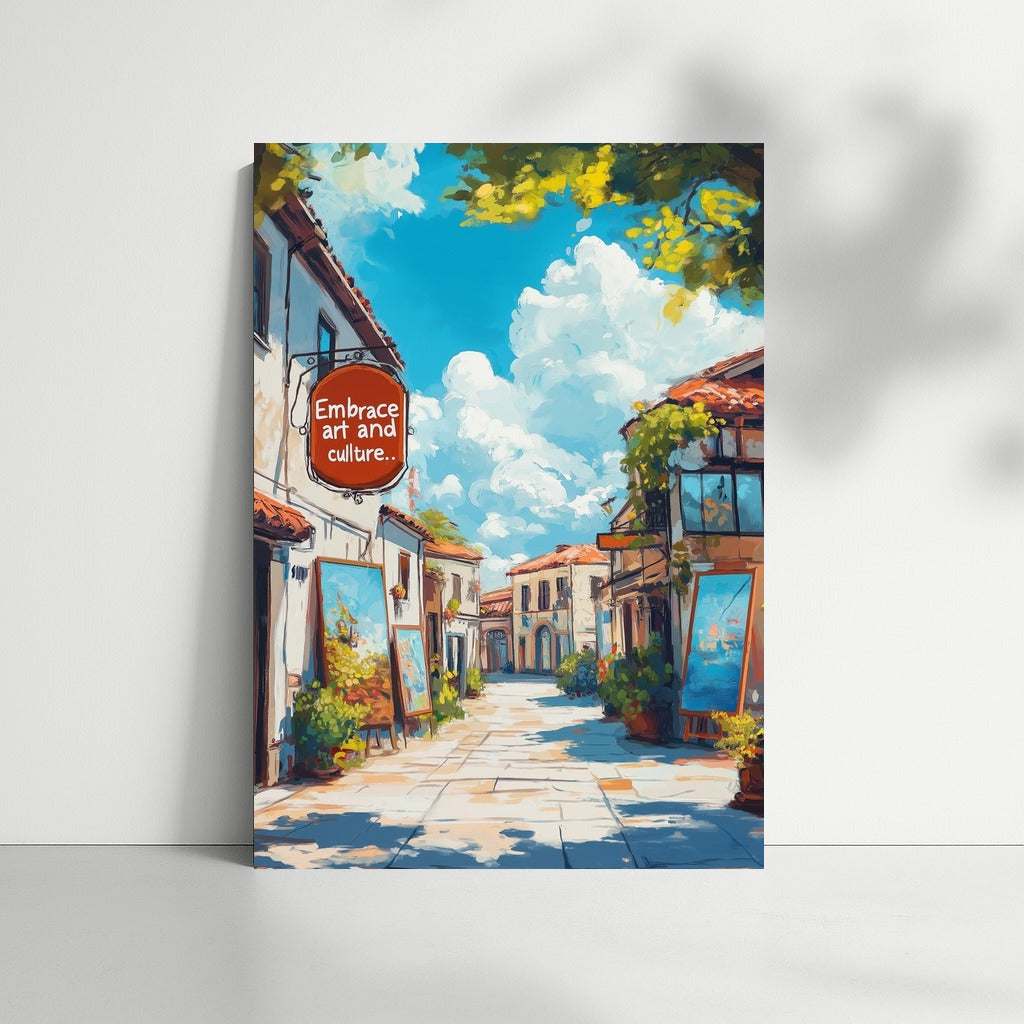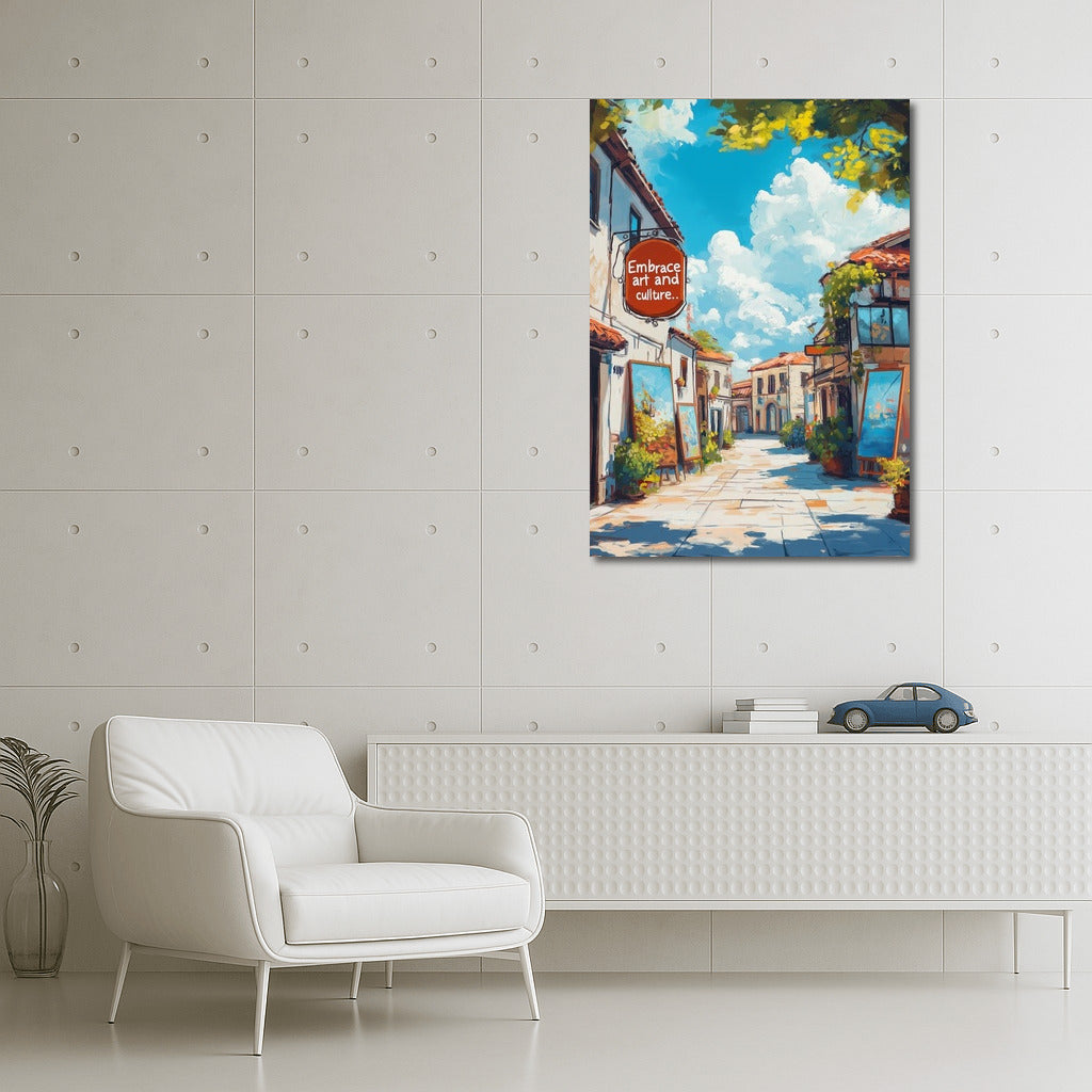 A cozy street with paintings under a blue sky - conveys the atmosphere of art and culture. The perfect poster for inspiration! See more from the collection: Architectural Art