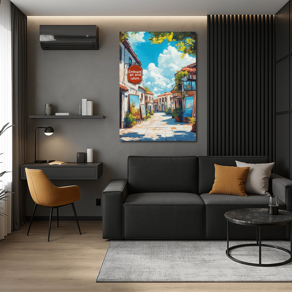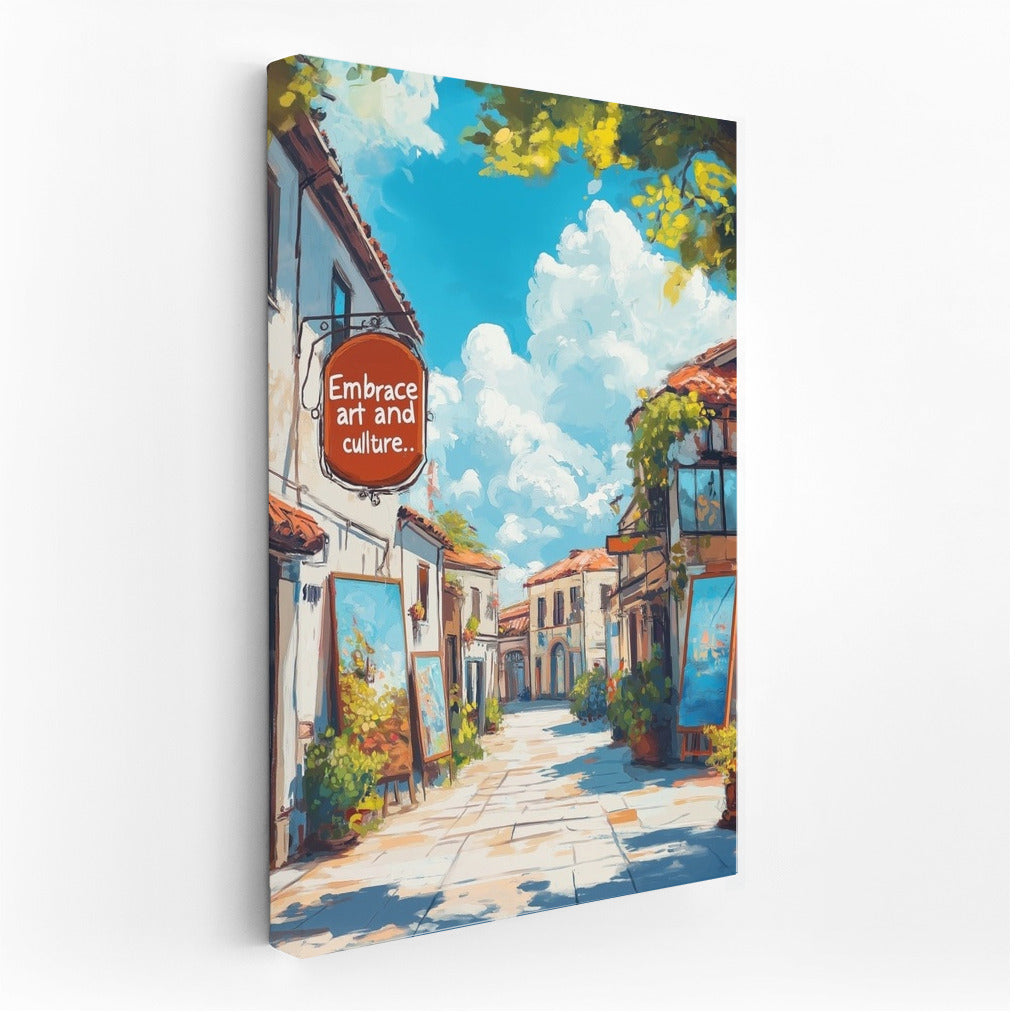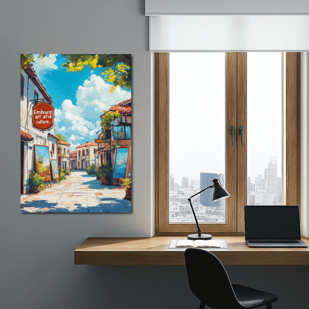 A cozy street with paintings under a blue sky - conveys the atmosphere of art and culture. The perfect poster for inspiration! See more from the collection: Architectural Art