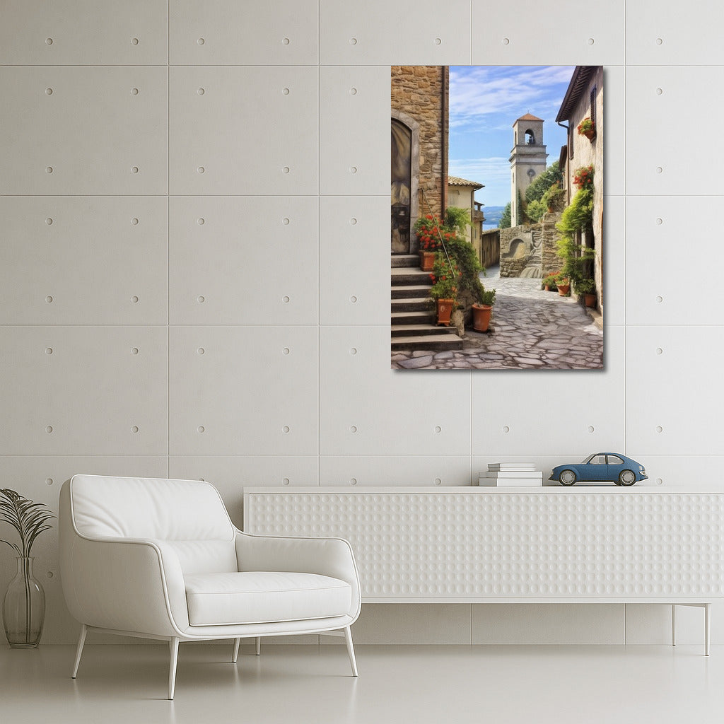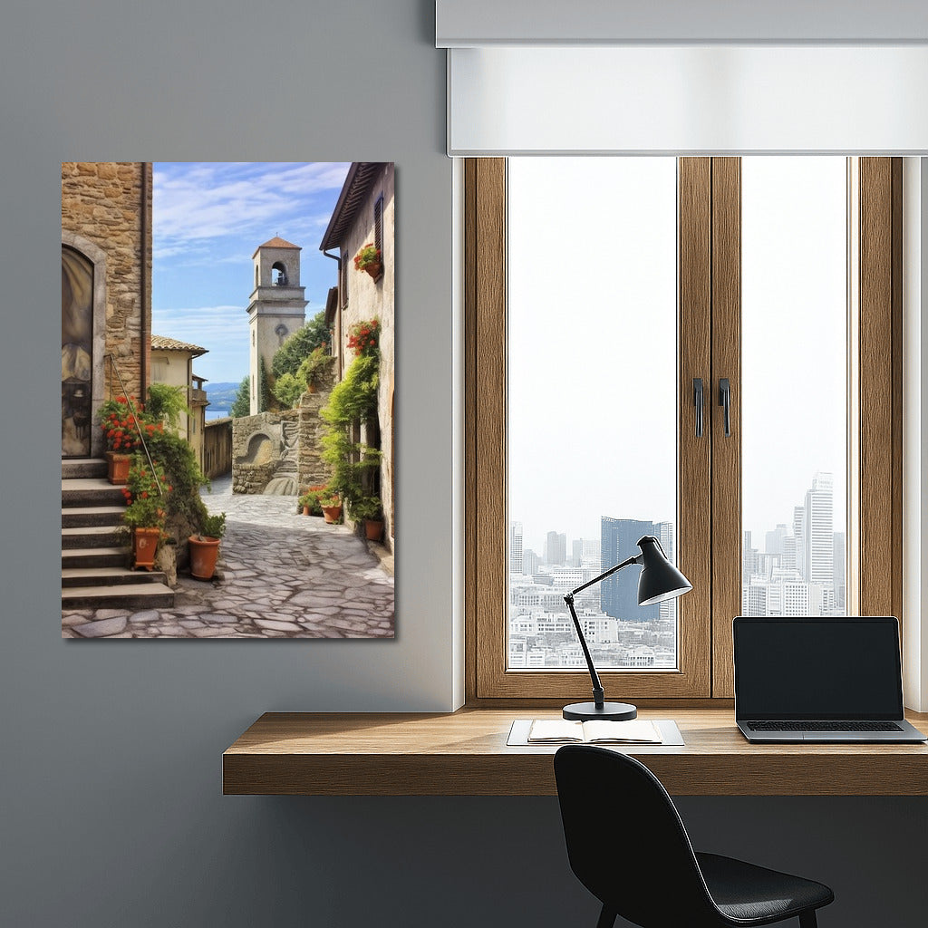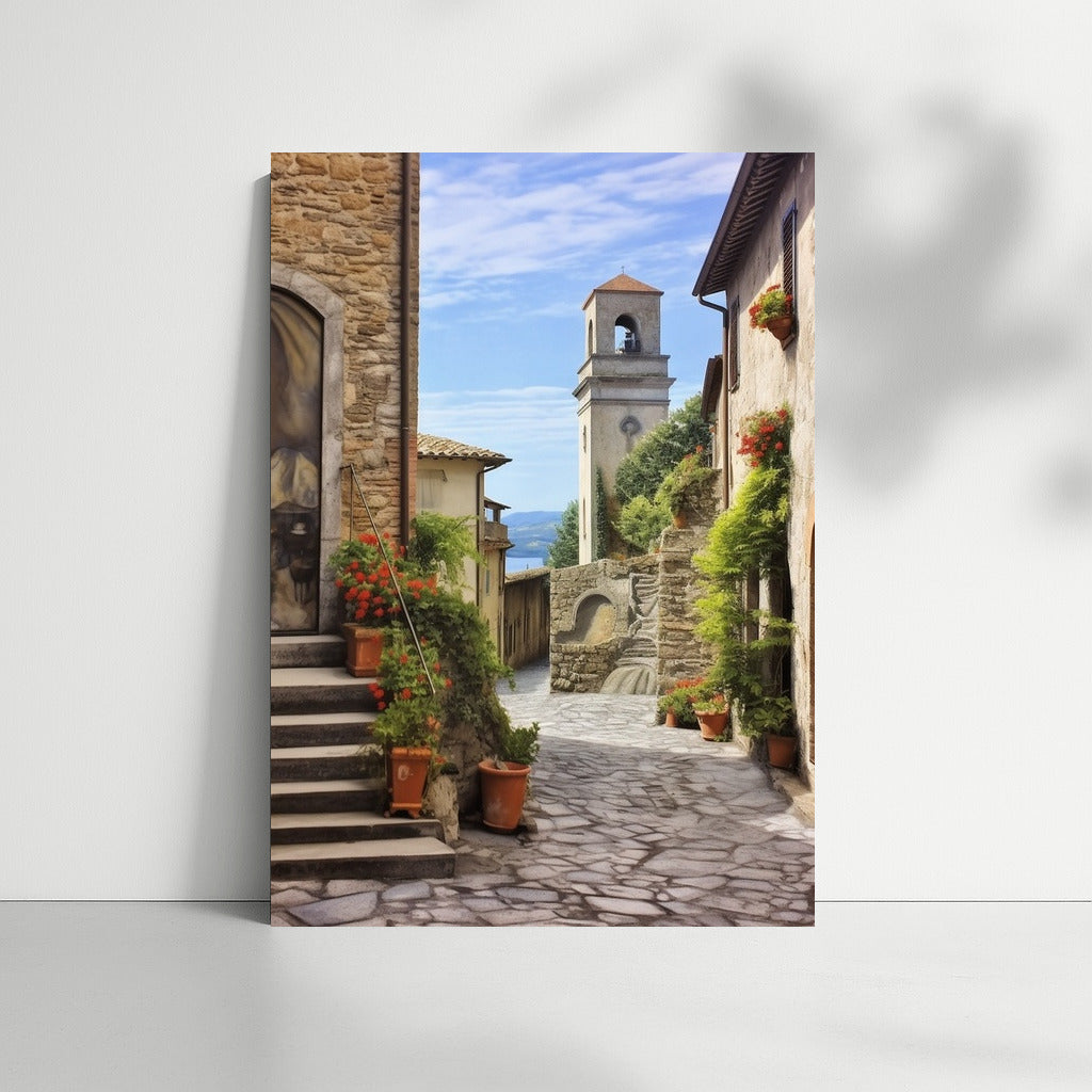 A cozy street leads to an ancient tower, personifying the silence and beauty of a summer morning. An ideal poster for the coziness of your home. See more from the collection: Mixed Wall Art
