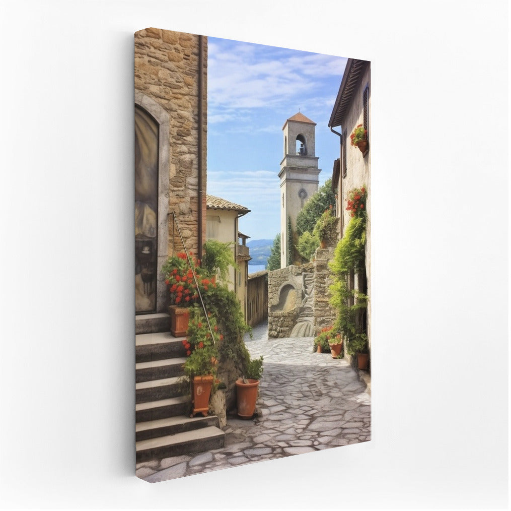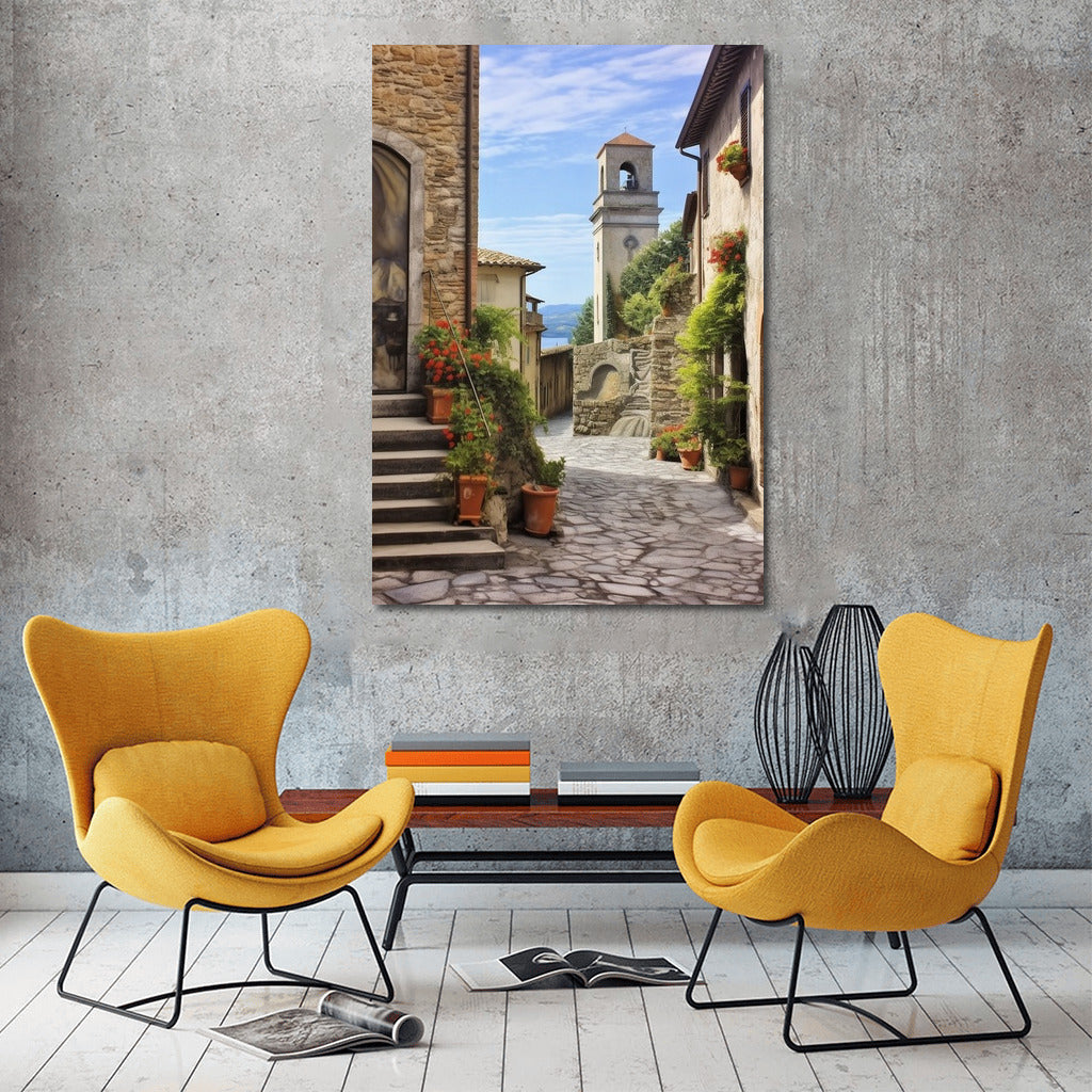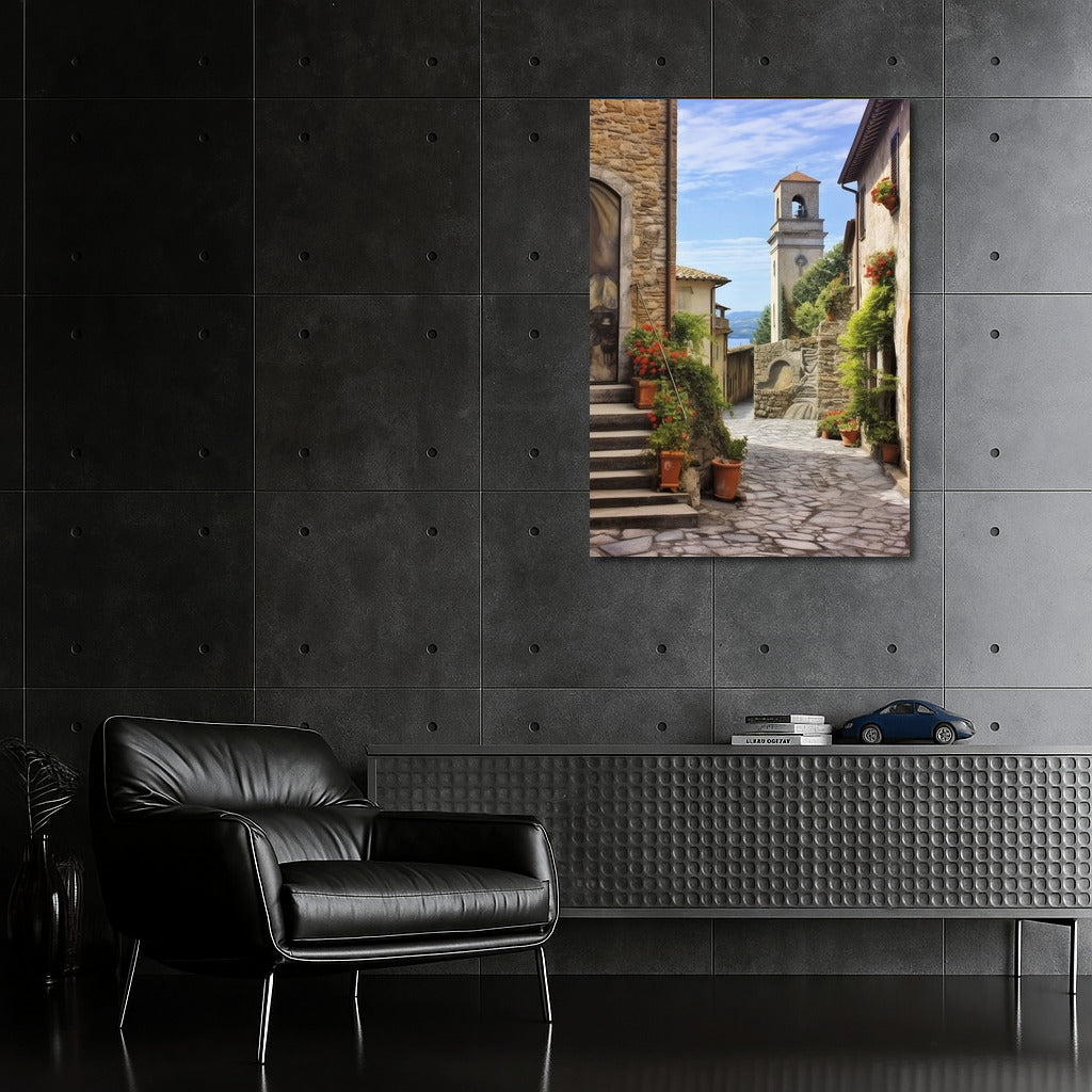 A cozy street leads to an ancient tower, personifying the silence and beauty of a summer morning. An ideal poster for the coziness of your home. See more from the collection: Mixed Wall Art