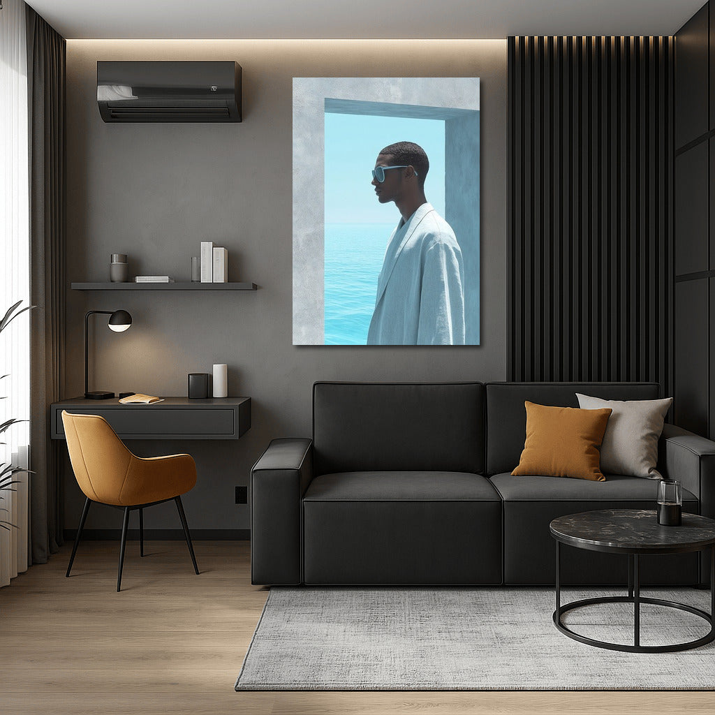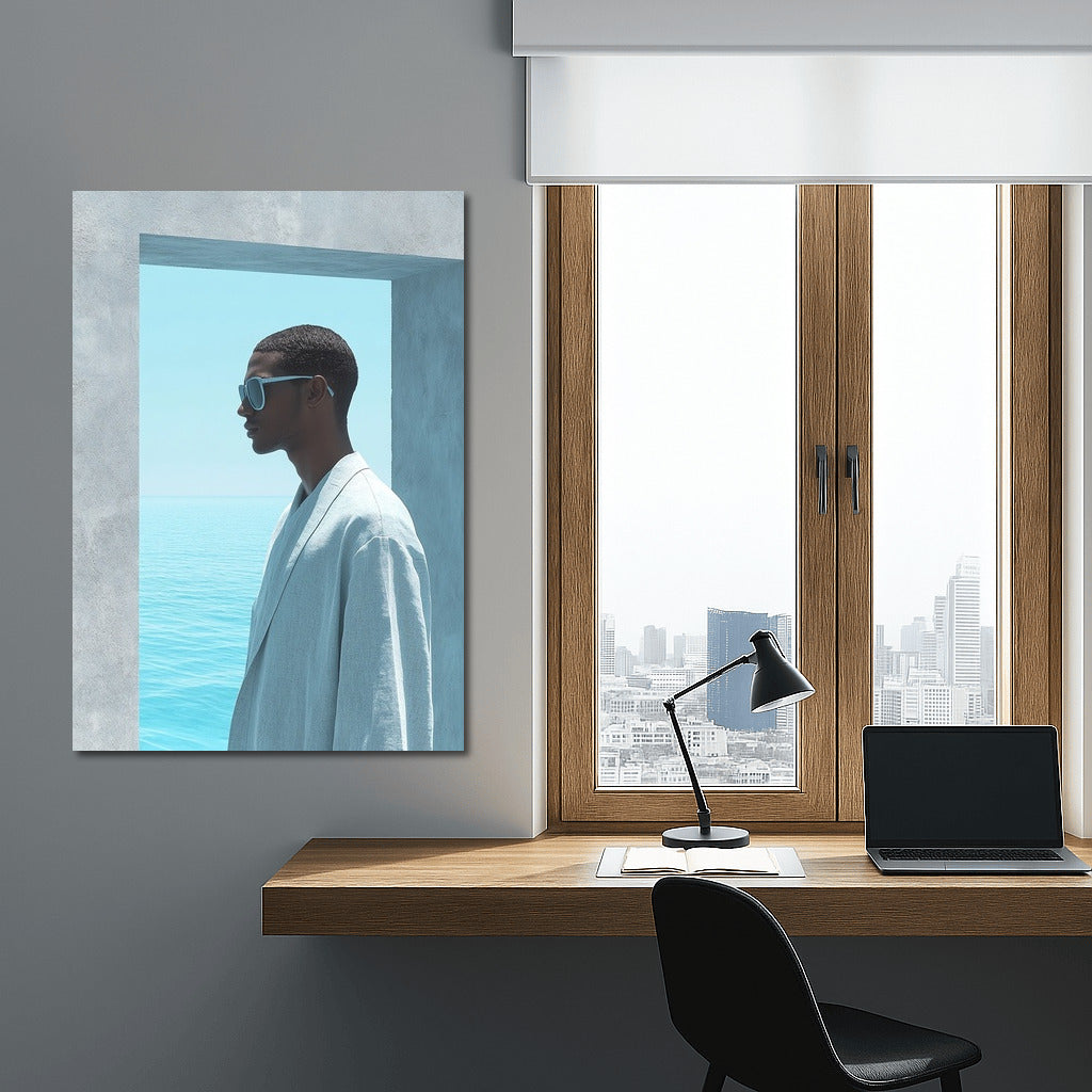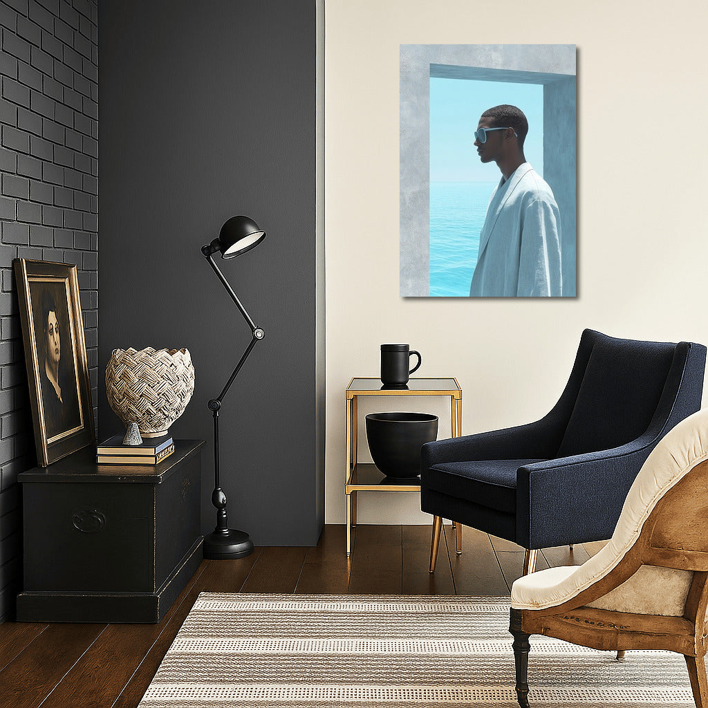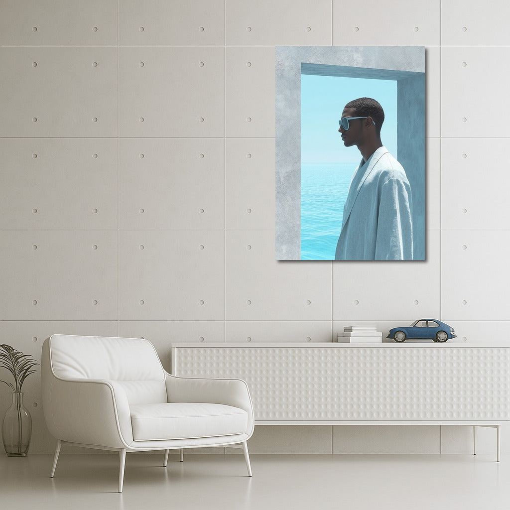 Poster with a dreamy figure by the sea: minimalism and tranquility. Wall art that takes you to a world of serenity. See more from the collection: Fashion Art