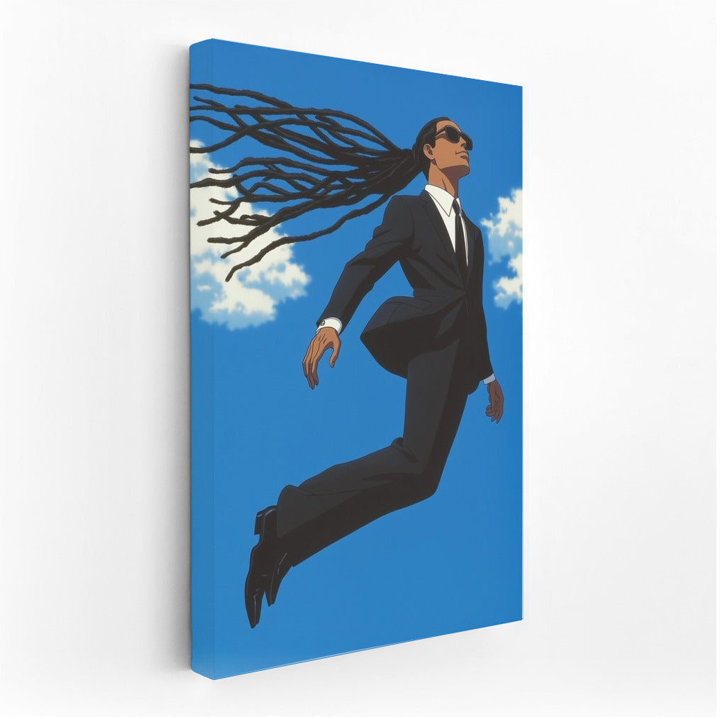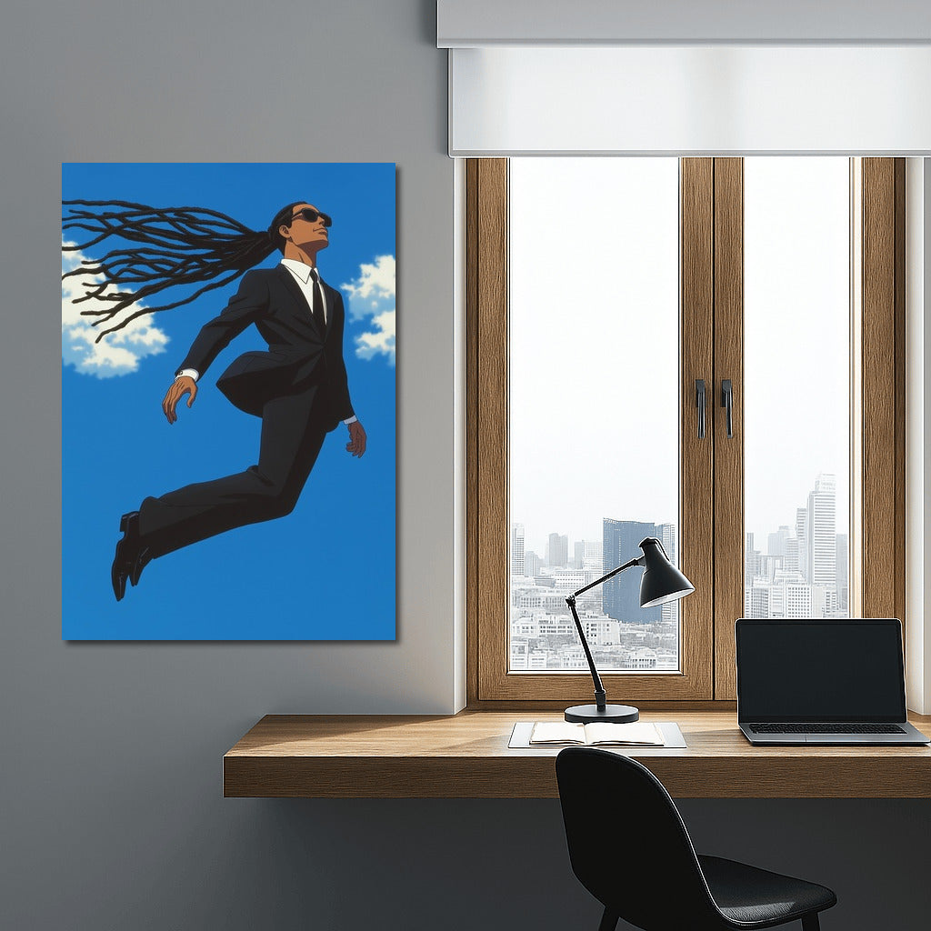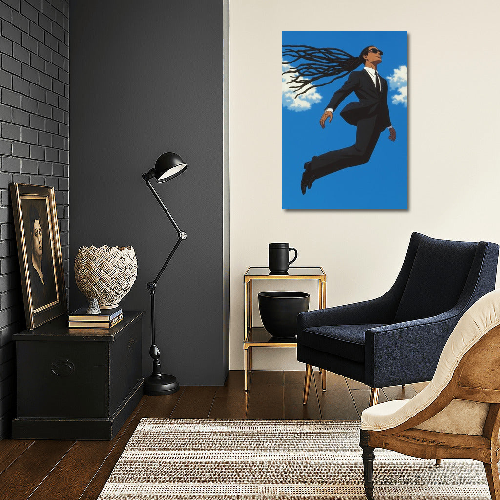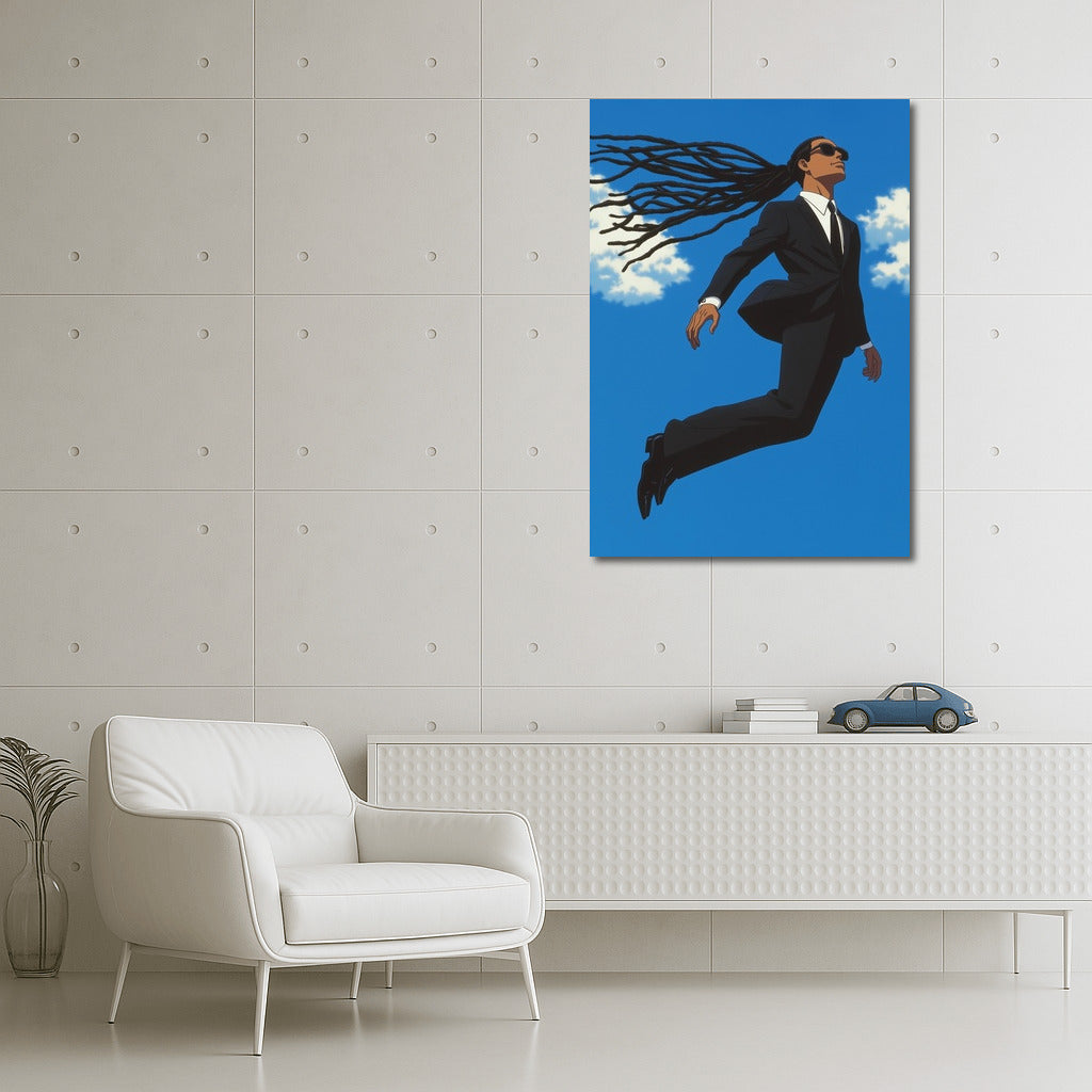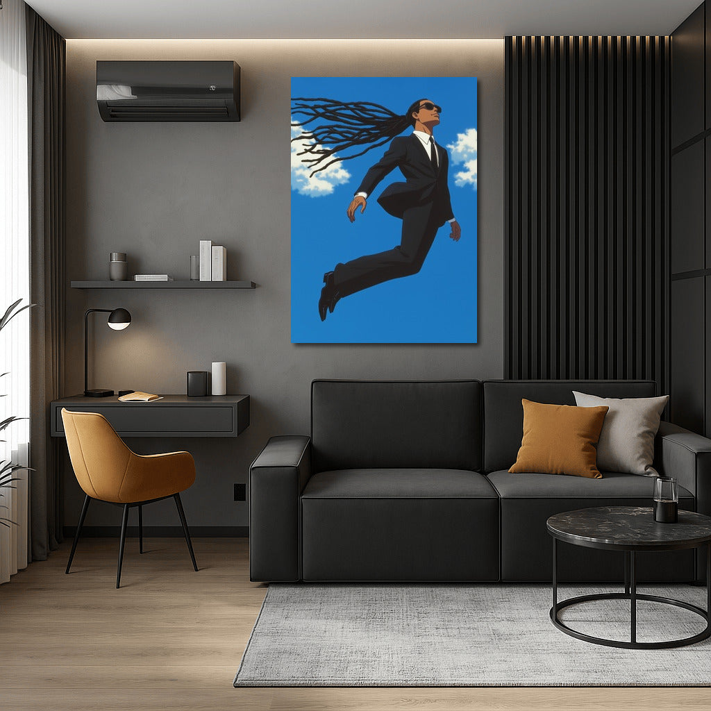 Abstract painting: character in suit soars in the sky. Contemporary wall art for dreamers and freedom seekers. See more from the collection: Mixed Wall Art