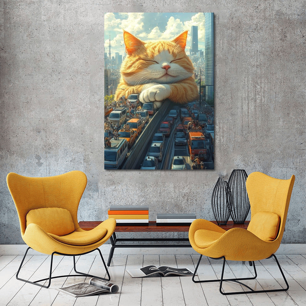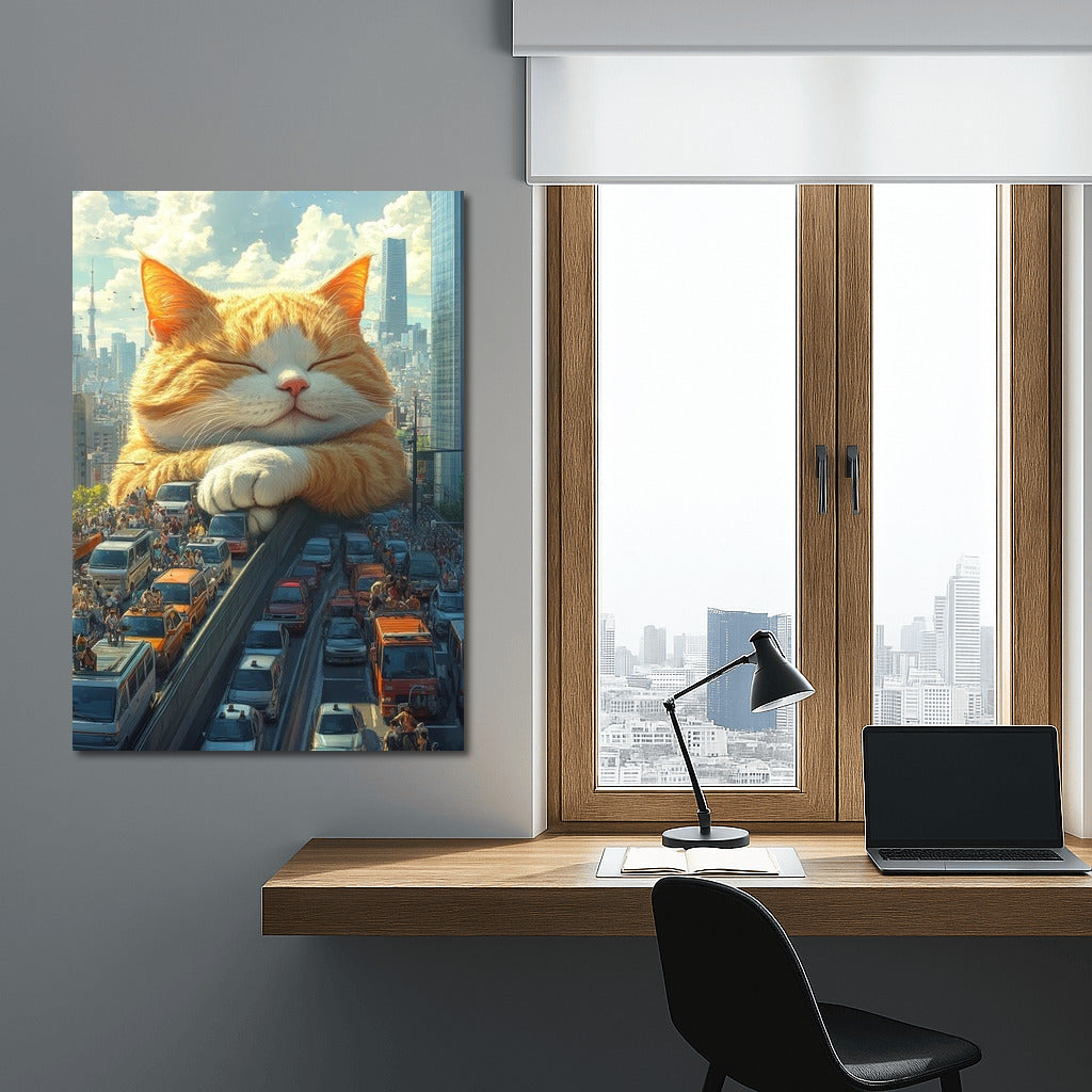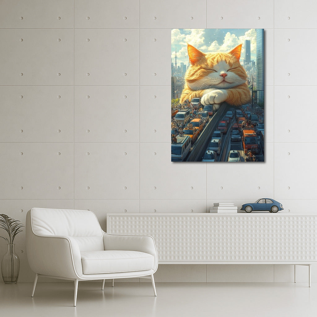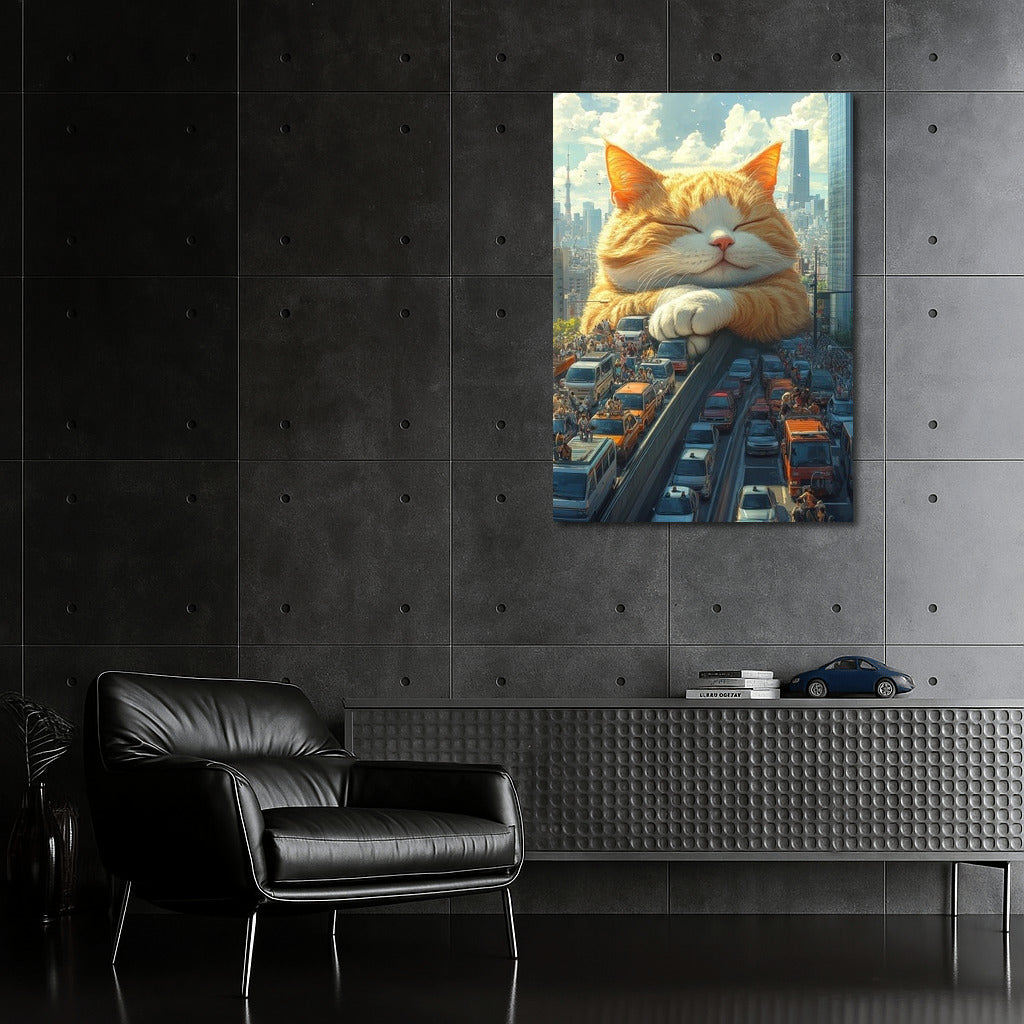 A charming giant cat is dozing in a bustling metropolis. This poster will add fun and originality to your interior! See more from the collection: Animals Art