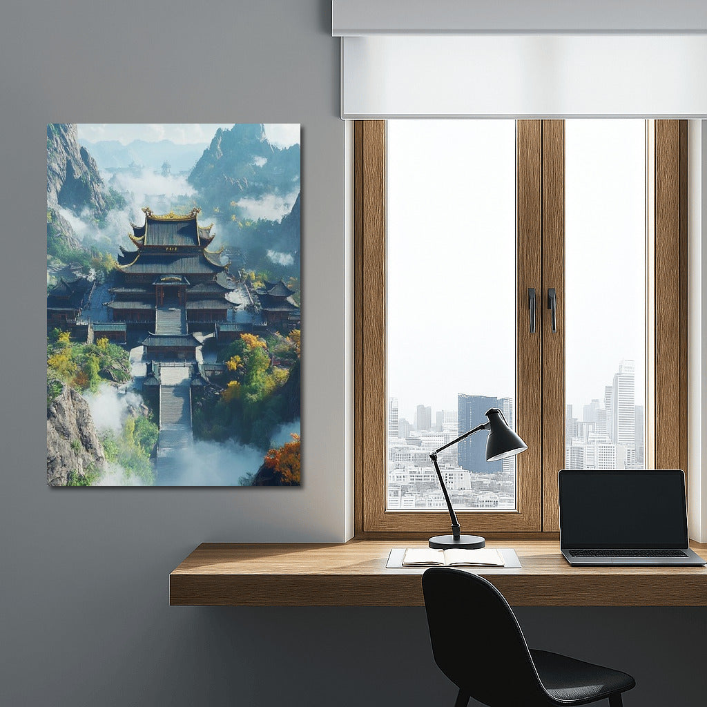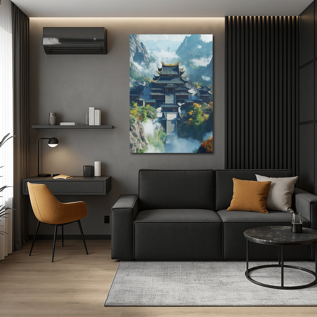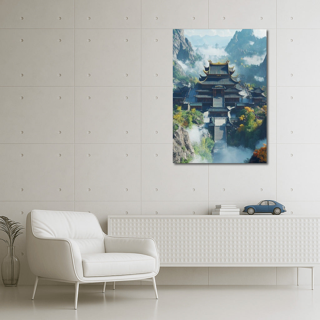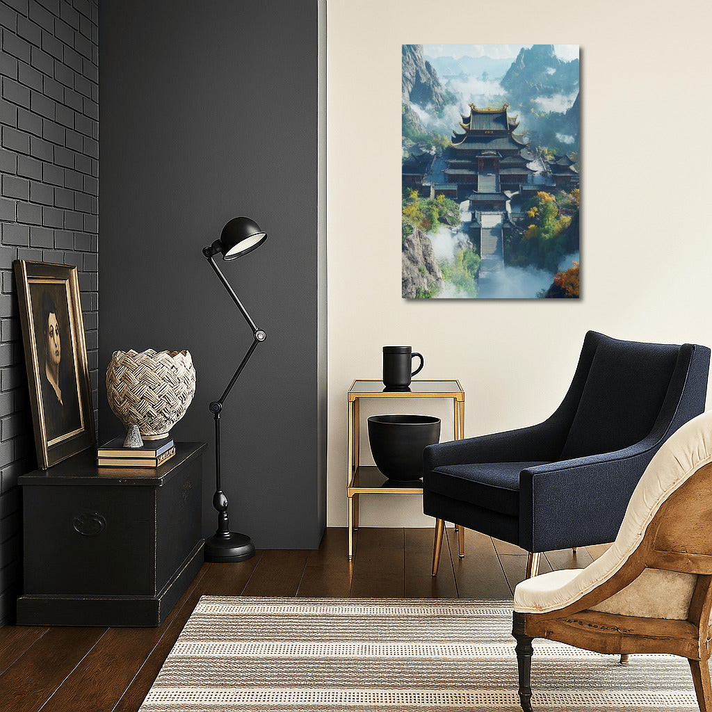 Eastern magic on canvas: a majestic temple among the mountains. Ideal wall art to create an atmosphere of peace and grandeur. See more from the collection: Mixed Wall Art