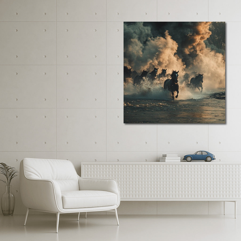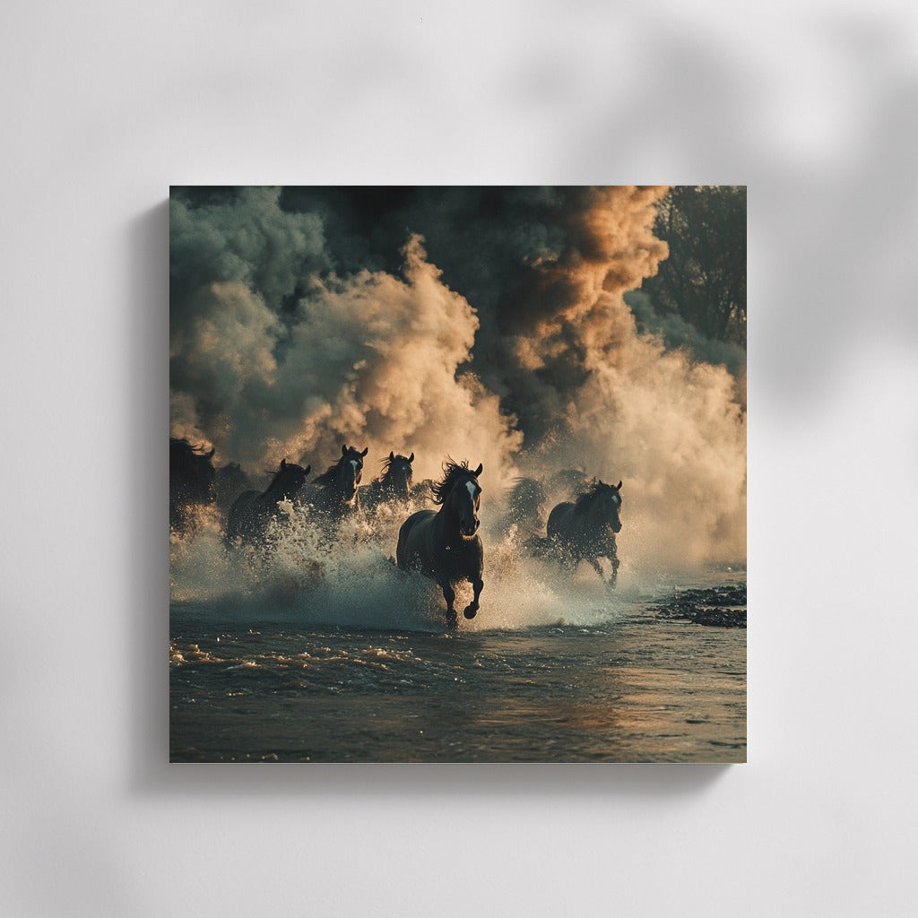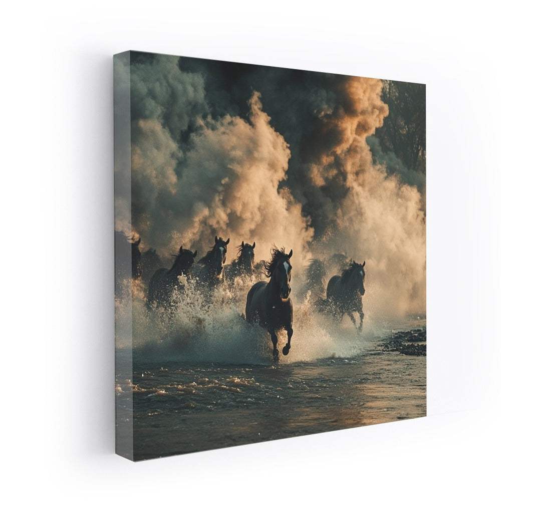 A wild herd running through a veil of water and clouds of dust. This poster will fill your space with dynamics and drama. See more from the collection: Animals Art