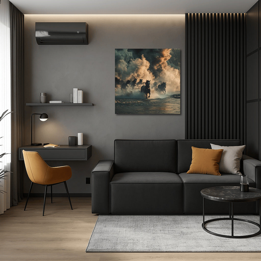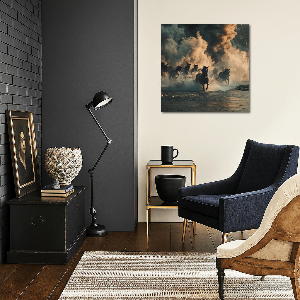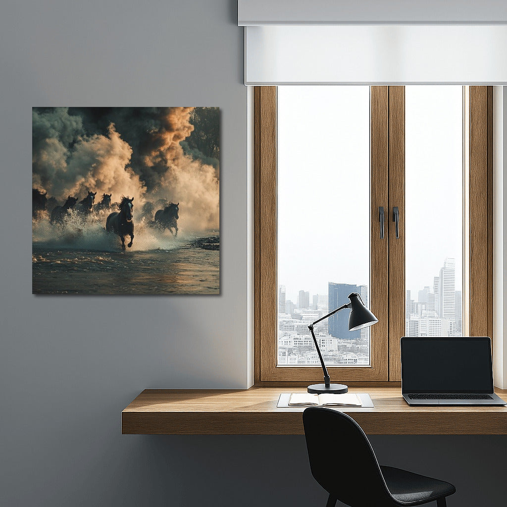 A wild herd running through a veil of water and clouds of dust. This poster will fill your space with dynamics and drama. See more from the collection: Animals Art