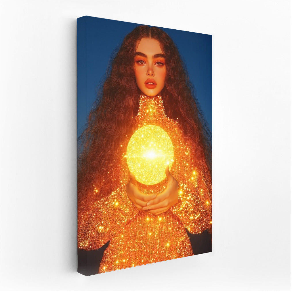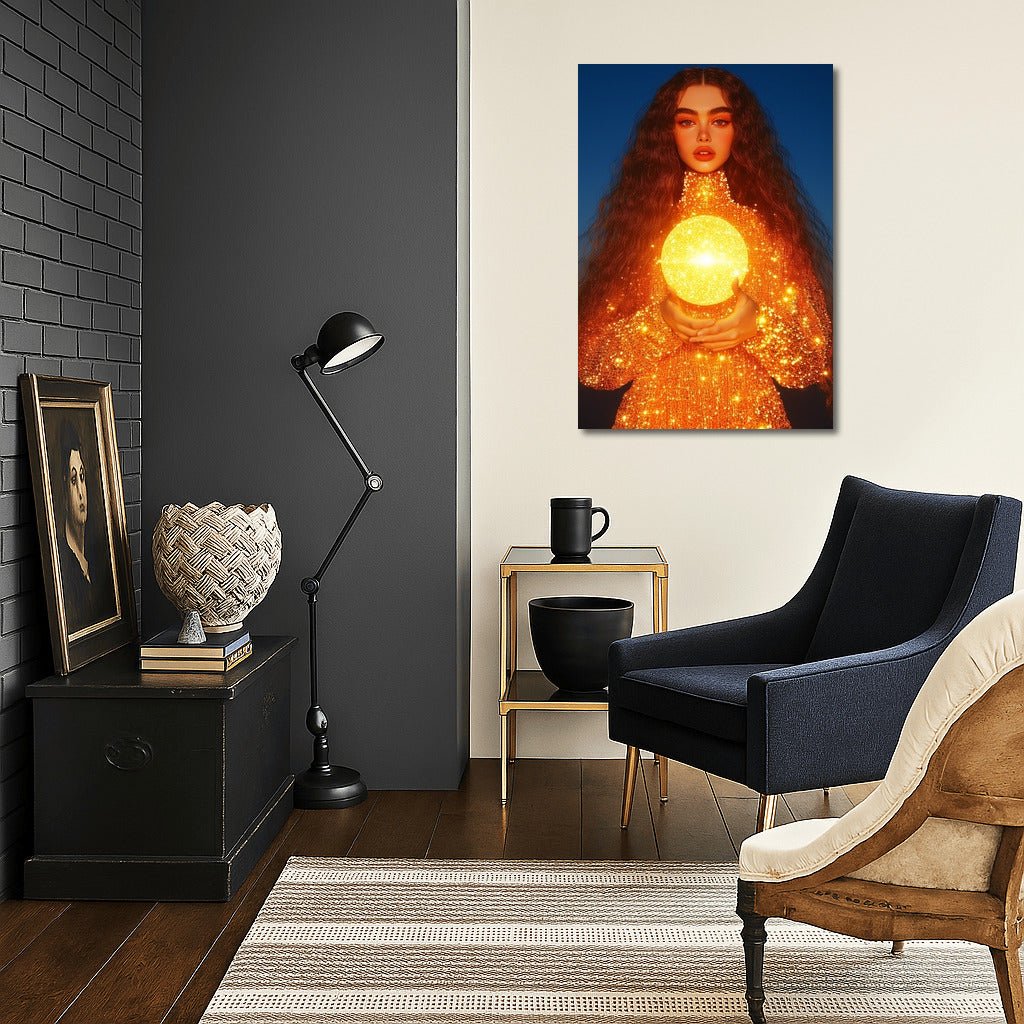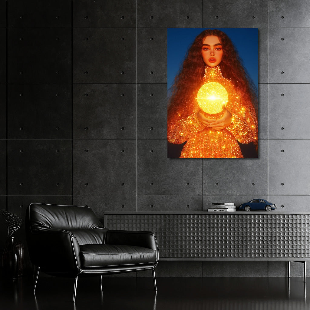 A mysterious figure holds a shining sun in his hands, mixing dream and reality. The perfect poster for your interior! ✨ See more from the collection: Wall Art with Women