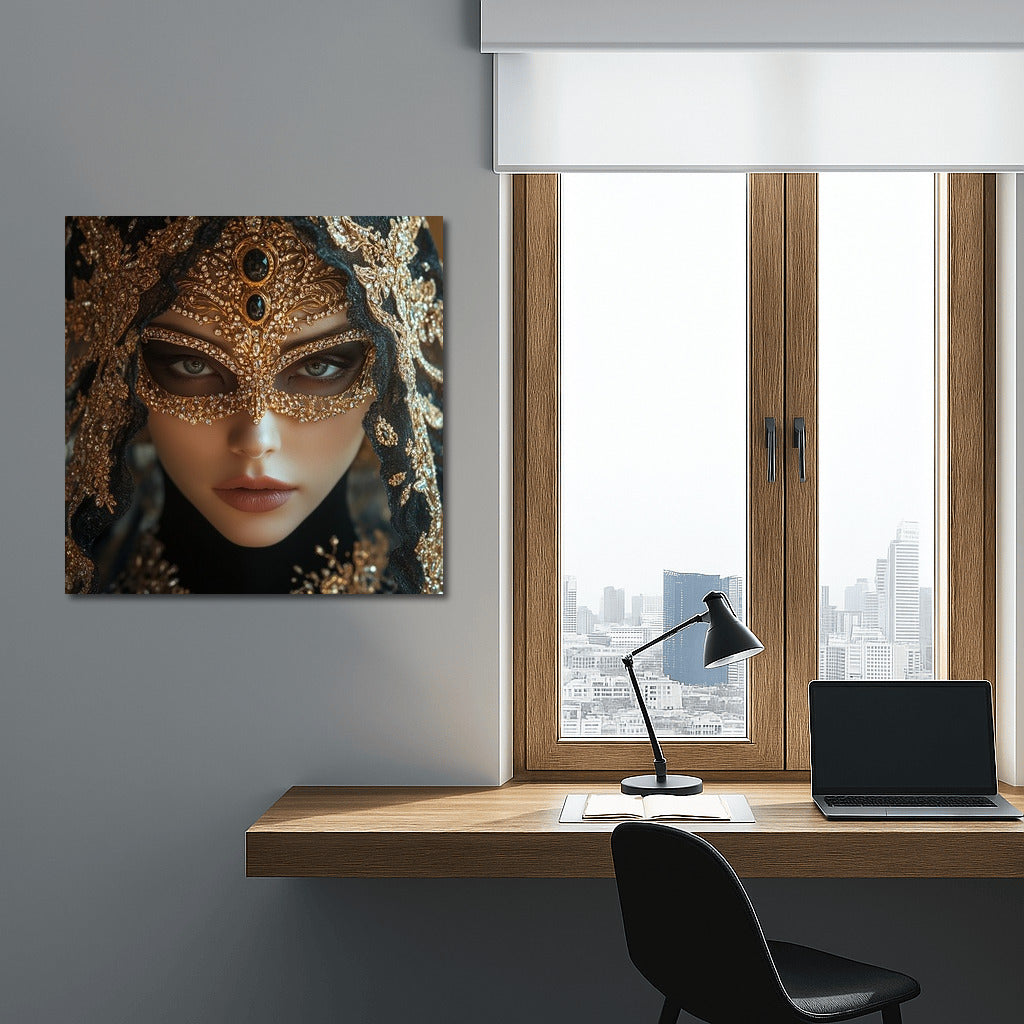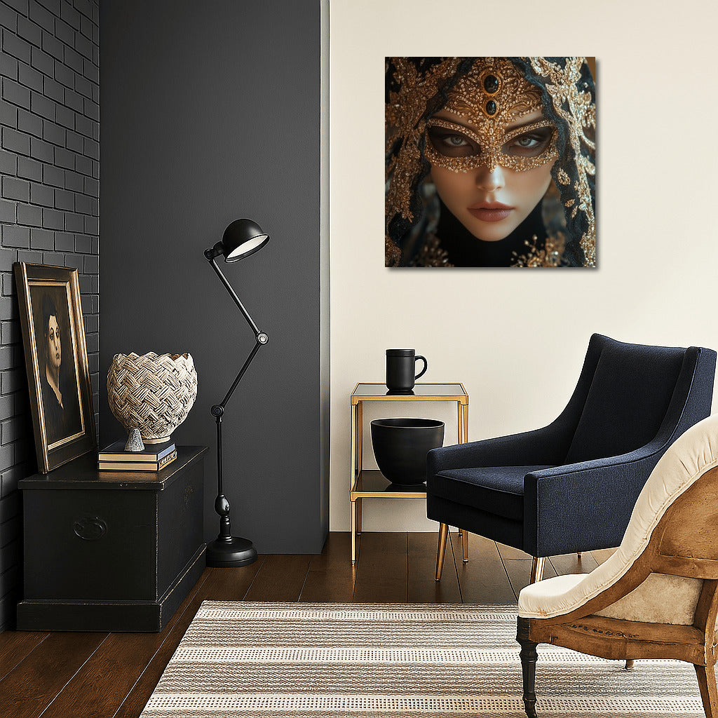 Mysterious wall art: luxurious mask, golden patterns and mysterious gaze create an atmosphere of mystical elegance. See more from the collection: Wall Art with Women