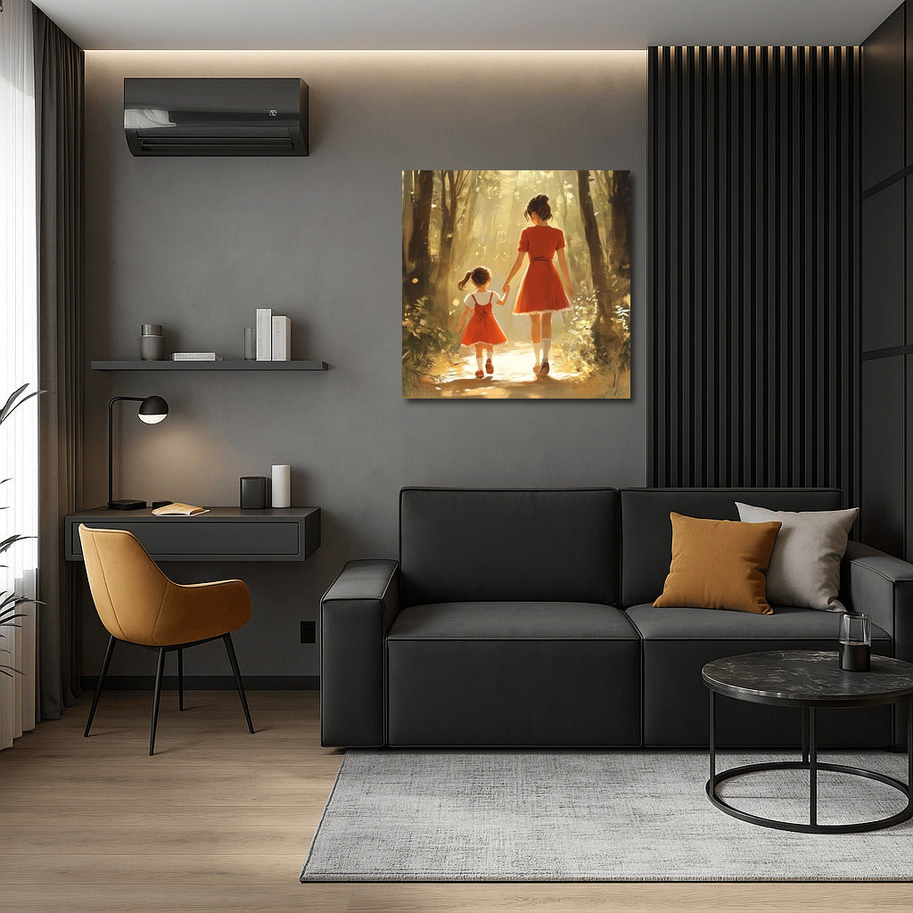 A heartfelt painting: a light forest, two figures in red dresses walking hand in hand. The poster is filled with warmth and family comfort. See more from the collection: Mixed Wall Art