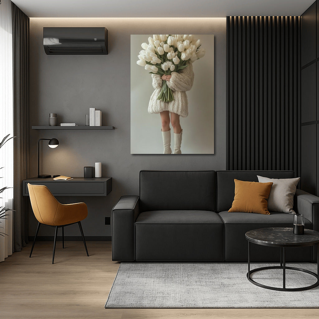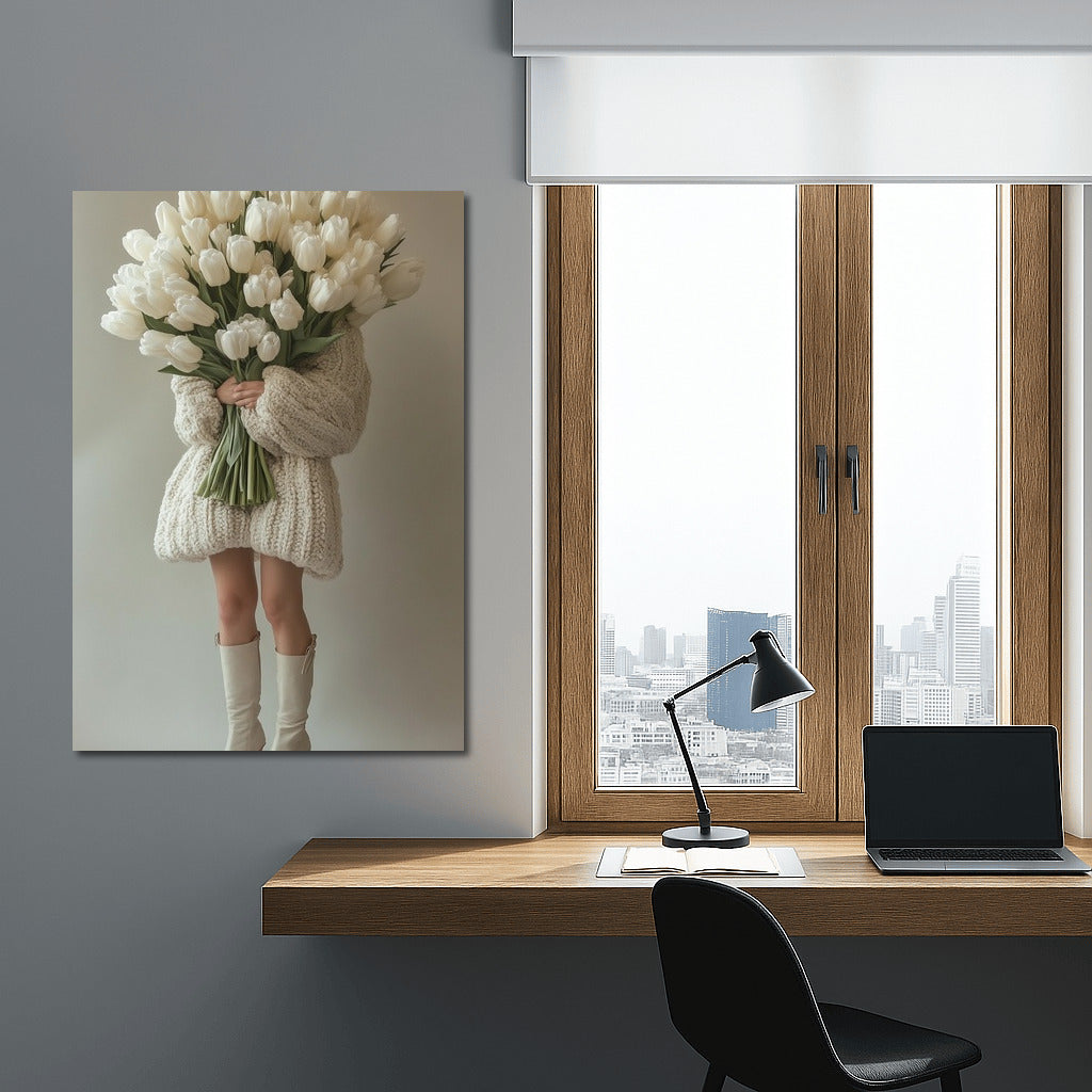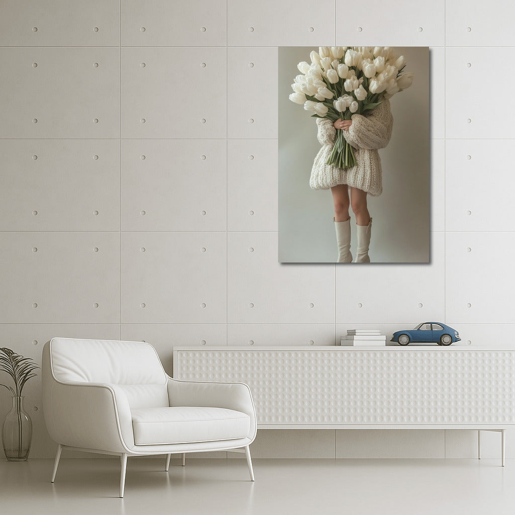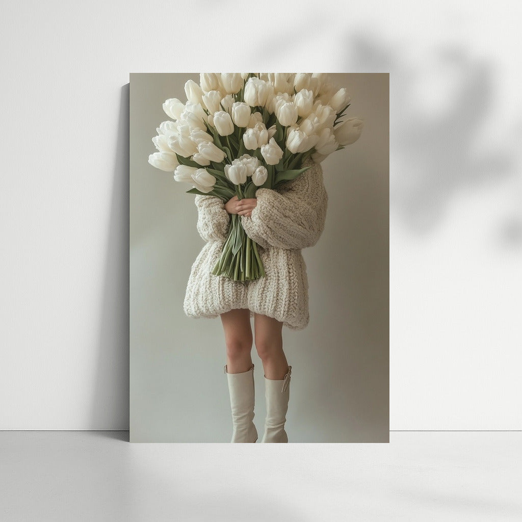 Elegant poster painting: a mysterious figure in a cozy sweater and a bouquet of white tulips. Modern wall art for your collection. See more from the collection: Mixed Wall Art