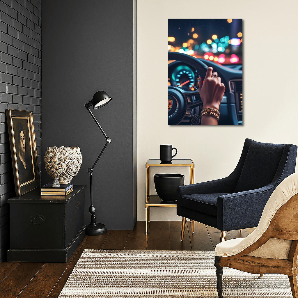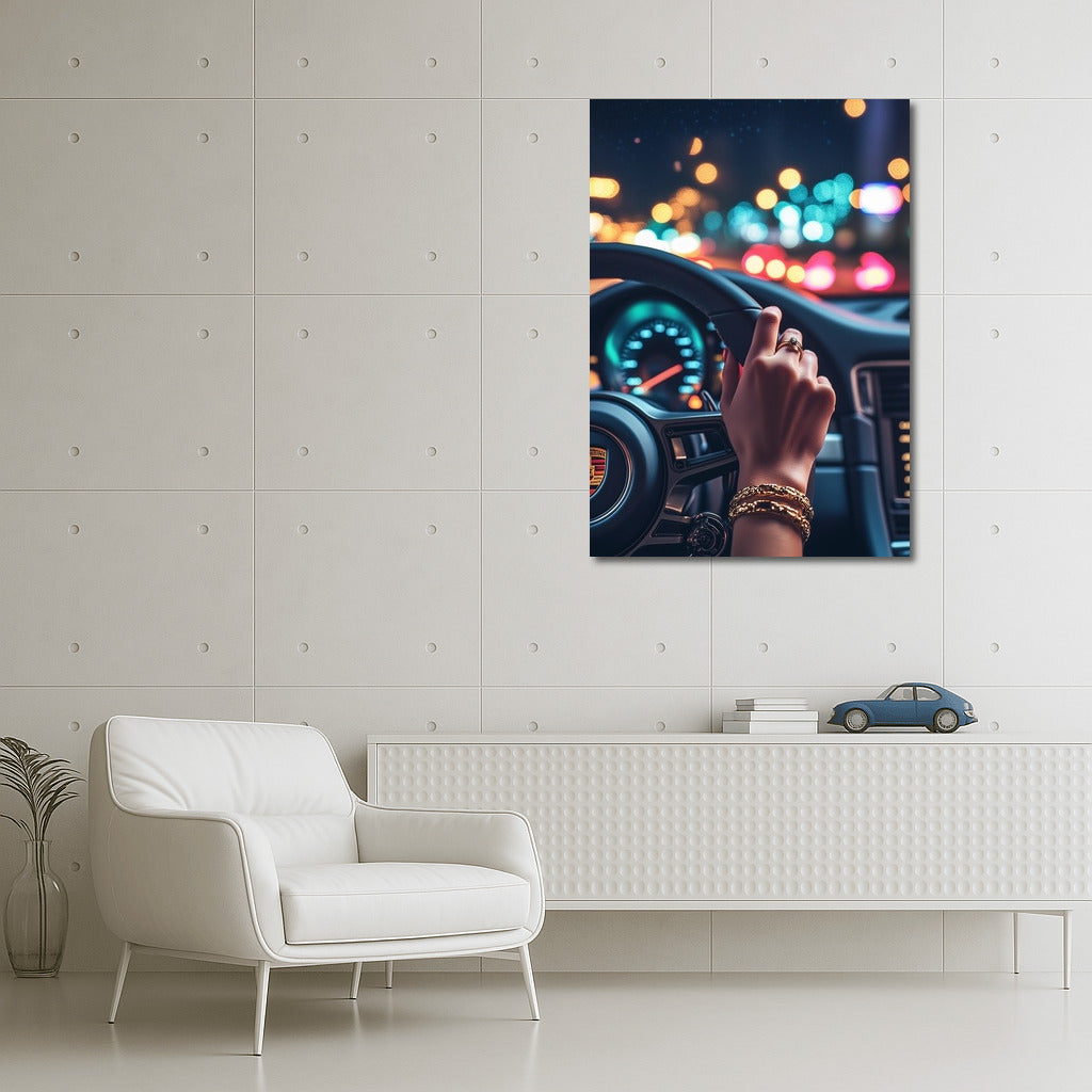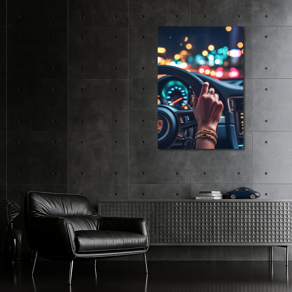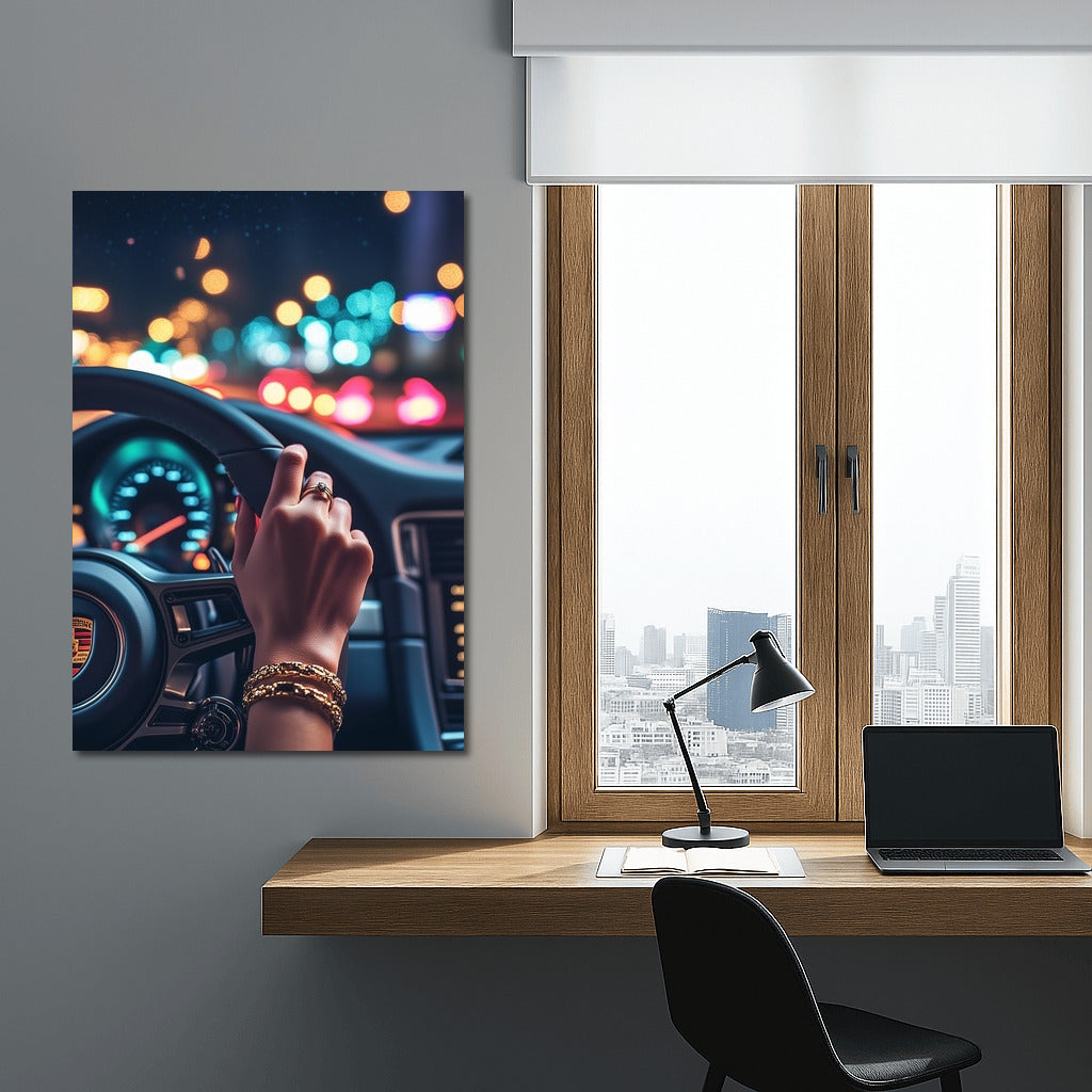 Night inspiration: stylish poster with a view of the Porsche steering wheel, immerse yourself in the atmosphere of movement and luxury. Wall art for every home! See more from the collection: Mixed Wall Art