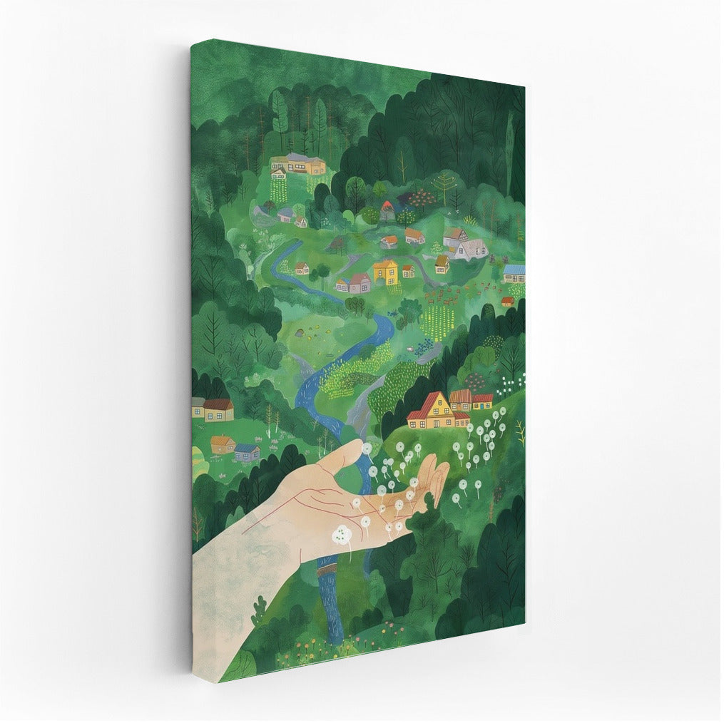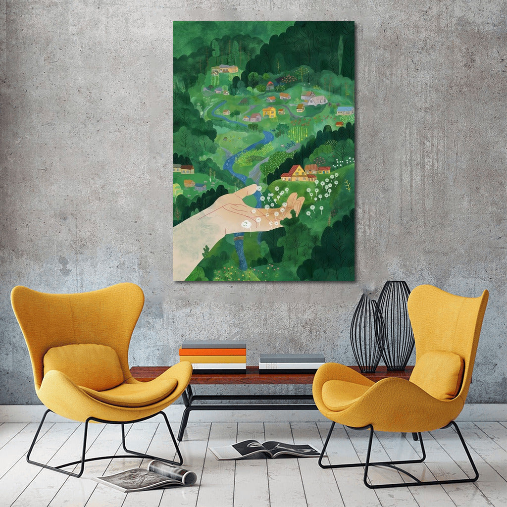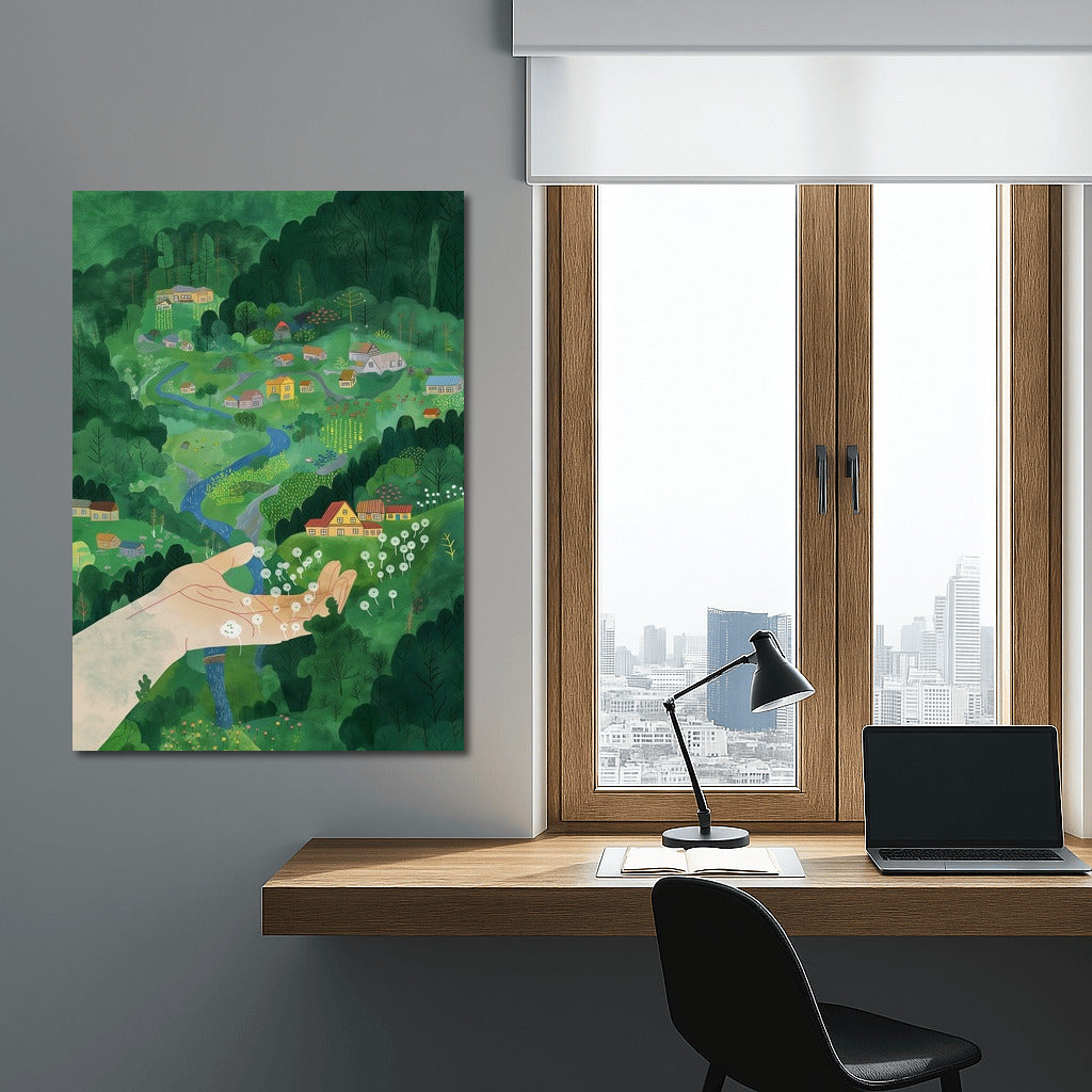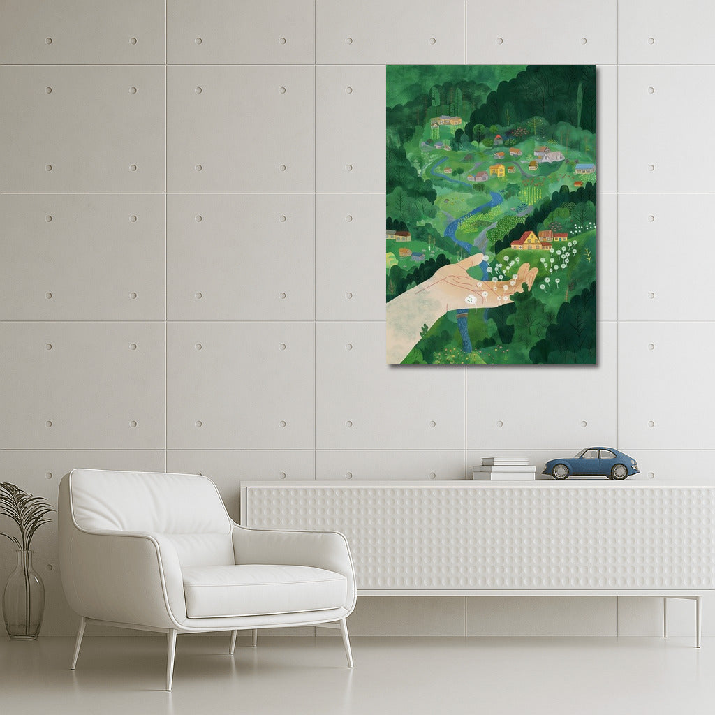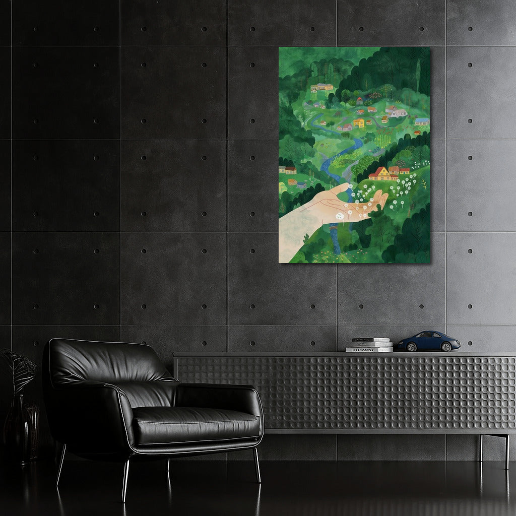 Open the door to the world of nature with this poster: a green forest, a calm river and a hand creating magic will enliven your space. See more from the collection: Mixed Wall Art