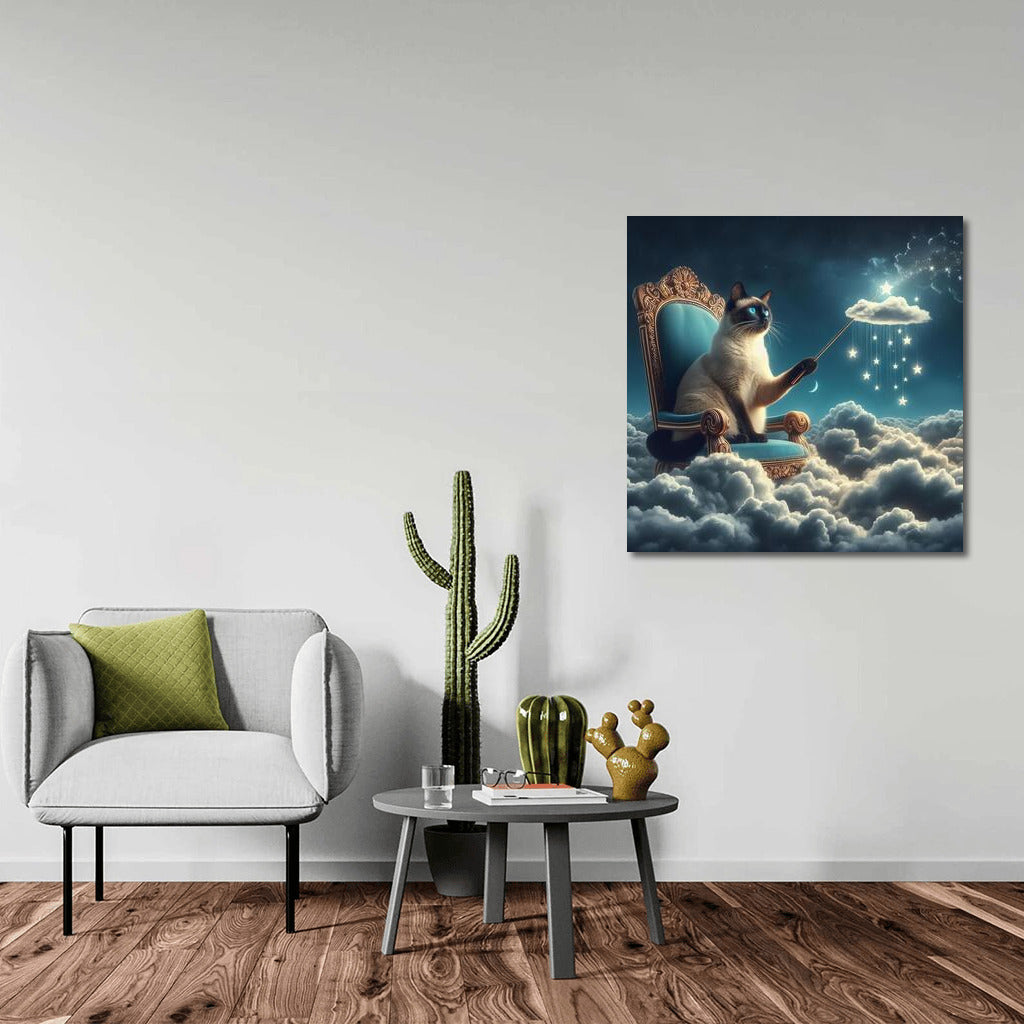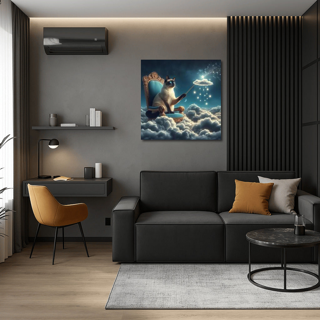 A graceful Siamese cat controls the weather from his throne of clouds. Mesmerizing wall art of dreams and magic. See more from the collection: Animals Art