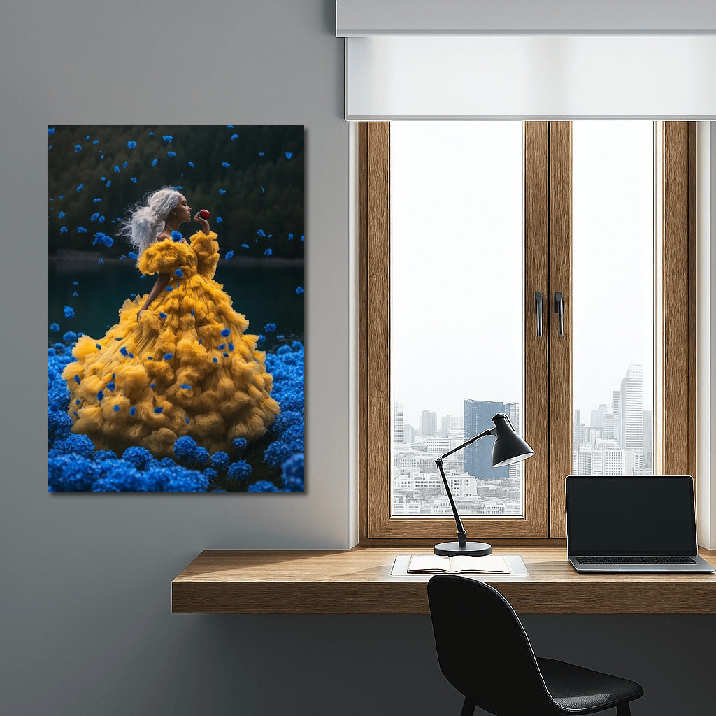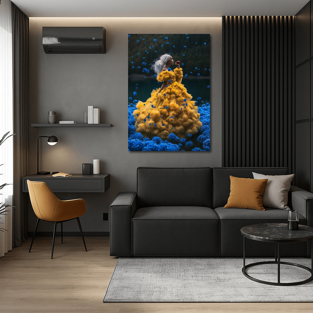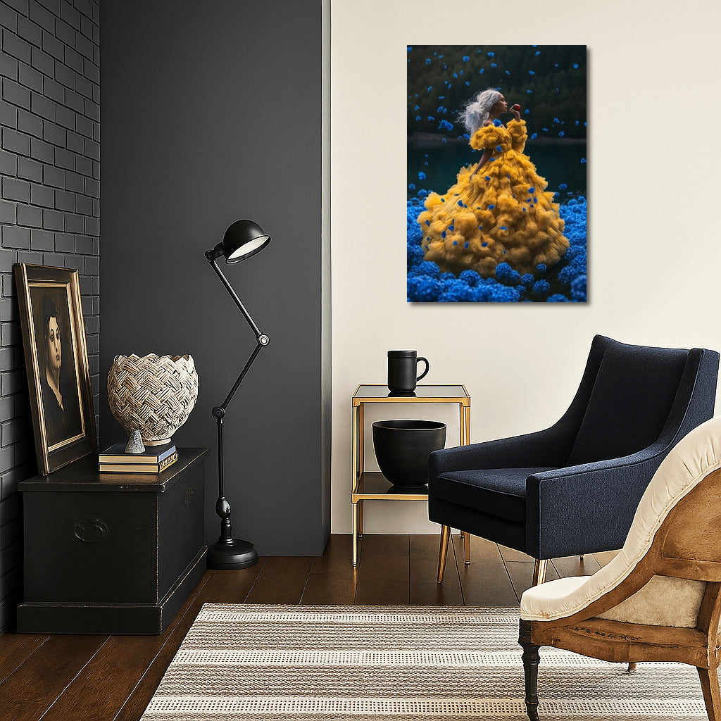 A magical painting: a yellow figure in blue, like from a fairy tale. Wall art that brings dreams and fantasies to life. See more from the collection: Fashion Art