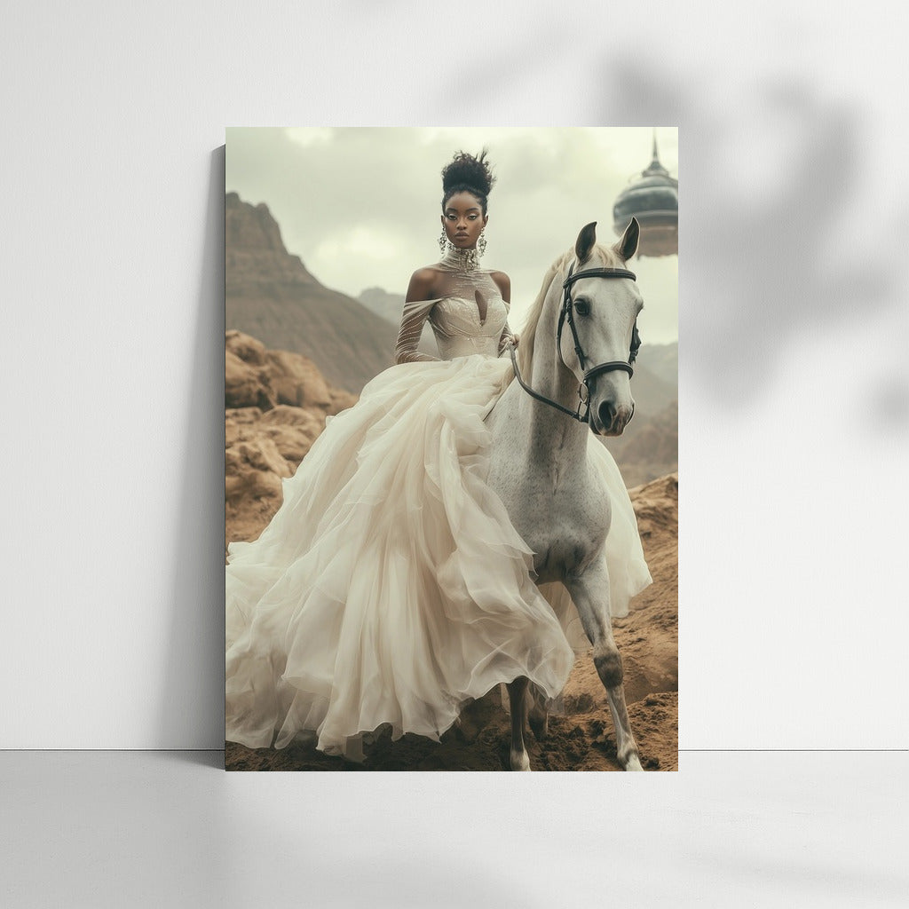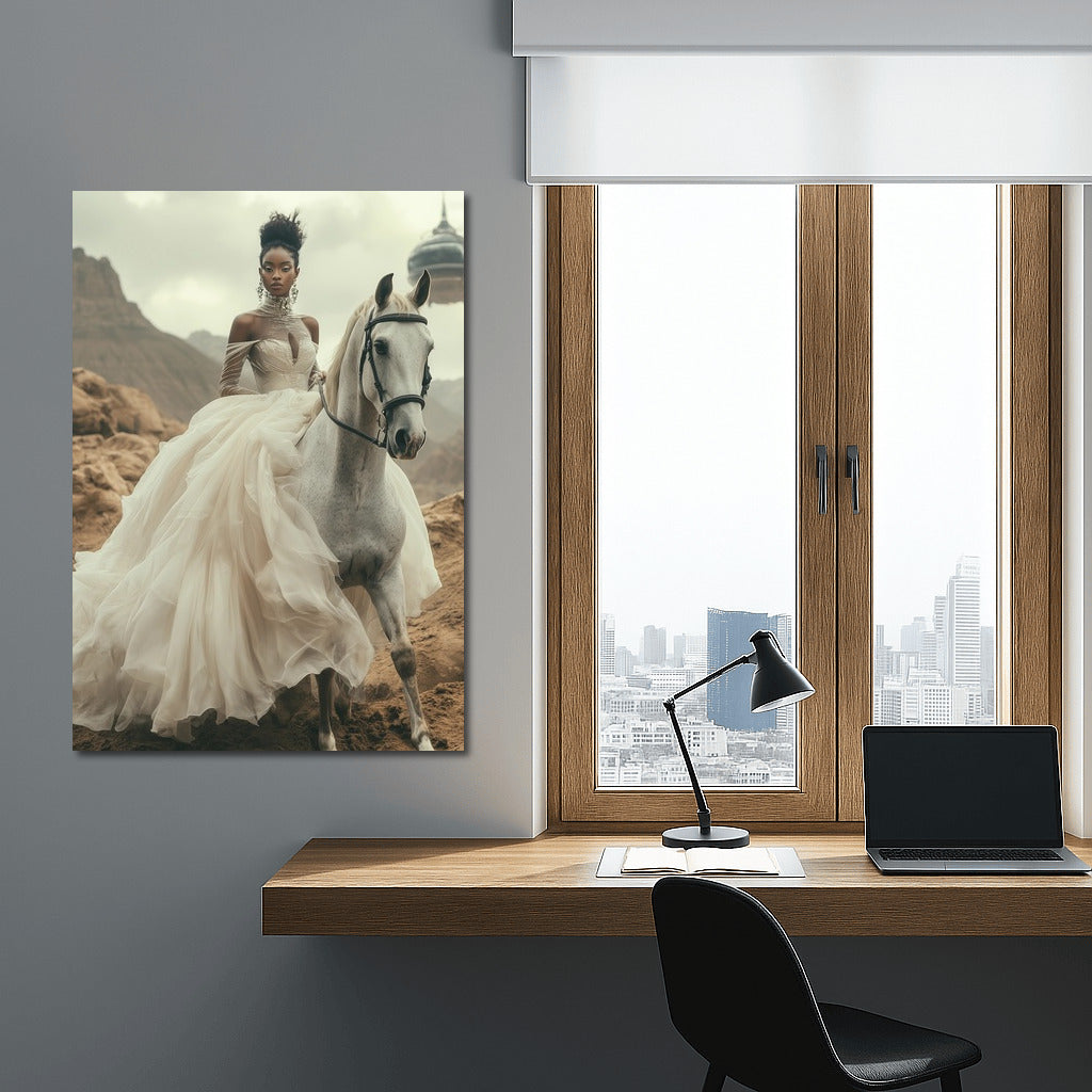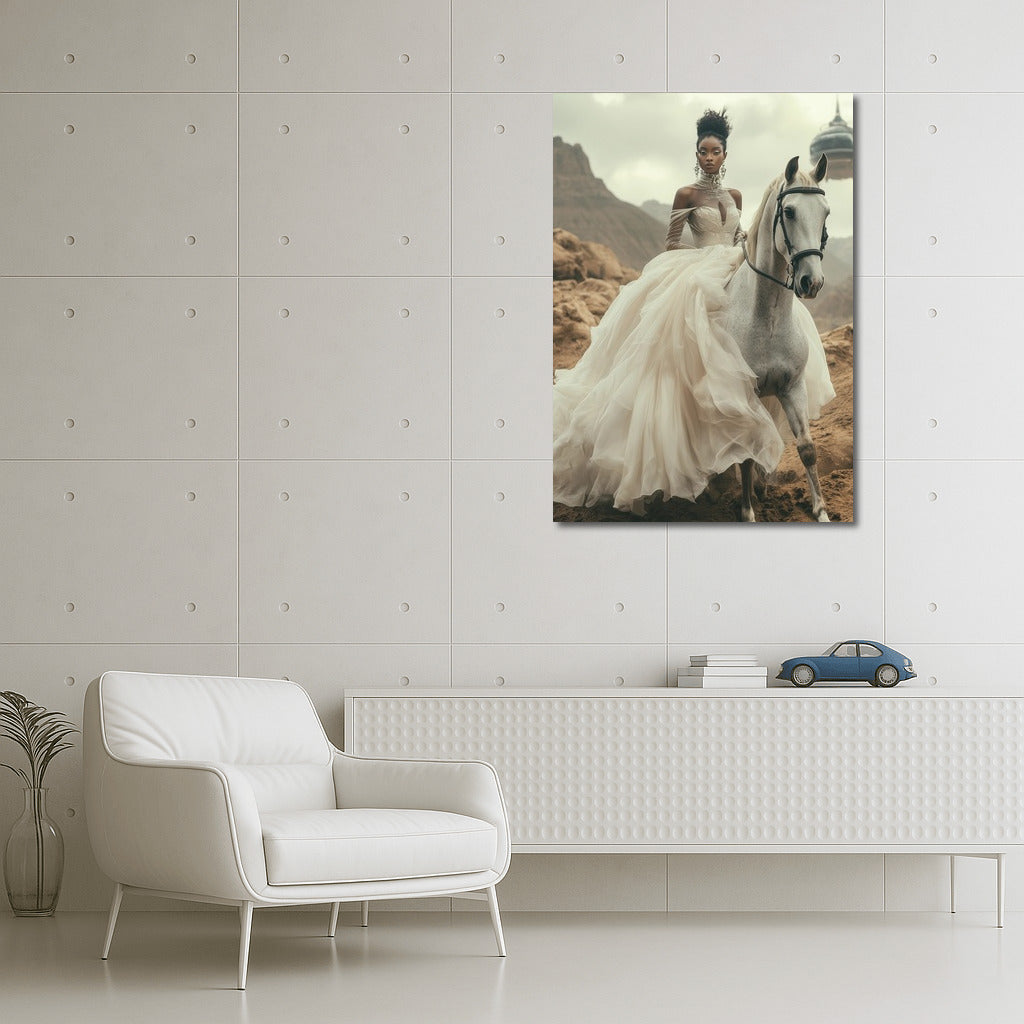 Fantastic painting: a majestic figure on a white horse, traveling through unusual landscapes. Wall art on the edge of reality. See more from the collection: Mixed Wall Art