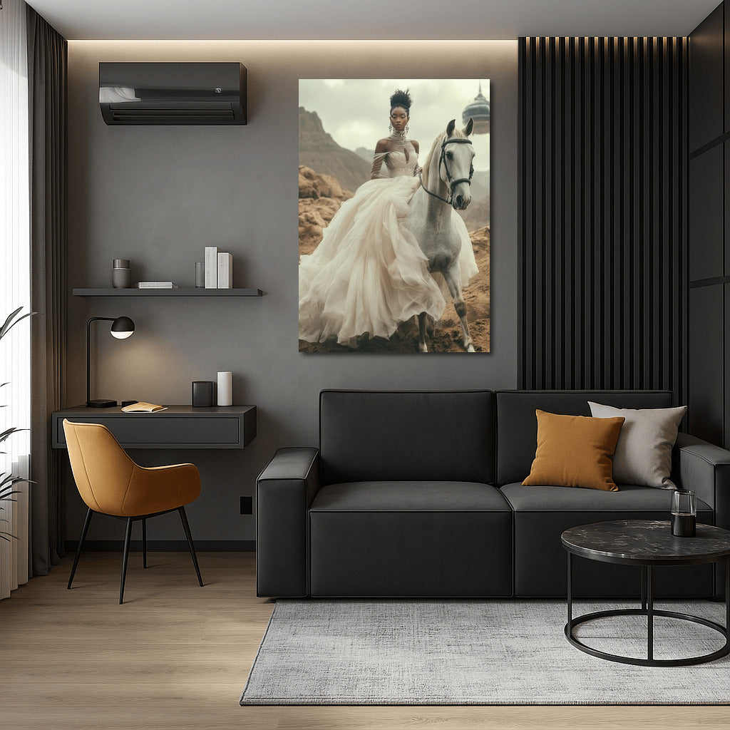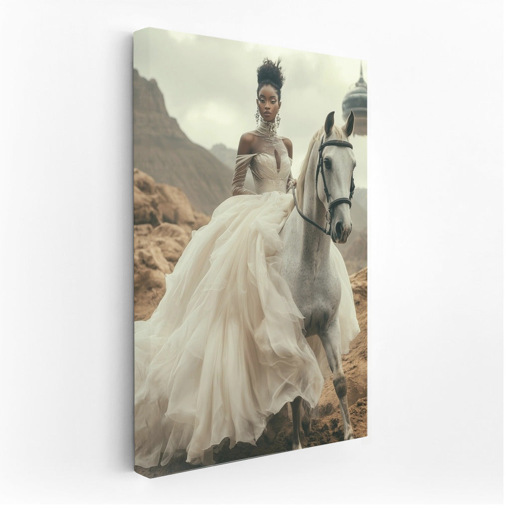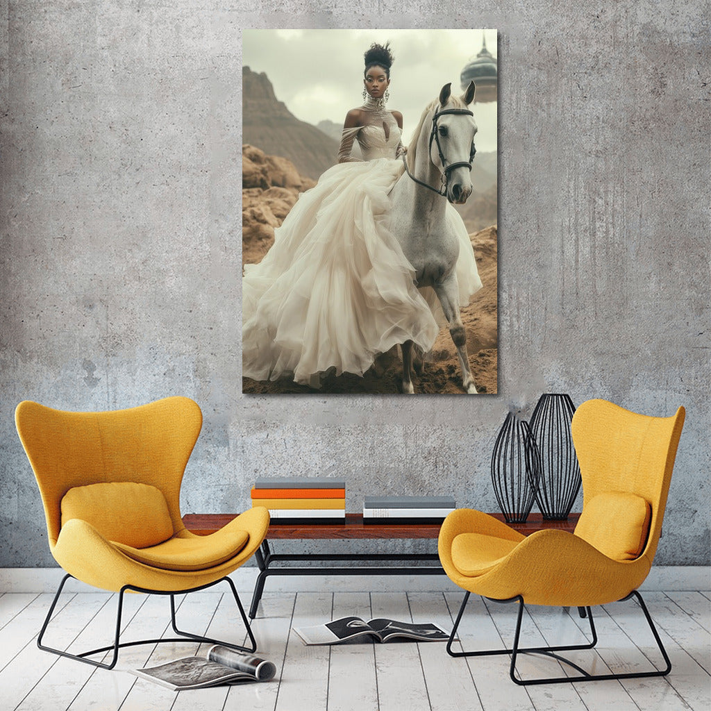 Fantastic painting: a majestic figure on a white horse, traveling through unusual landscapes. Wall art on the edge of reality. See more from the collection: Mixed Wall Art