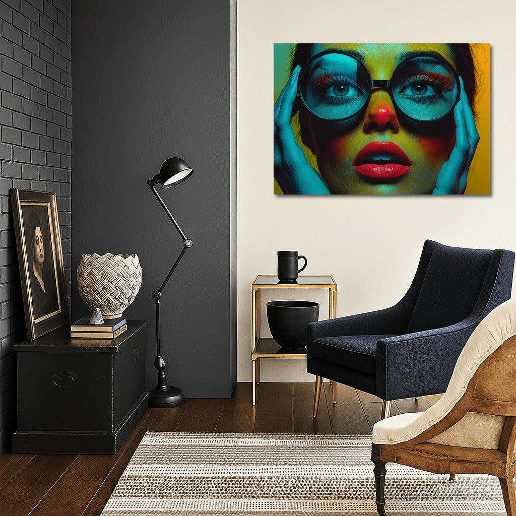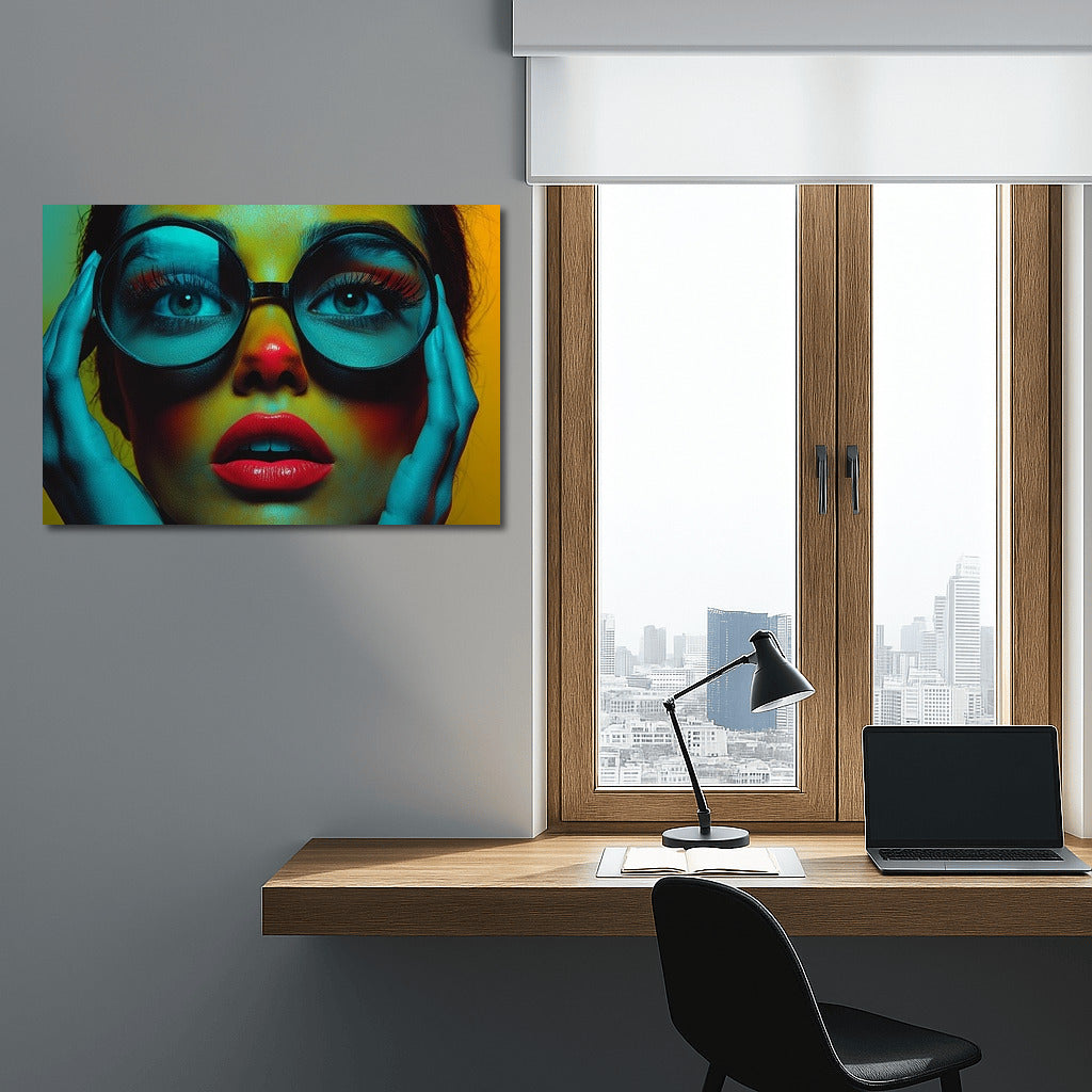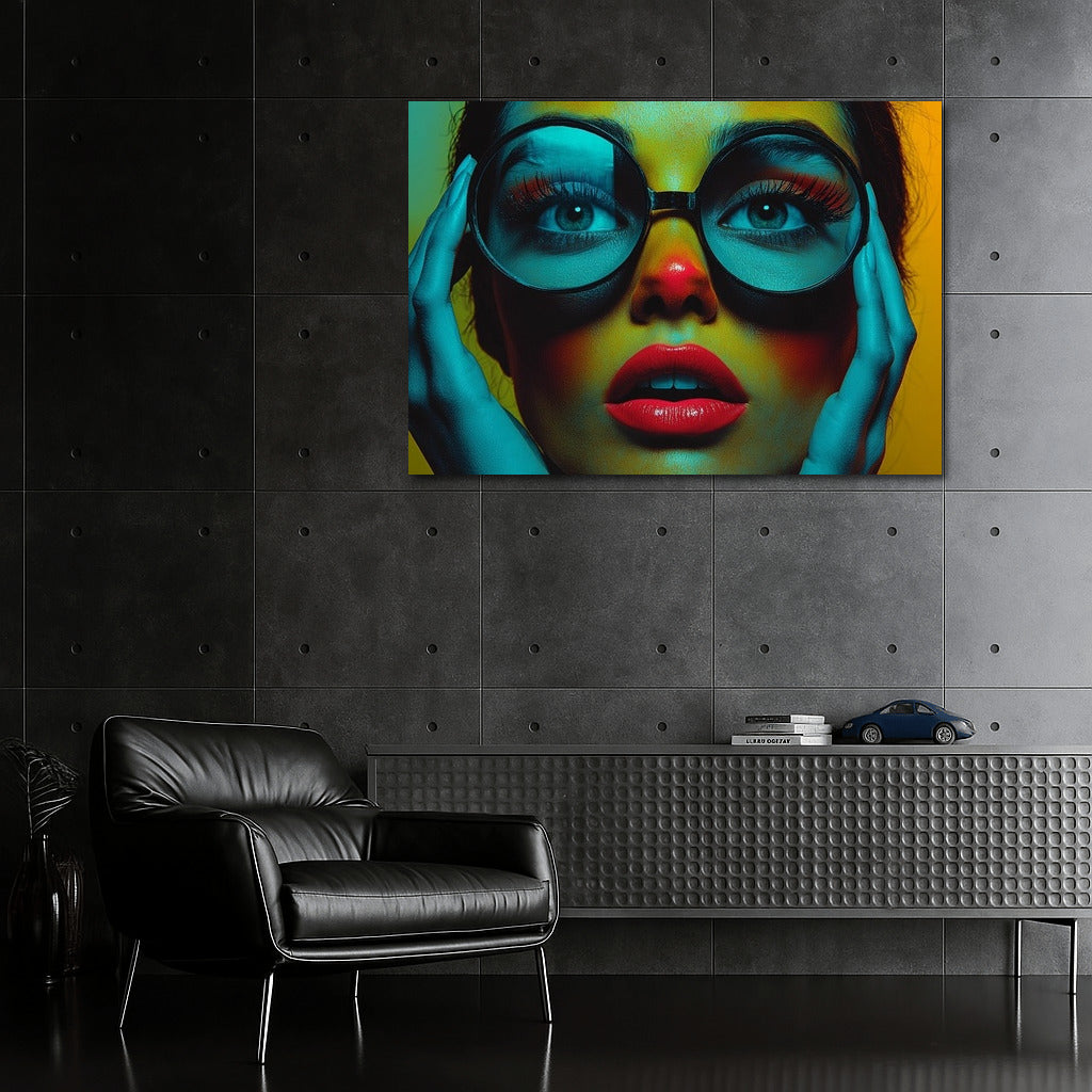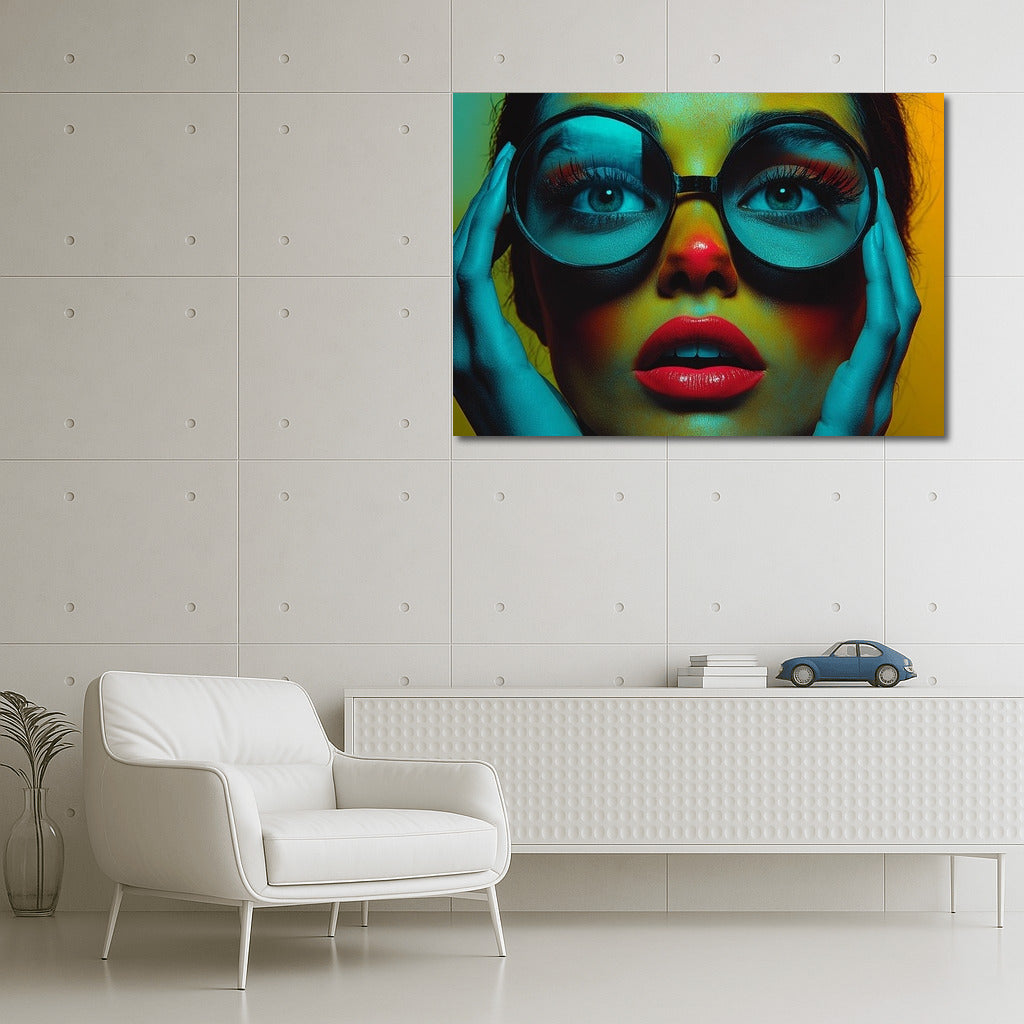 A bright poster with a mysterious look through large glasses. Perfect wall art for lovers of the unusual! See more from the collection: Mixed Wall Art