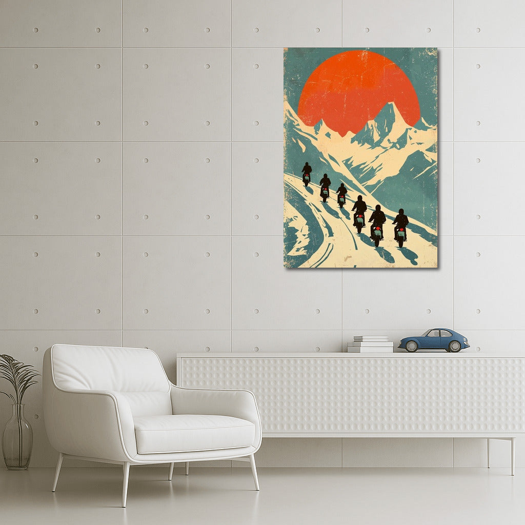 Poster with motorcyclists against the backdrop of mountains and a big sun. Inspiration and freedom on the walls of your home! Dream wall art. See more from the collection: Mixed Wall Art