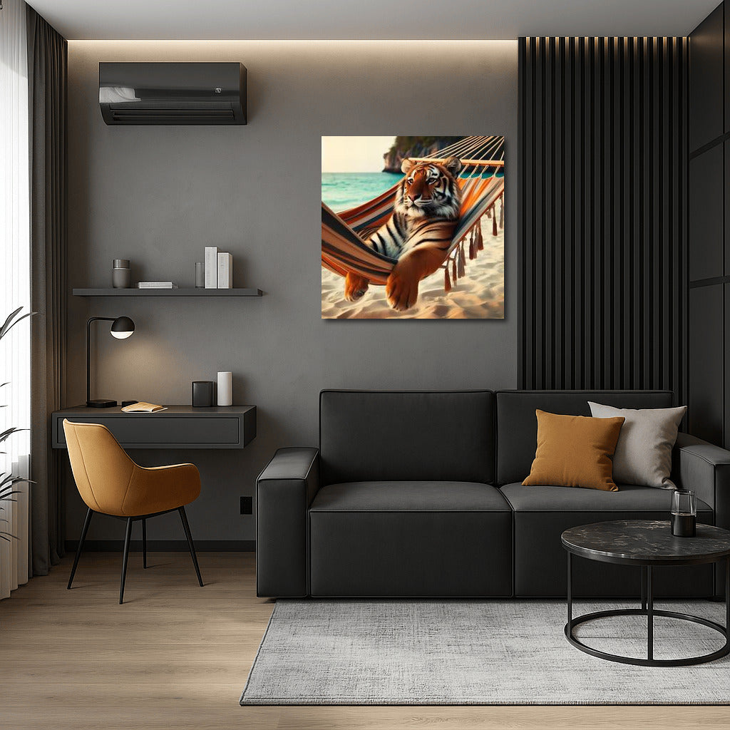 Tiger in a Hammock on the Beach: Exotic Relaxation Wall Art