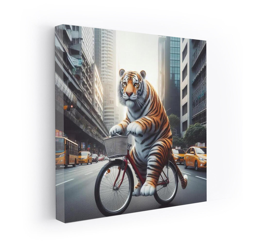 In a world where tigers master bicycles, this poster brings life to the city streets! Wall art with wild imagination! See more from the collection: Animals Art