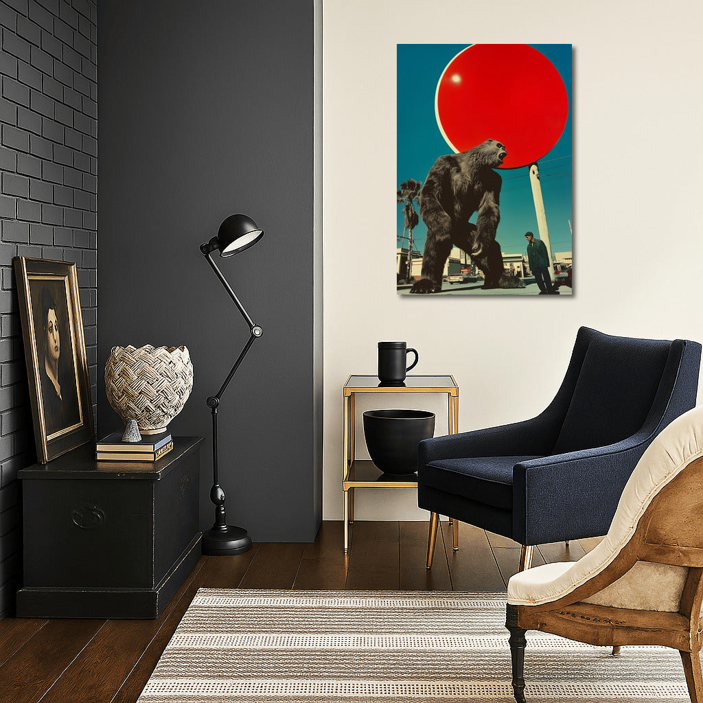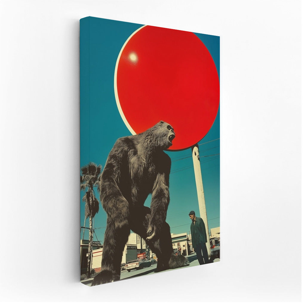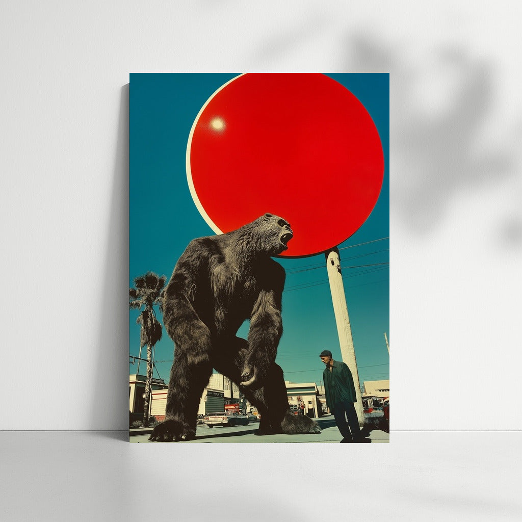 A giant creature and a mysterious figure against a red ball make a bold accent for your wall art. See more from the collection: Surreal Art